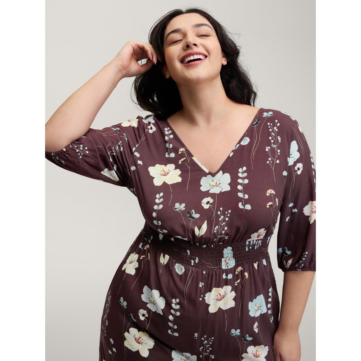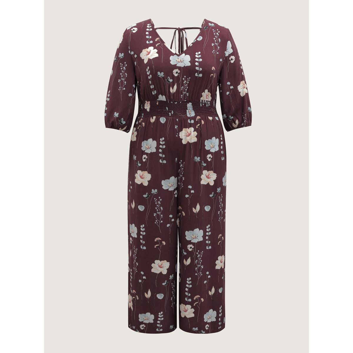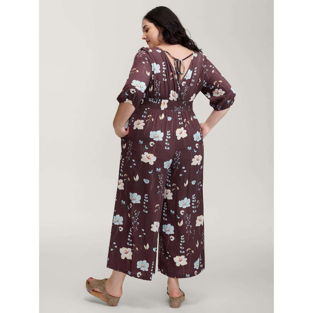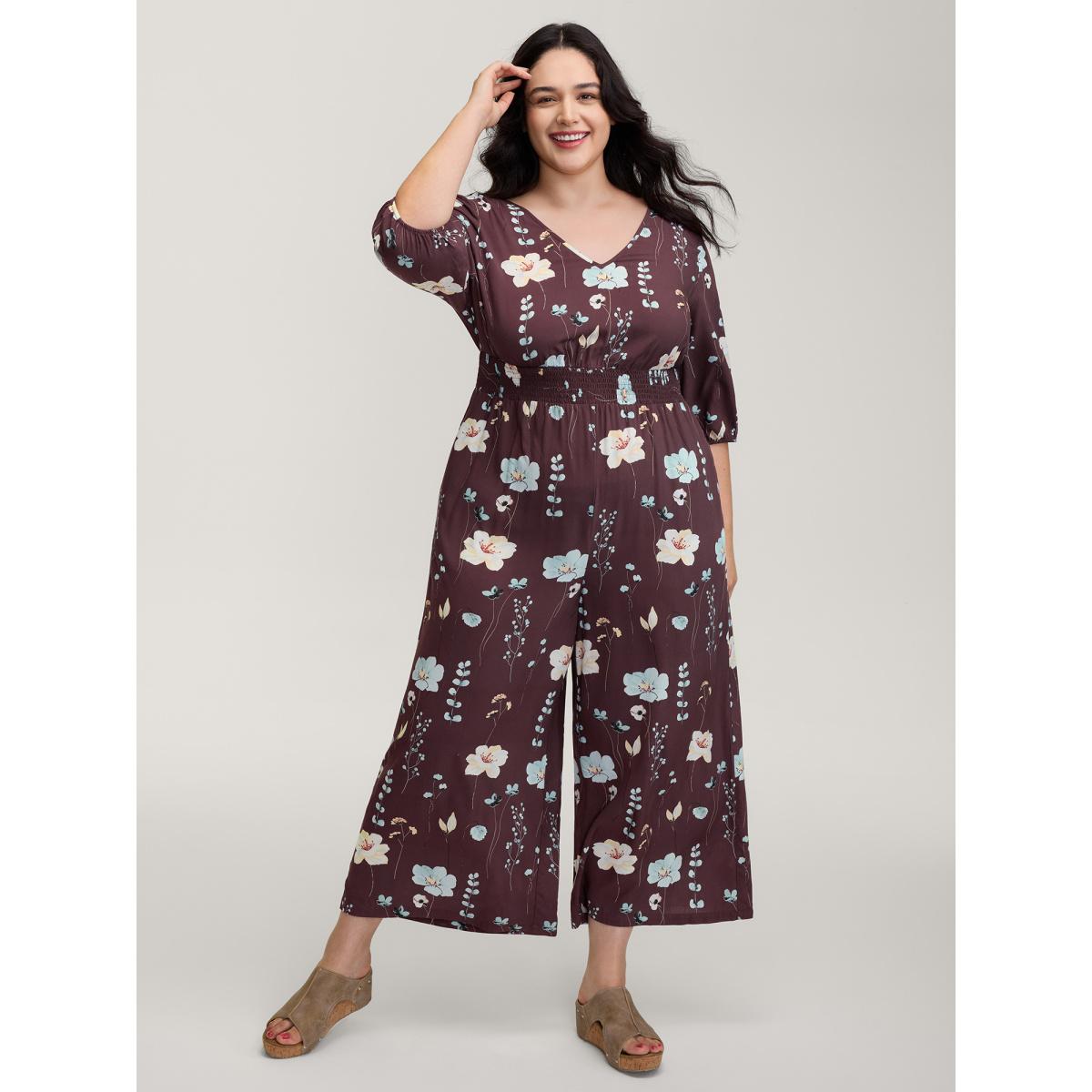 Plus Size Plum Floral Branch Print Shirred Waist Jumpsuit Women Leisure Elbow-length sleeve V-neck Casual Loose Jumpsuits BloomChic 26/4X