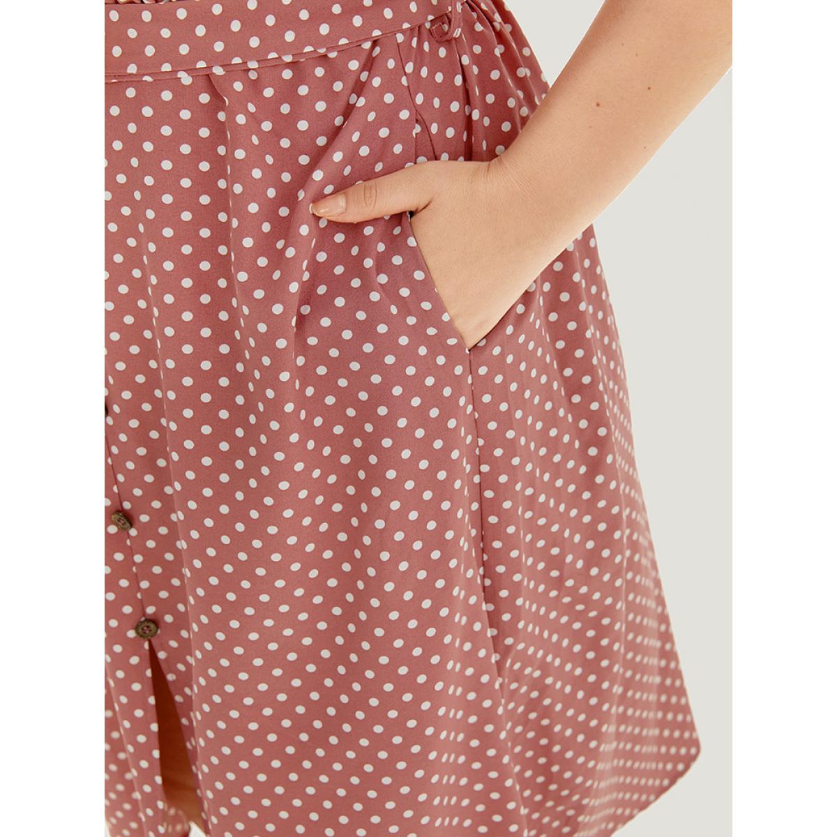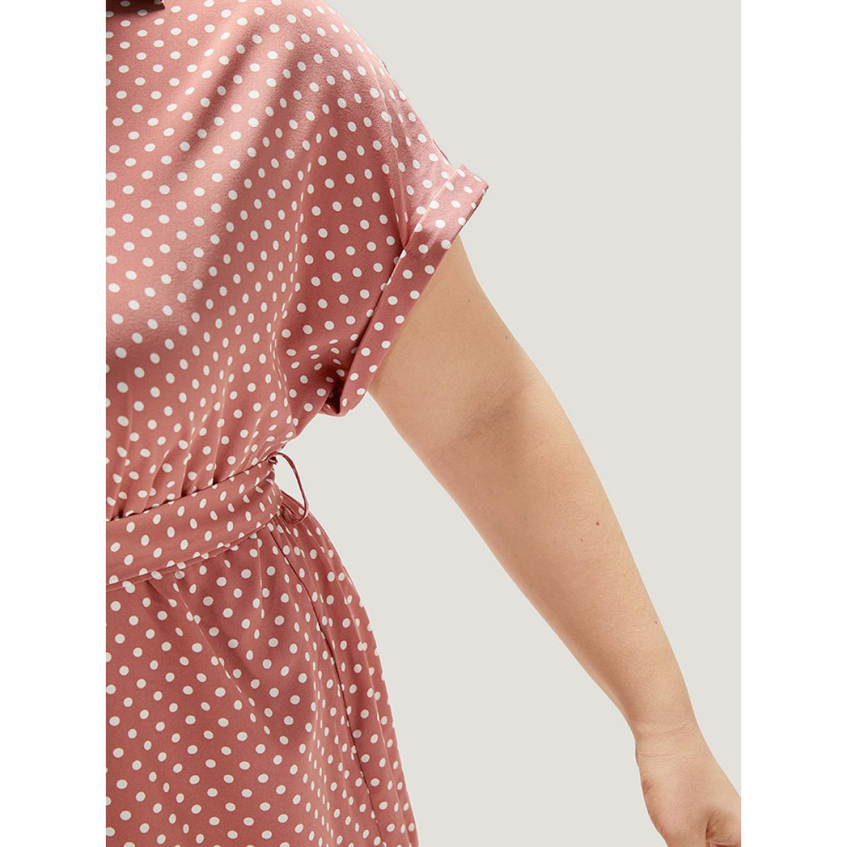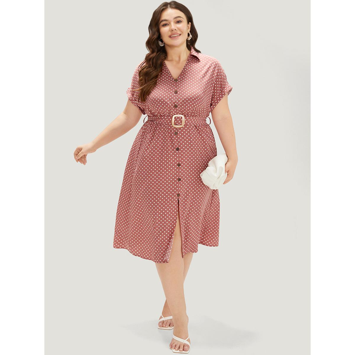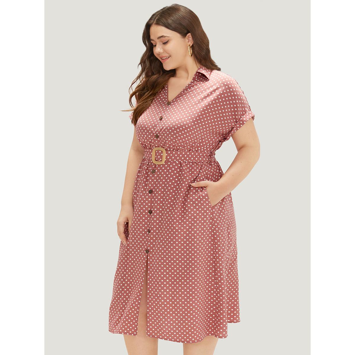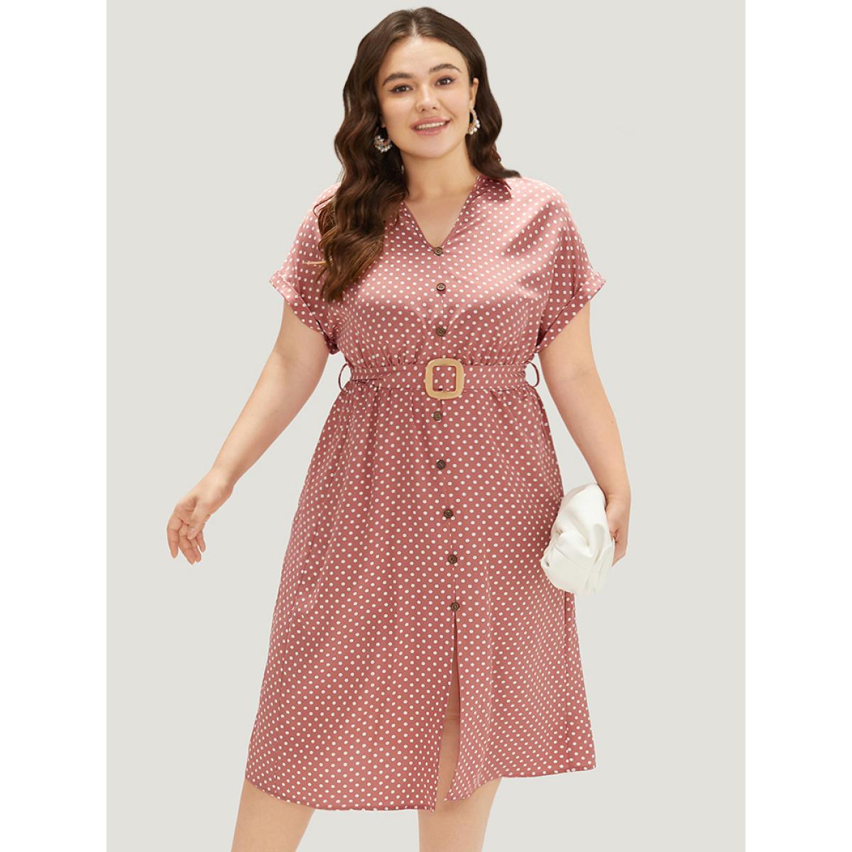 Plus Size Polka Dot Metal Buckle Belt Button Detail Dress DustyPink Women Office Belted V-neck Short sleeve Curvy Midi Dress BloomChic 14-16/1X