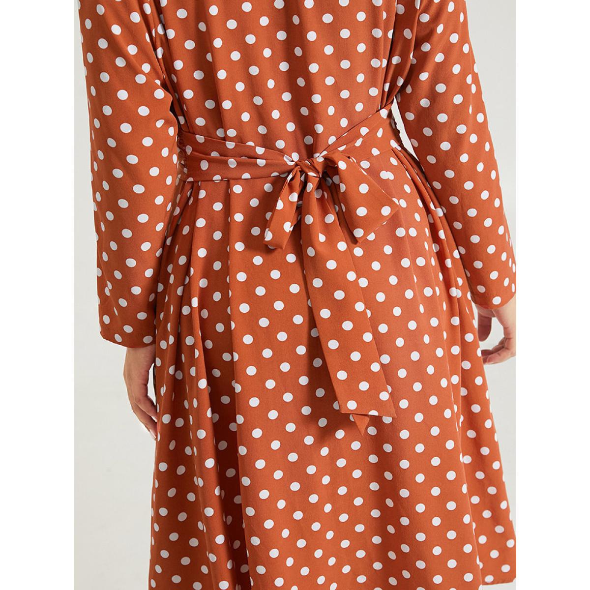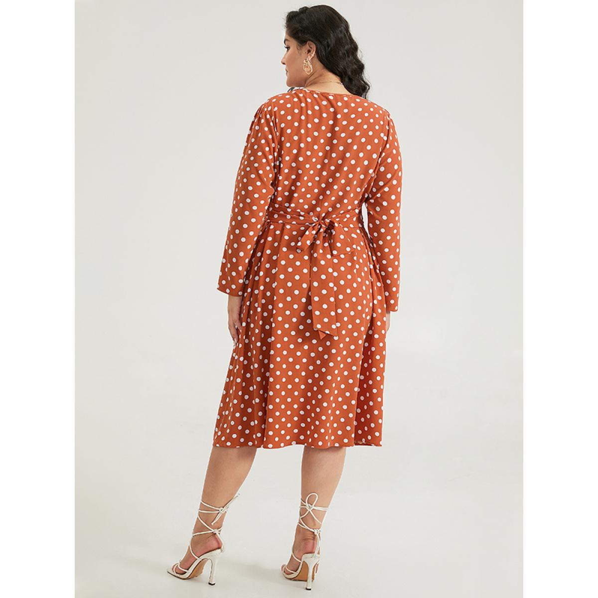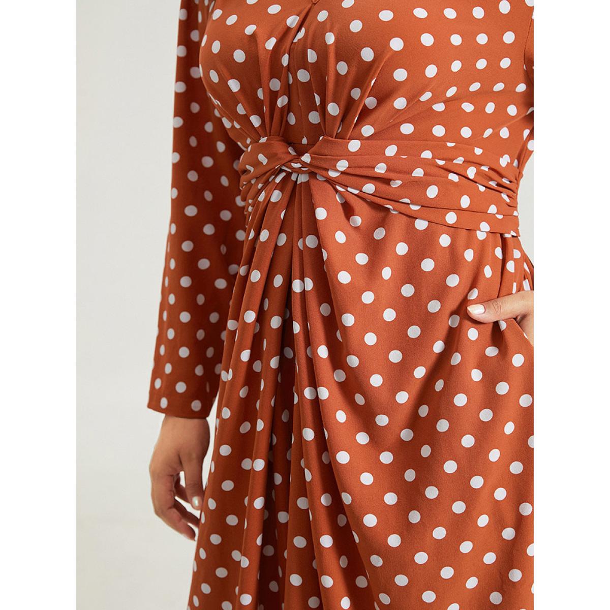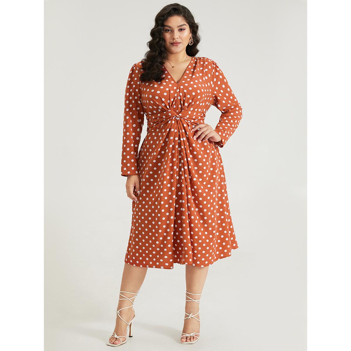 Plus Size Polka Dot Pocket V Neck Twist Front Ties Dress Salmon Women Elegant Cross straps V-neck Long Sleeve Curvy Midi Dress BloomChic 28/5X