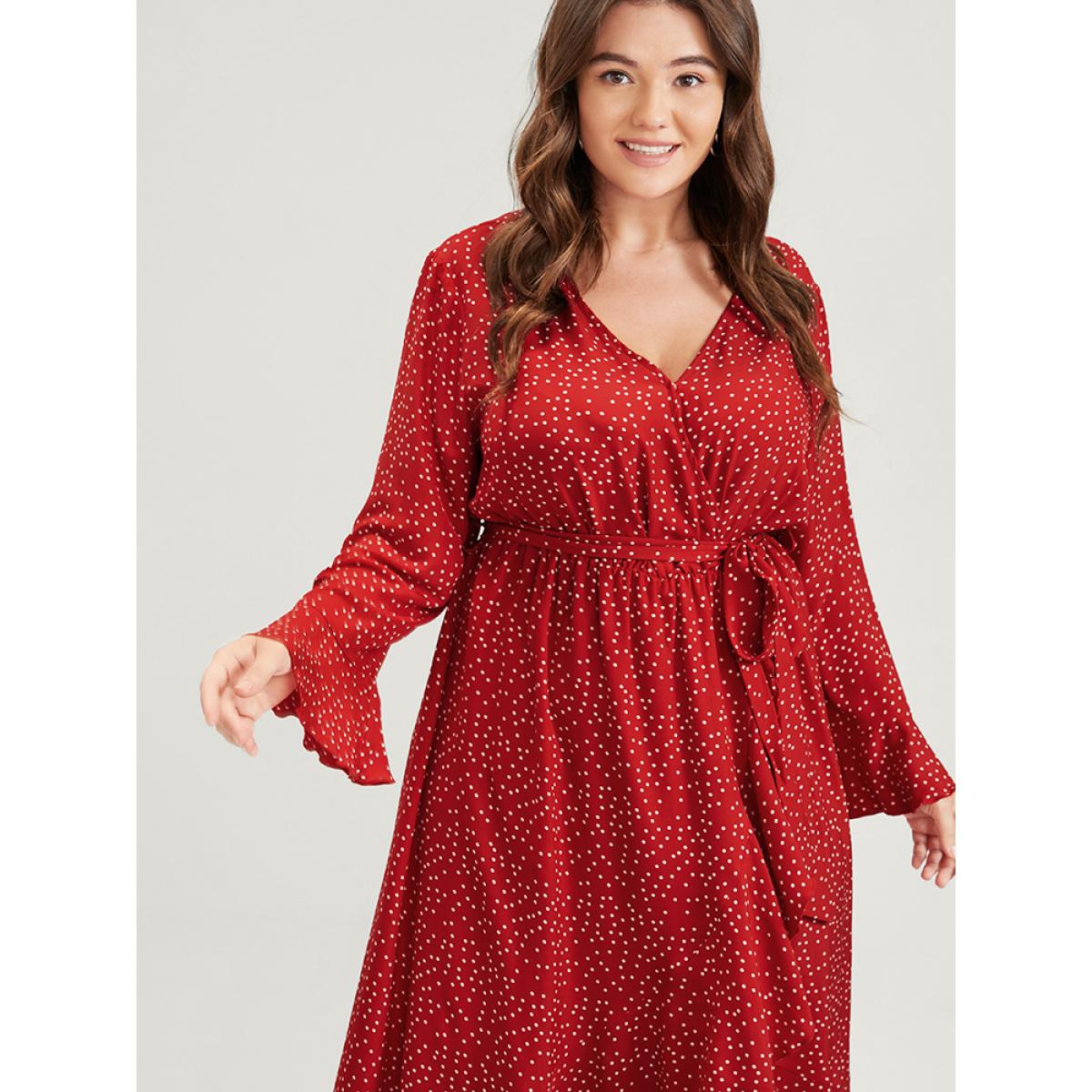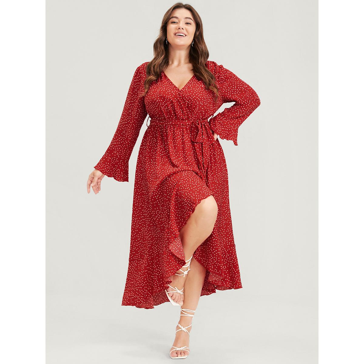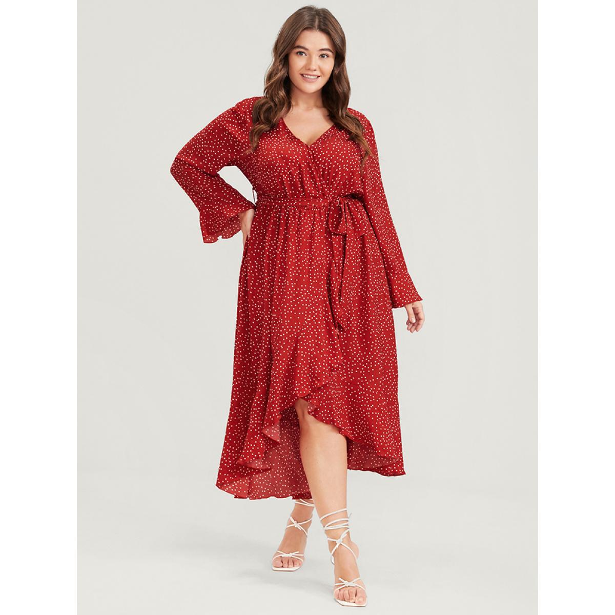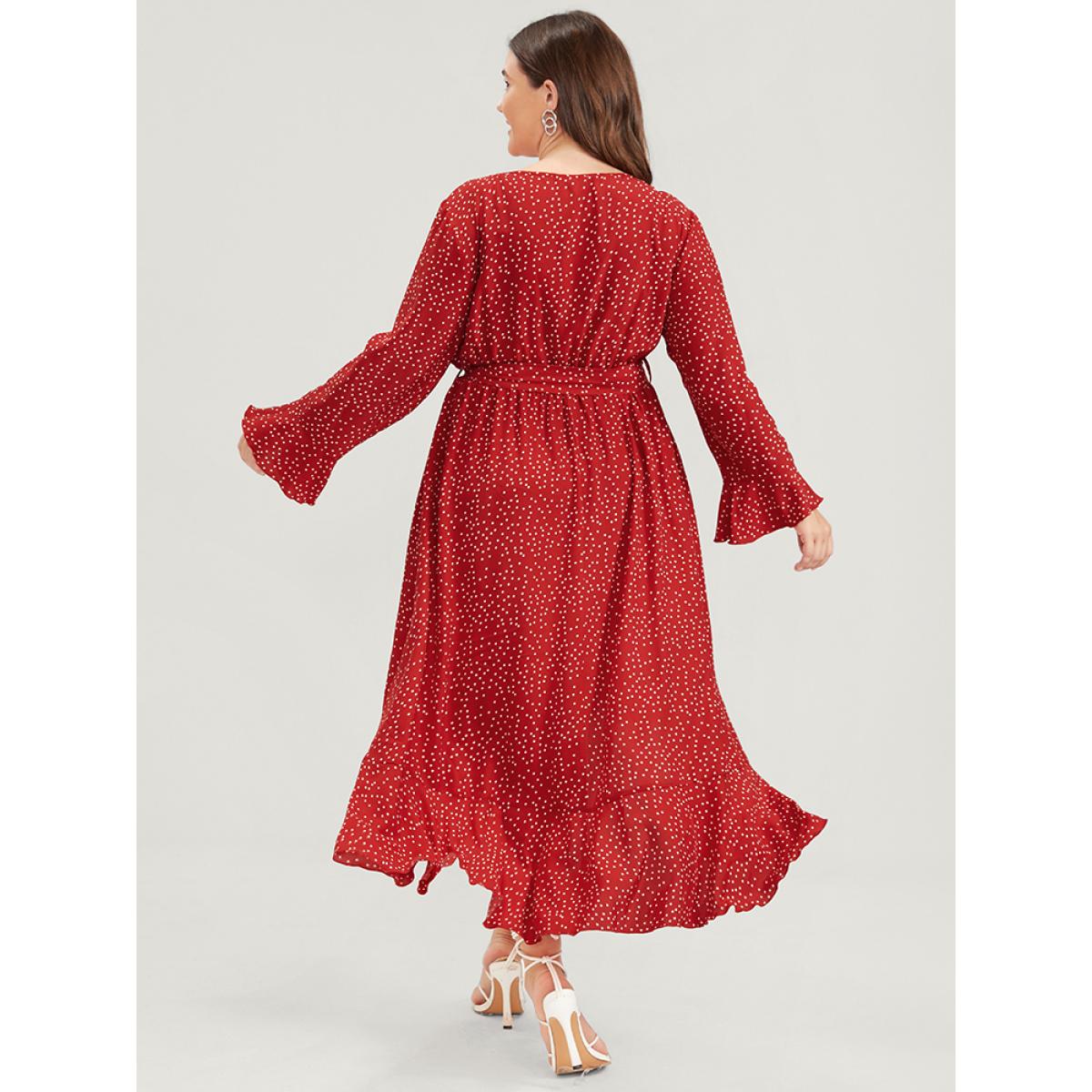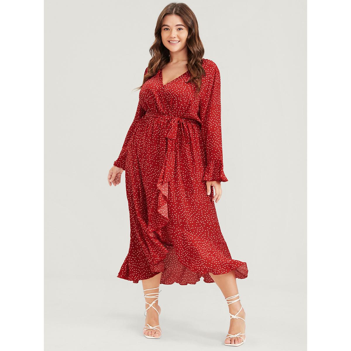 Plus Size Polka Dot Split Wrap Asymmetrical Hem Ruffles Belted Dress Raspberry Women Elegant Belted V-neck Long Sleeve Curvy Long Dress BloomChic 18-20/2X