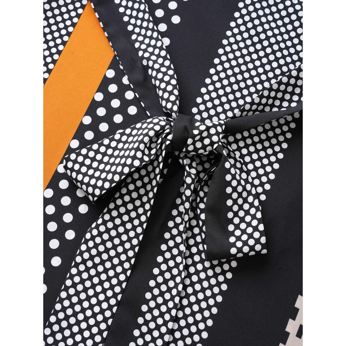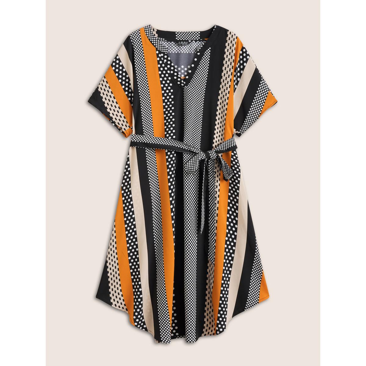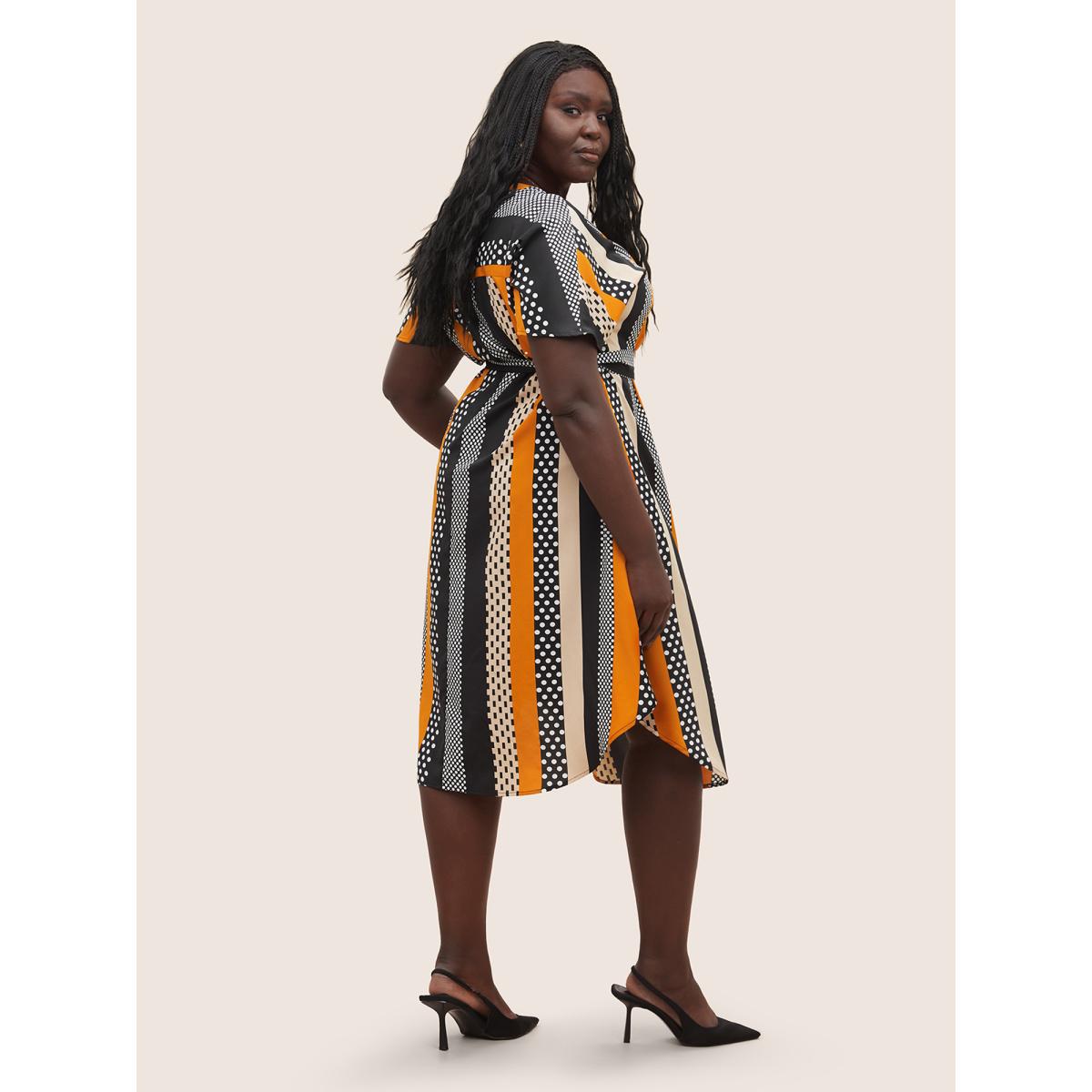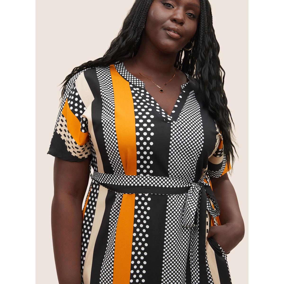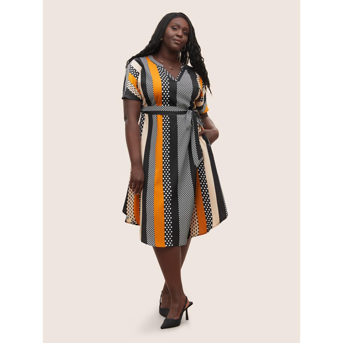 Plus Size Polka Dot & Striped Notched Contrast Belted Dress Black Women Resort Non Notched collar Short sleeve Curvy Midi Dress BloomChic 18-20/2X