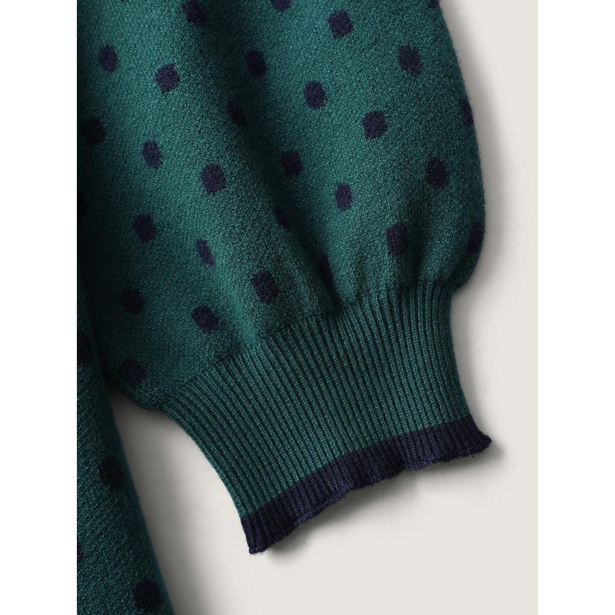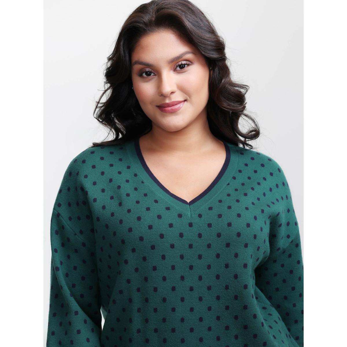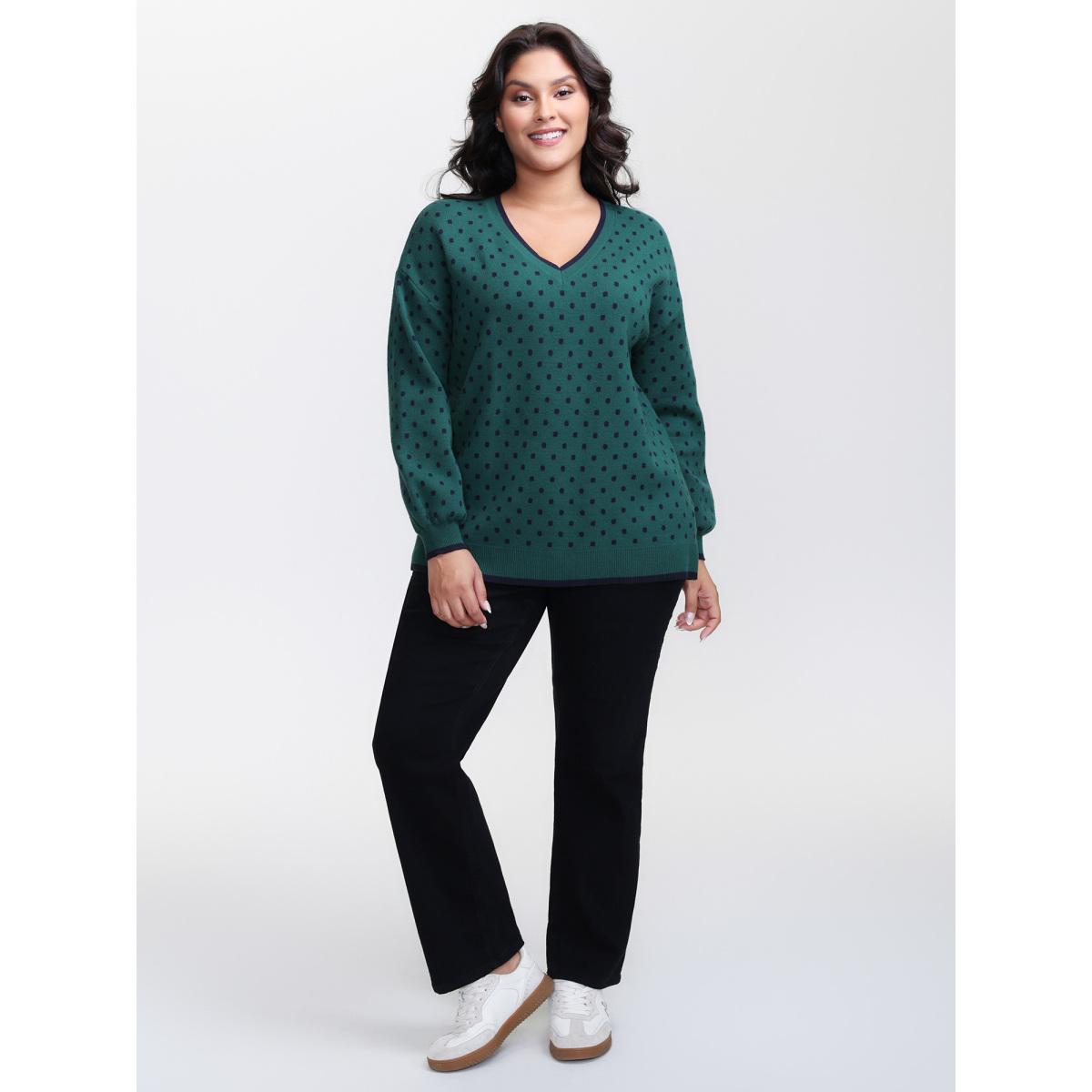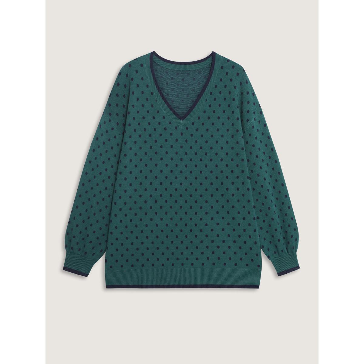 Plus Size Polka Dots Balloon Sleeve Pullover Cyan Women Leisure Loose Long Sleeve V-neck Casual Pullovers BloomChic 12/L Product Image