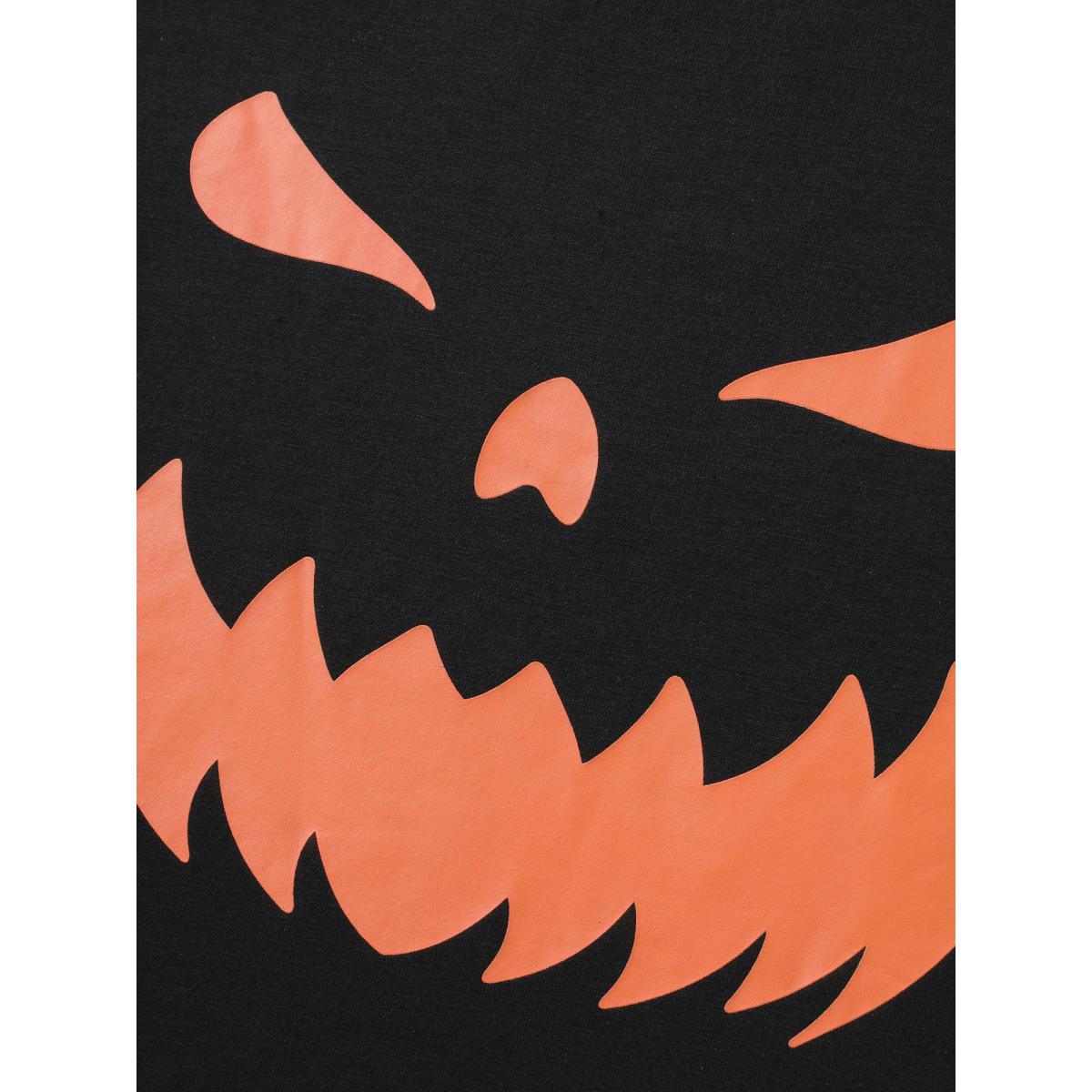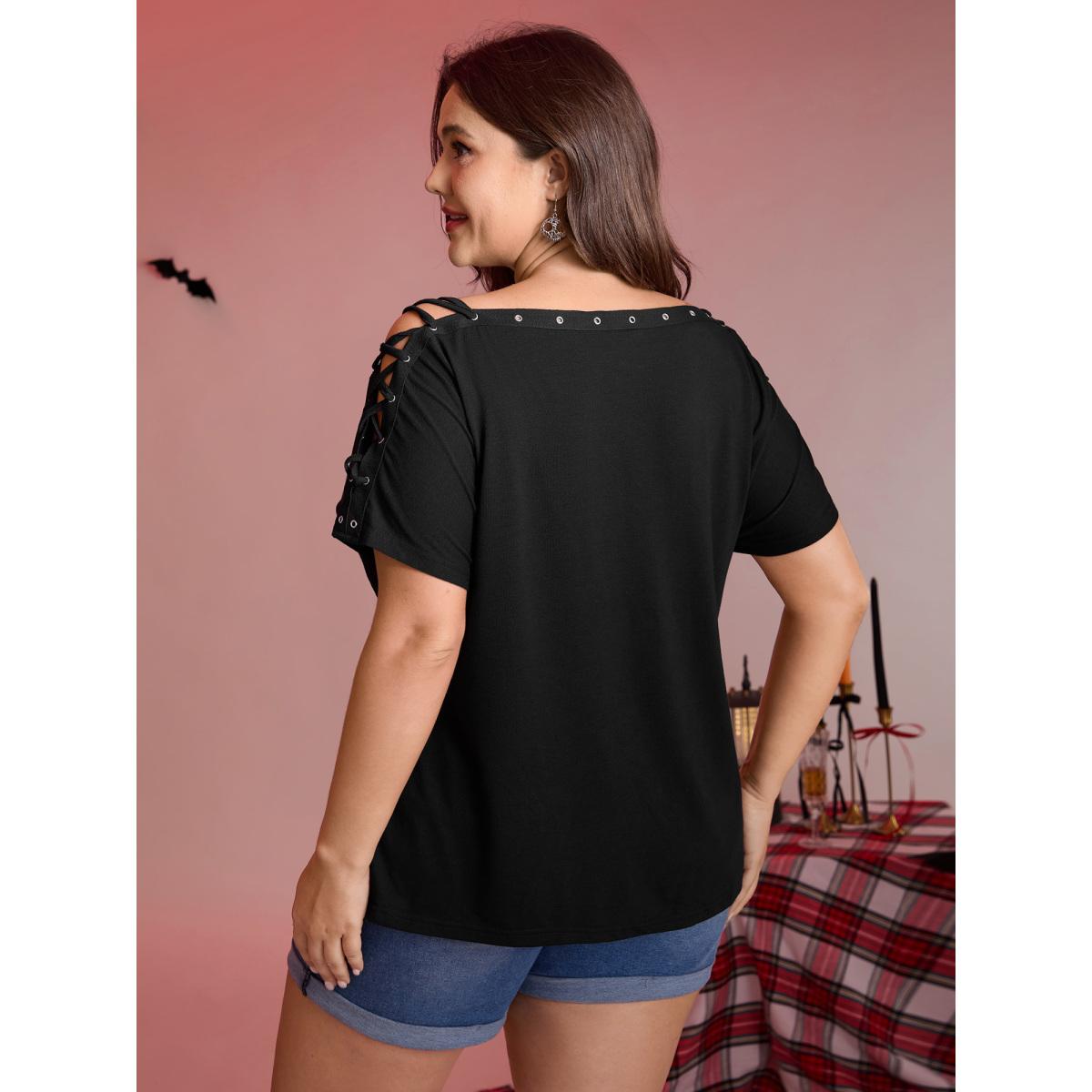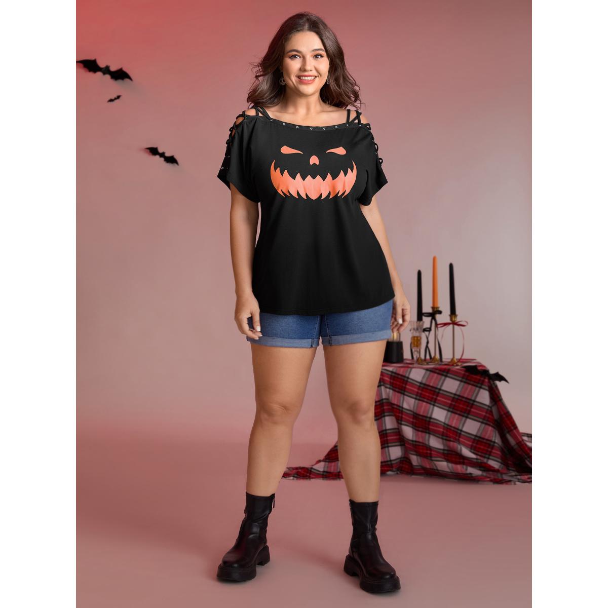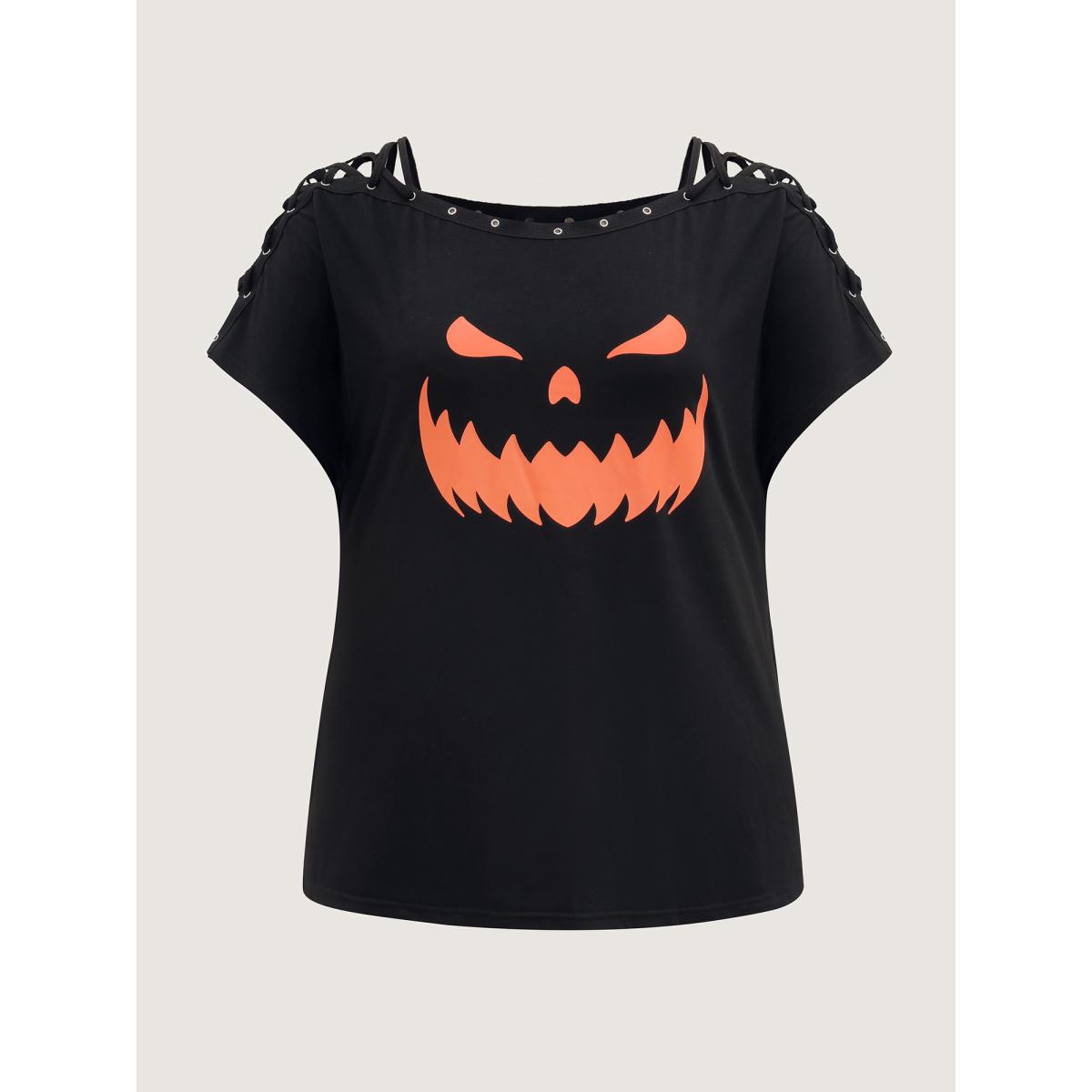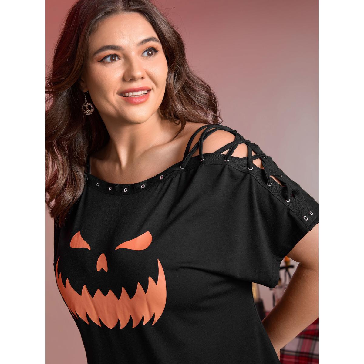 Plus Size Pumpkin Motif Strap Loop Shoulder T-Shirt Black Women Leisure Ribbon Graphic-Halloween One-shoulder neck Loose Casual T-shirts BloomChic 10/M