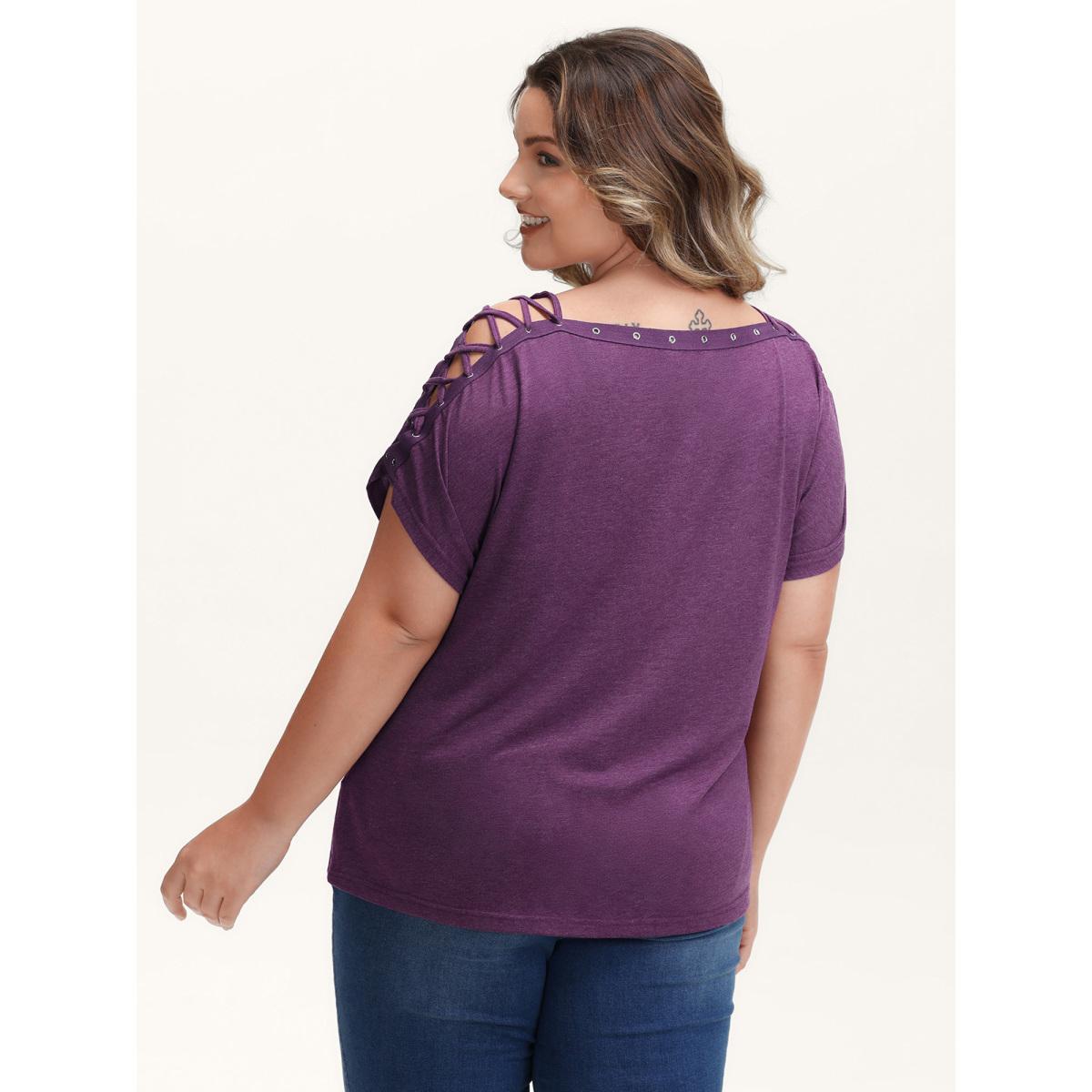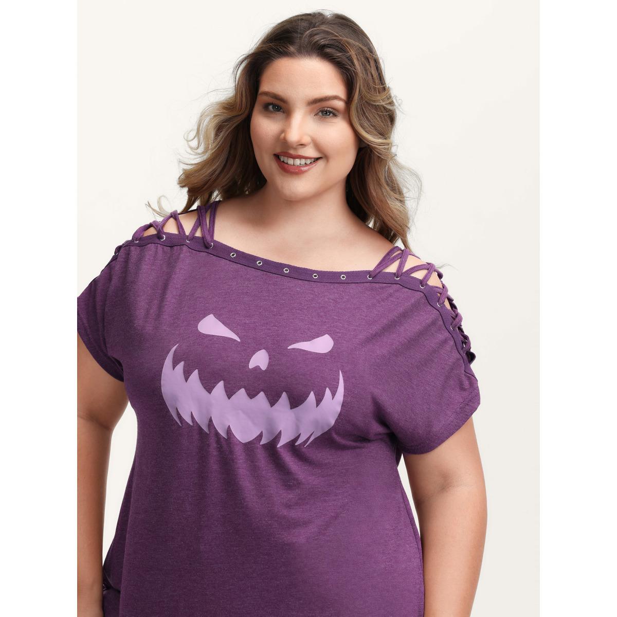 Plus Size Pumpkin Motif Strap Loop Shoulder T-Shirt Deeppurplered Women Leisure Ribbon Graphic-Halloween One-shoulder neck Loose Casual T-shirts BloomChic 26/4X