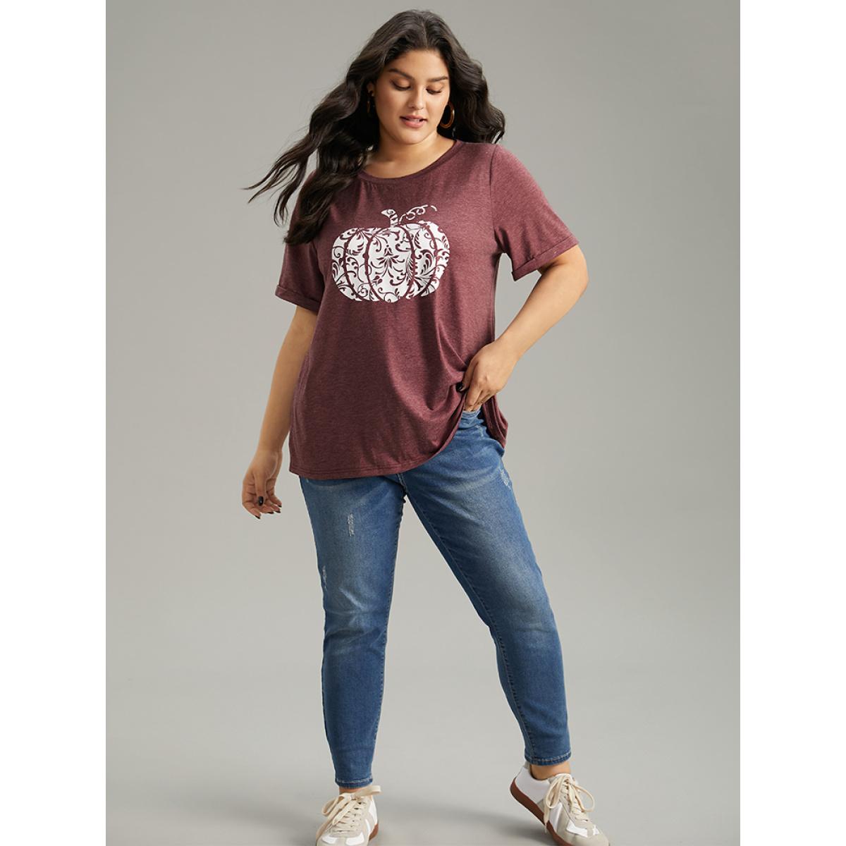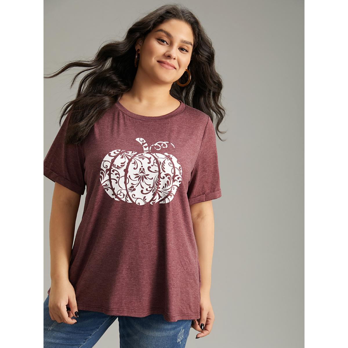 Plus Size Pumpkin Print Round Neck T-shirt Russet Women Casual Printed Art&design Dailywear T-shirts BloomChic 14-16/1X