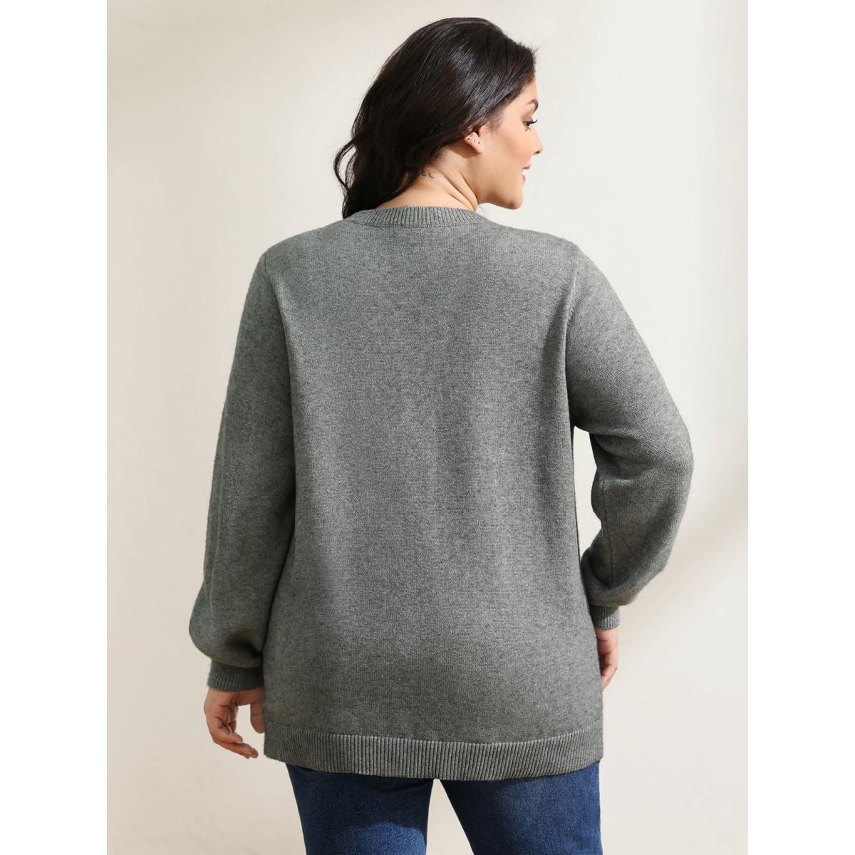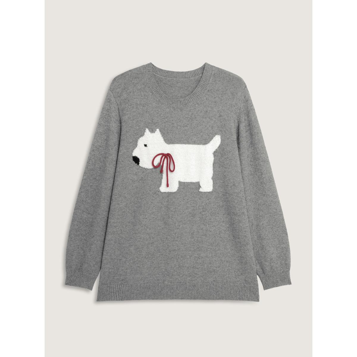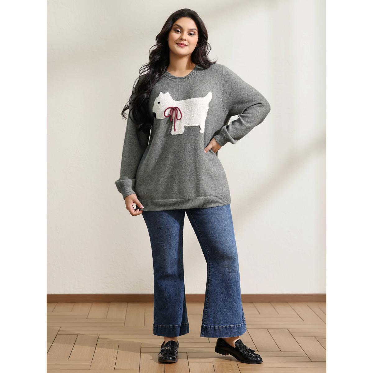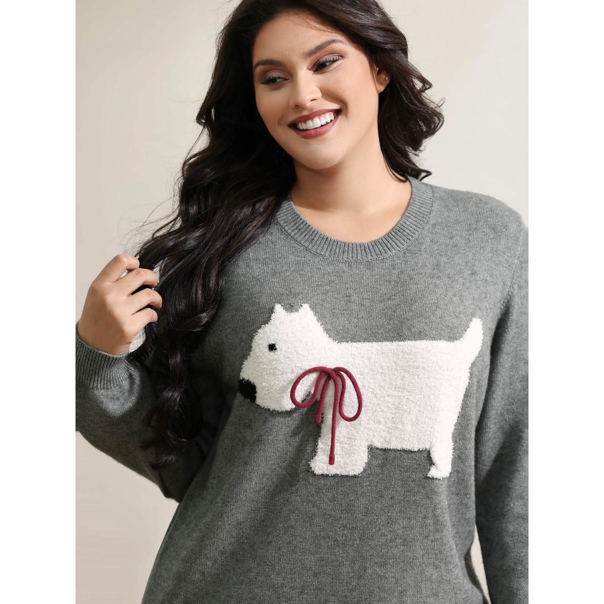 Plus Size Puppy Bowknot Motif Textured Pullover Mediumgray Women Playful Loose Long Sleeve Round Neck Casual Pullovers BloomChic 12/L