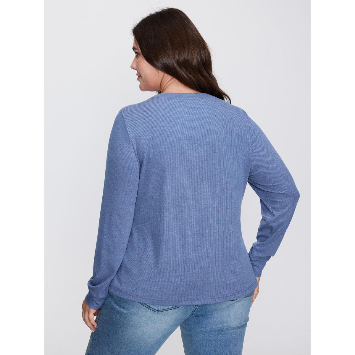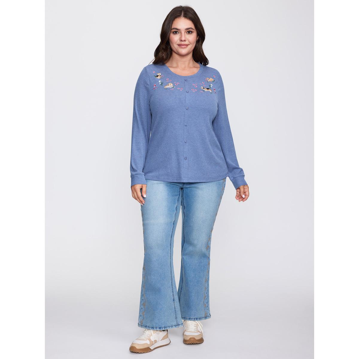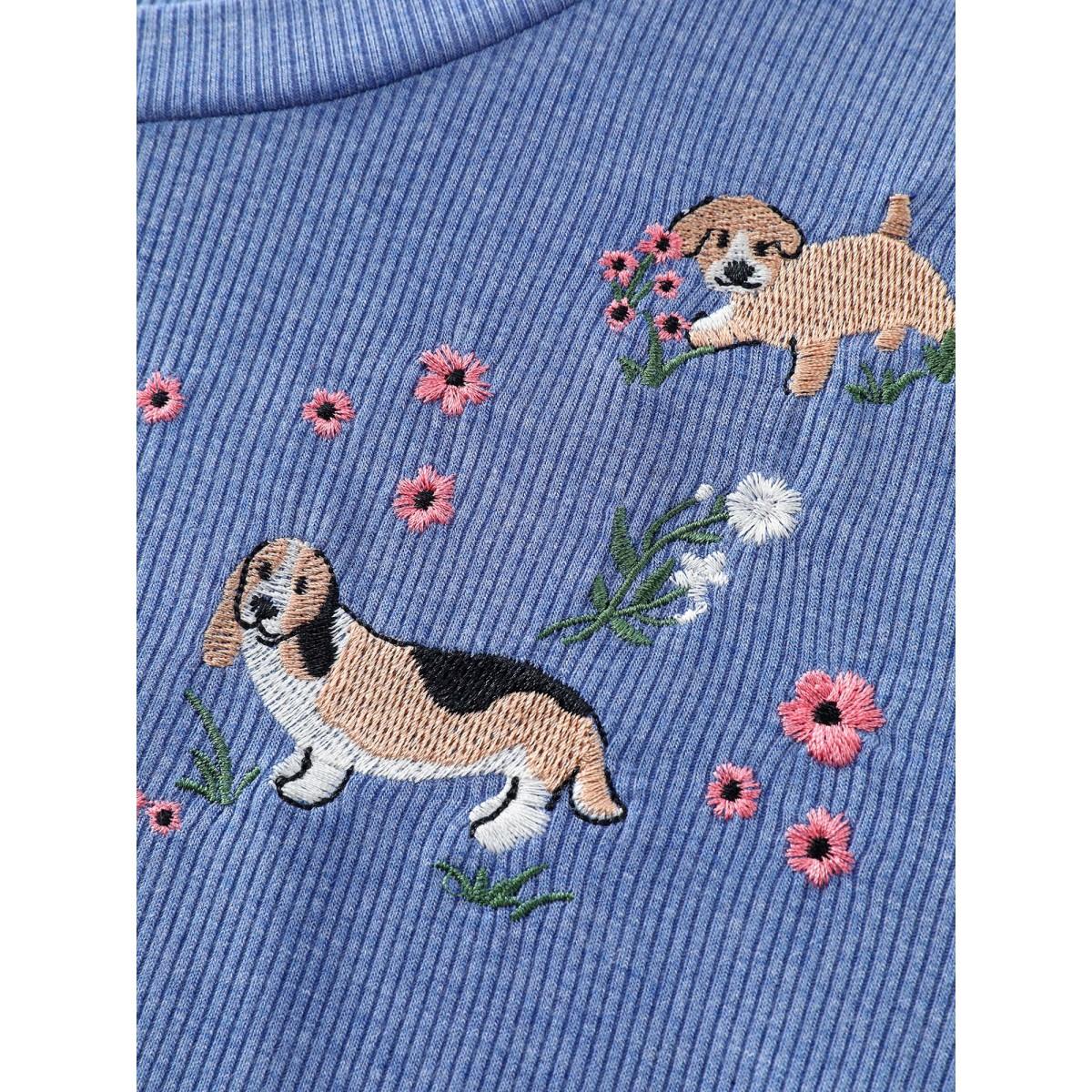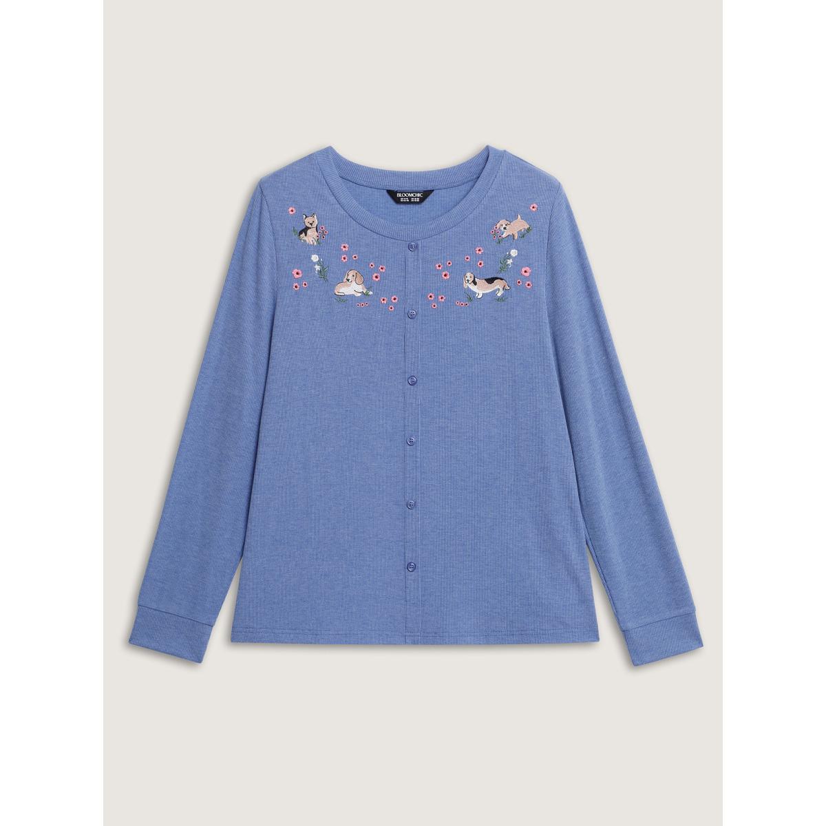 Plus Size Puppy Embroidery Buttons Fitted T-Shirt Cerulean Women Playful Embroidered Animals Round Neck Bodycon Casual T-shirts BloomChic 22-24/3X