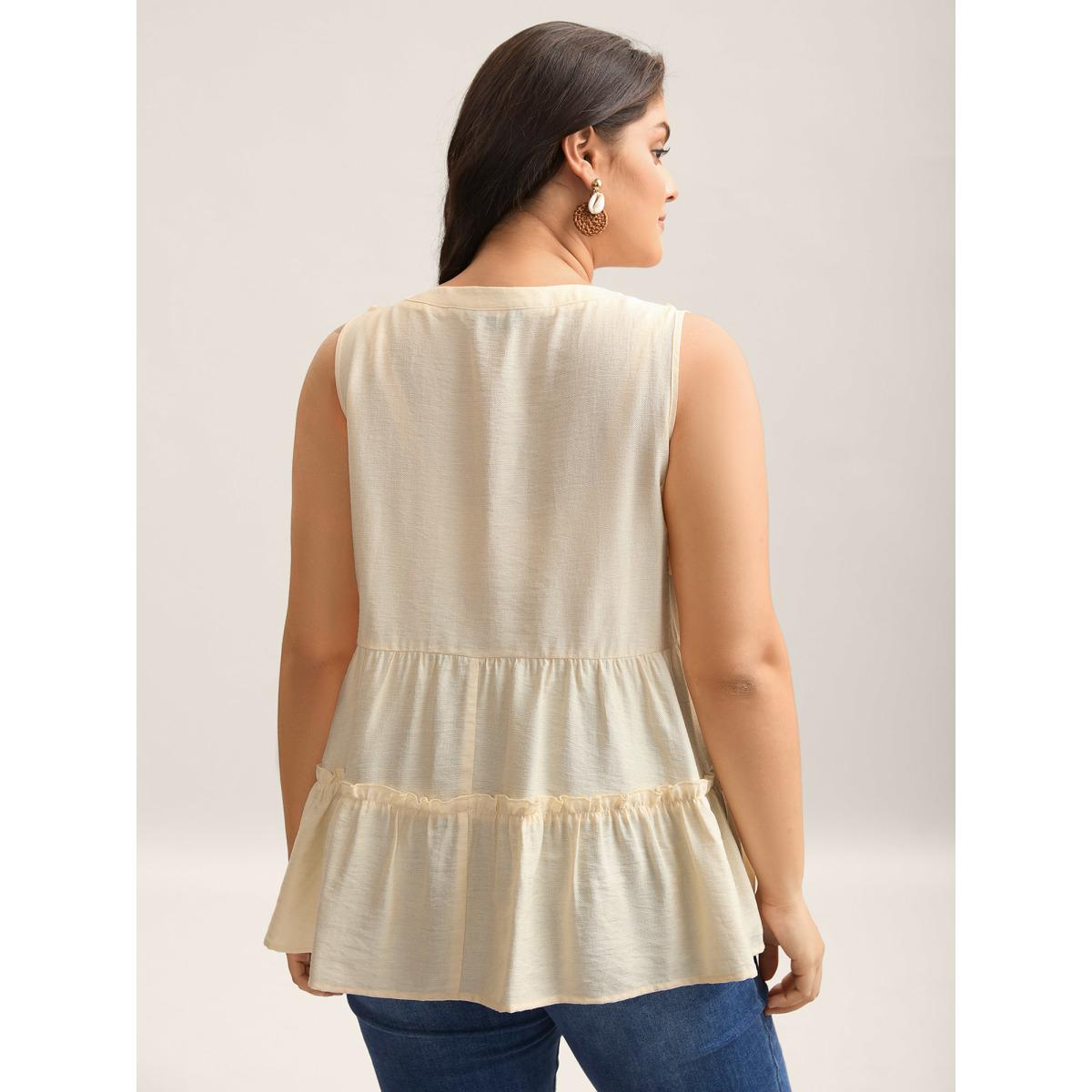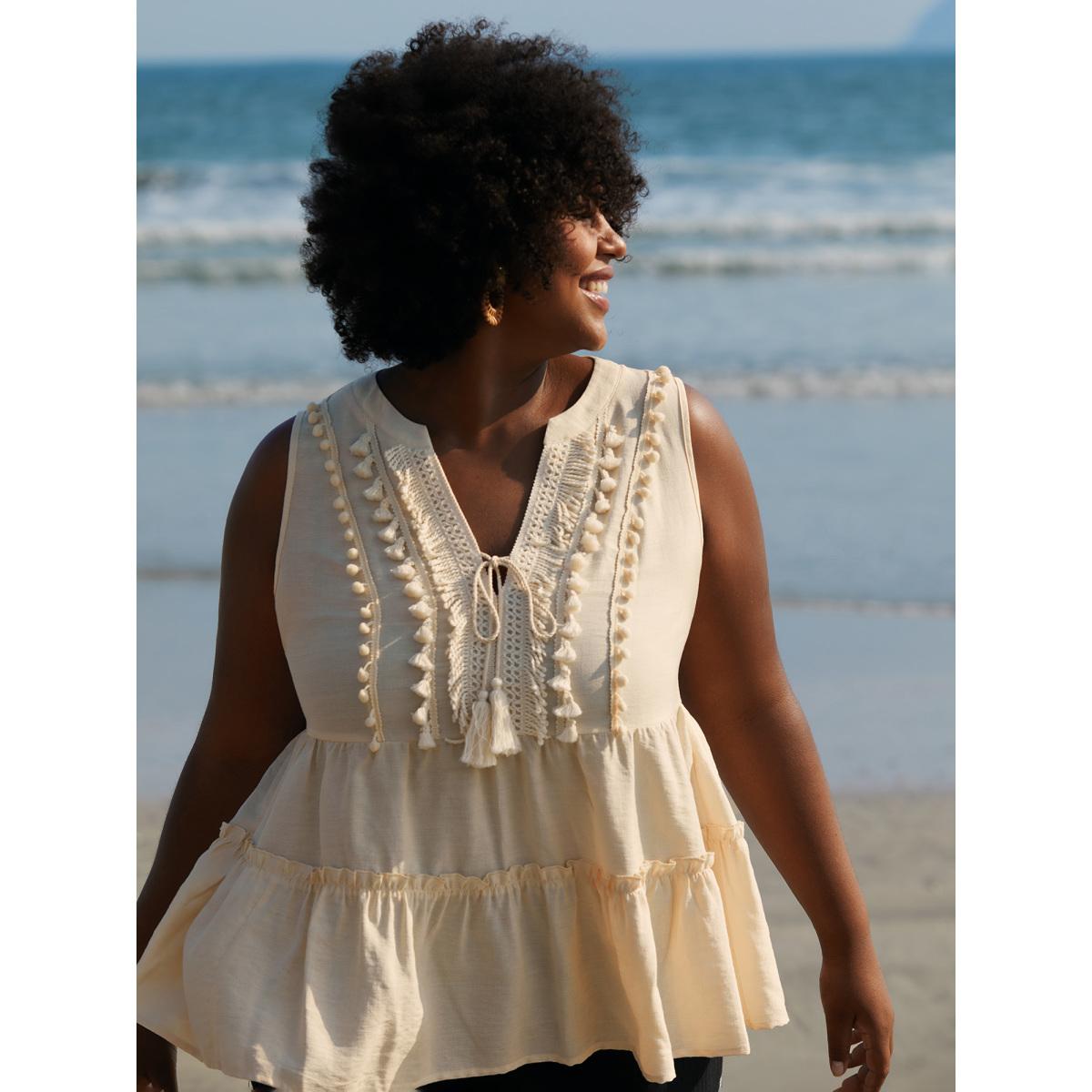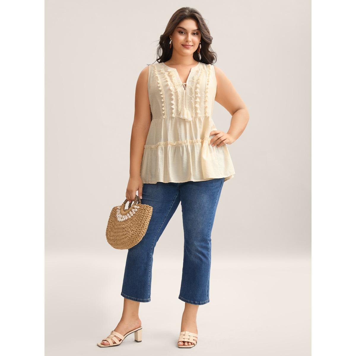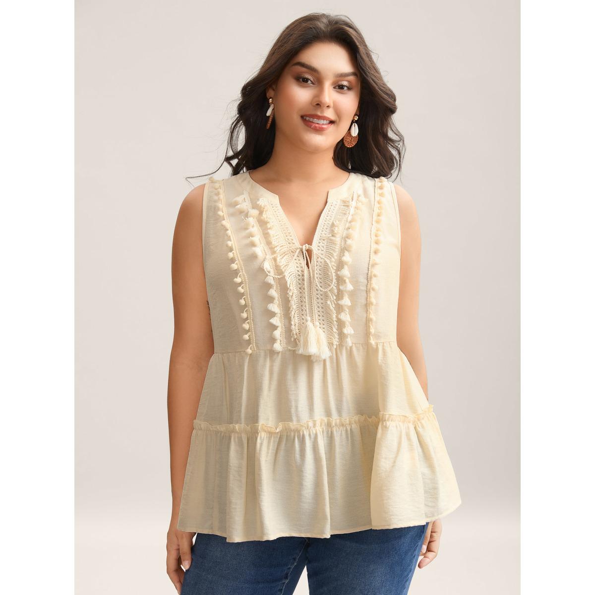 Plus Size Pure Textured Tassels Tiered Tank Top Women Beige Boho Tie knot Notched collar Vacation Tank Tops Camis BloomChic 18-20/2X