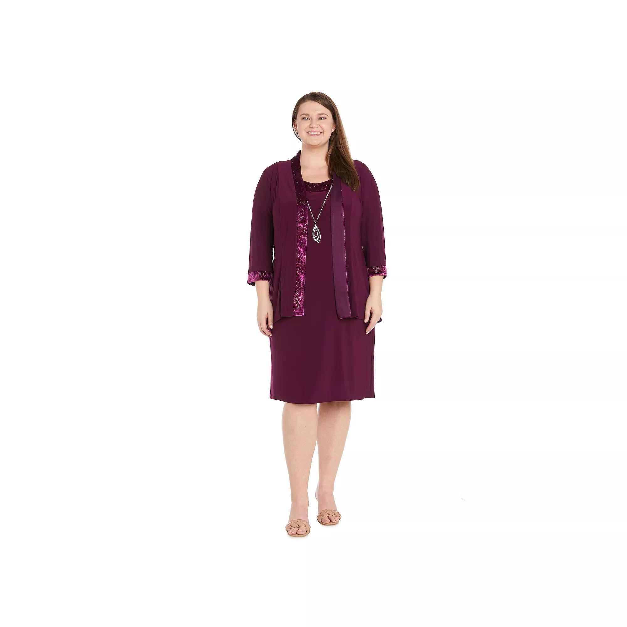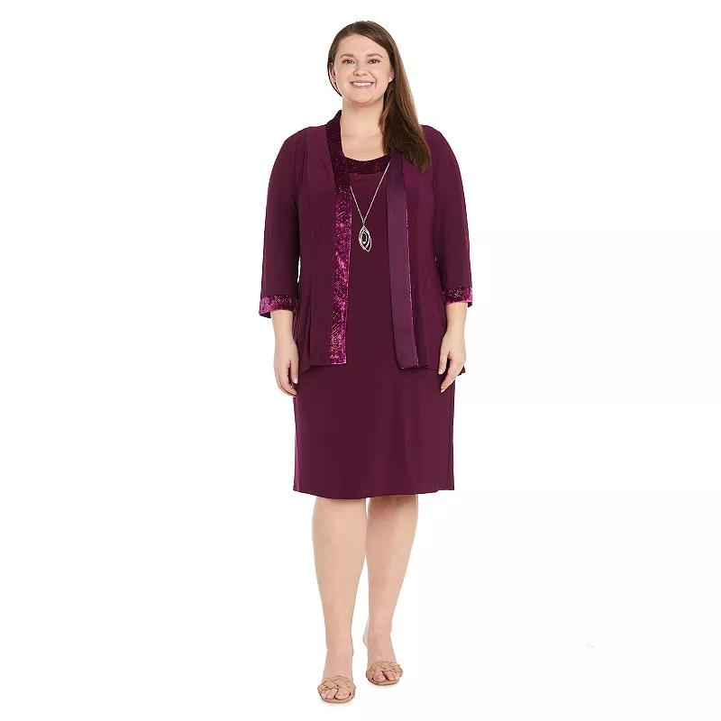 Youll be sure to turn heads in this Plus Size R&M Richards 2-pc. Banded Glitter Velvet Trim Jacket & Dress Set.Click on this WOMENS GUIDE to find the perfect fit and more! Youll be sure to turn heads in this Plus Size R&M Richards 2-pc. Banded Glitter Velvet Trim Jacket & Dress Set.Click on this WOMENS GUIDE to find the perfect fit and more! FEATURES Includes: dress, jacket, necklace Scoopneck 3/4-length sleeves Soft and drapey construction Straight hem No closure - pull-on styling Partially linedFIT & SIZING Relaxed fit through the hip and thigh 41-in. length from shoulder to hemFABRIC & CARE Polyester, spandex Lining: polyester Hand wash Imported Size: 22 W. Color: Burgundy. Gender: female. Age Group: adult.