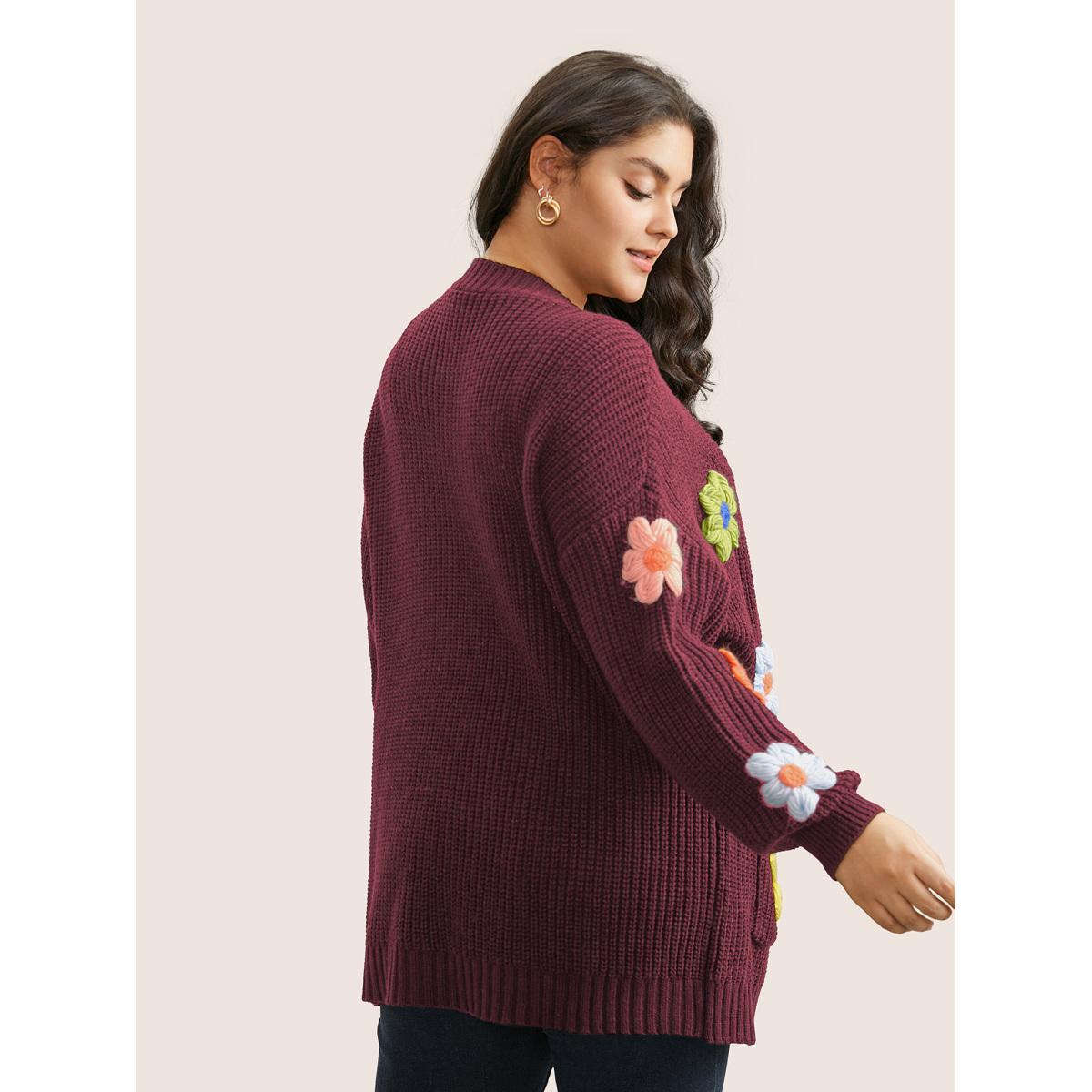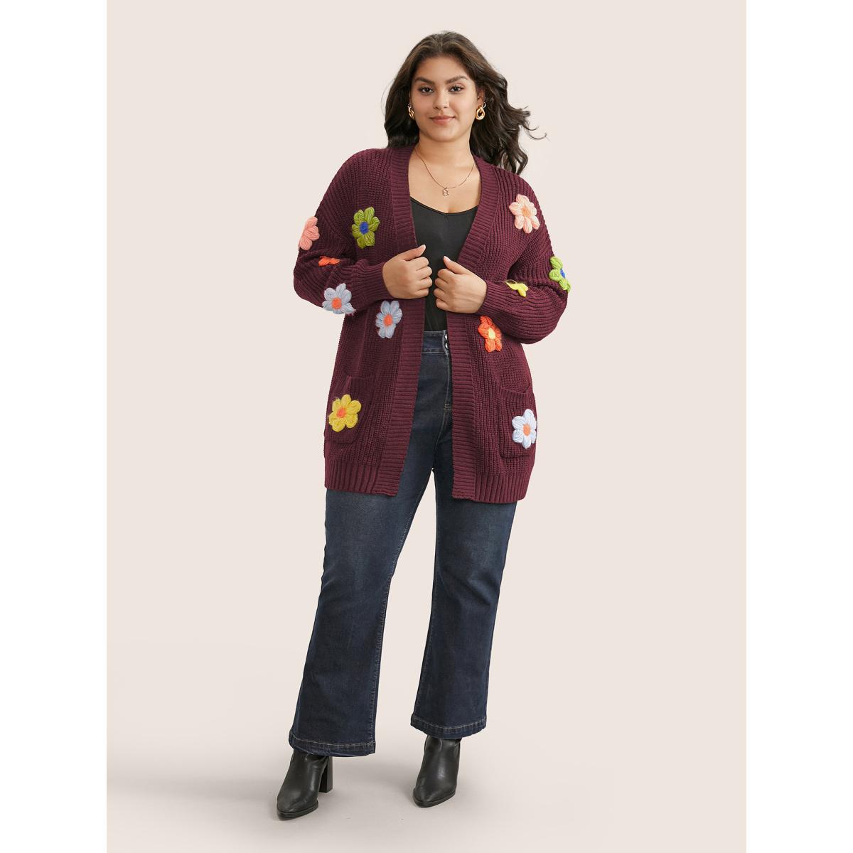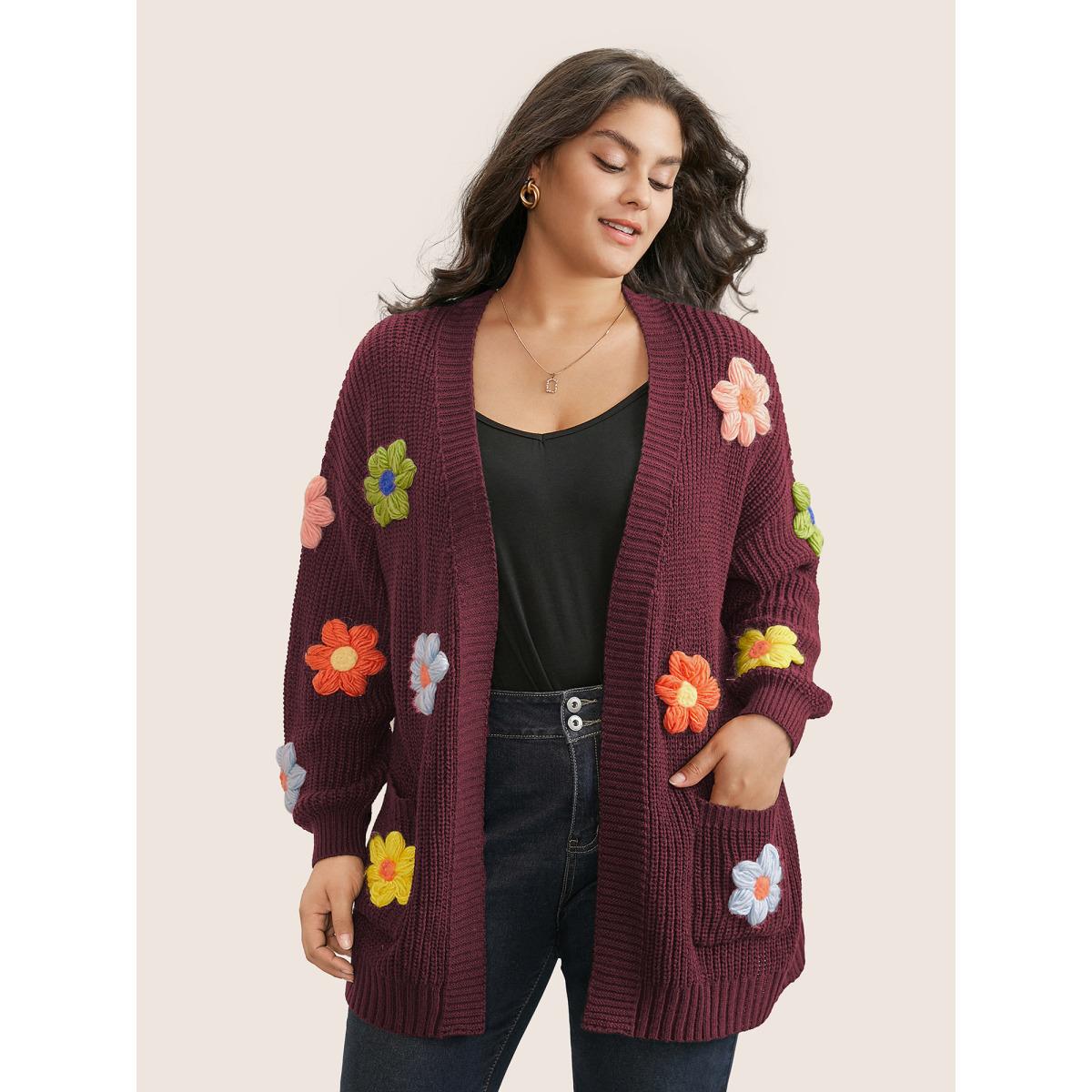 Plus Size Rainbow Floral Pocket Open Front Cardigan Burgundy Women Casual Long Sleeve Everyday Cardigans BloomChic 10/M