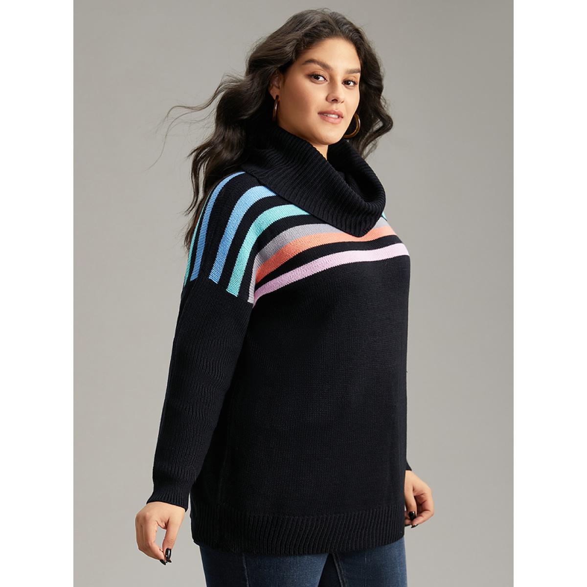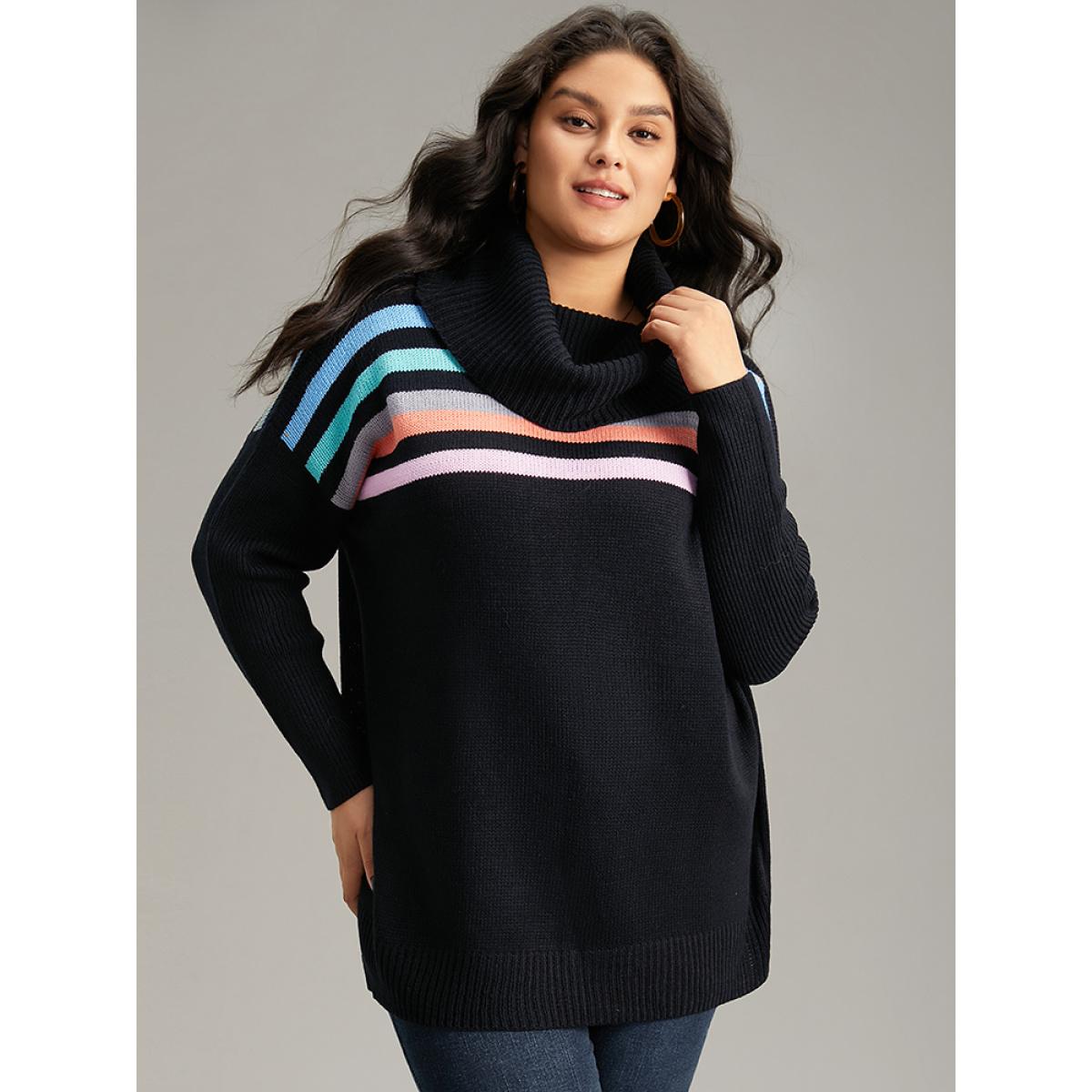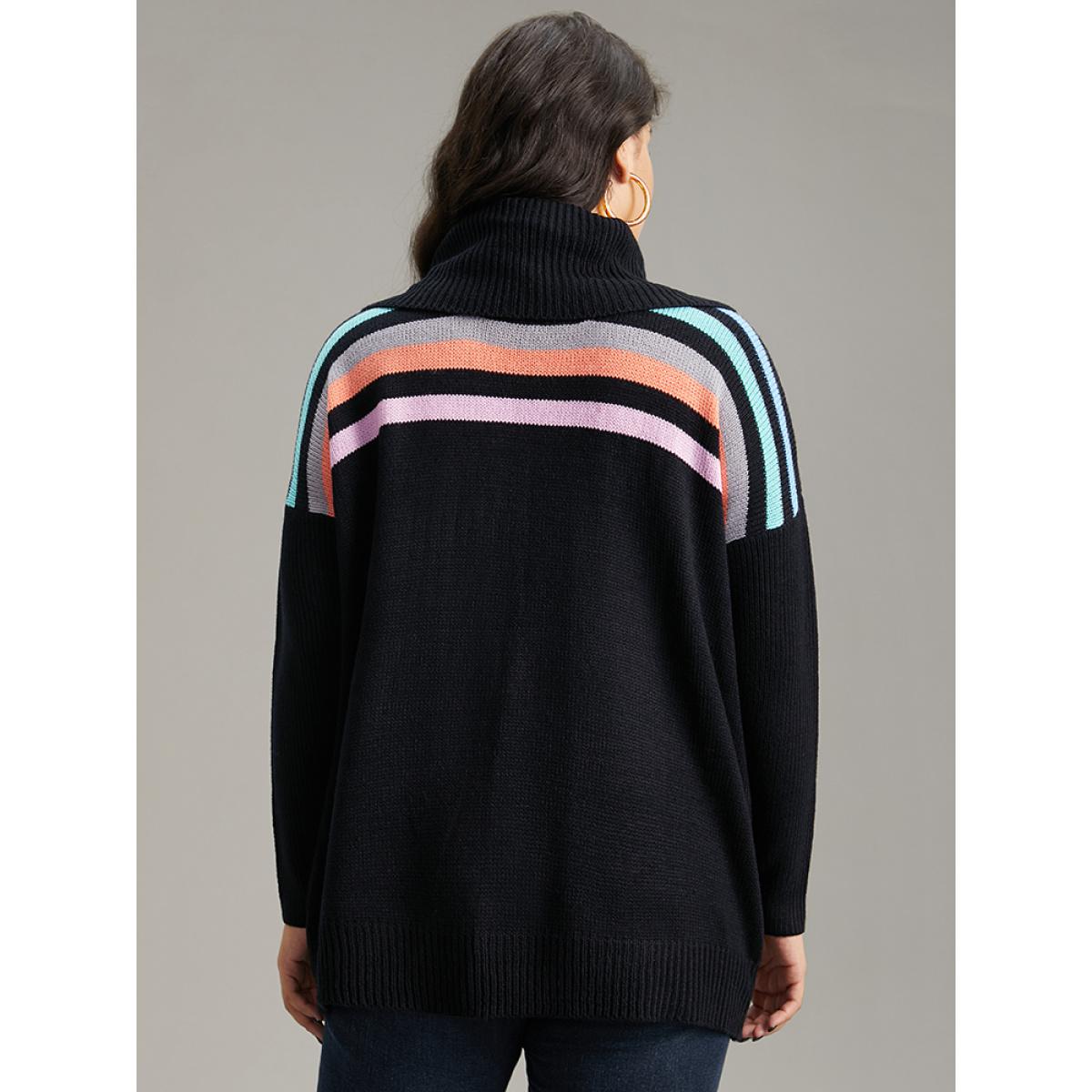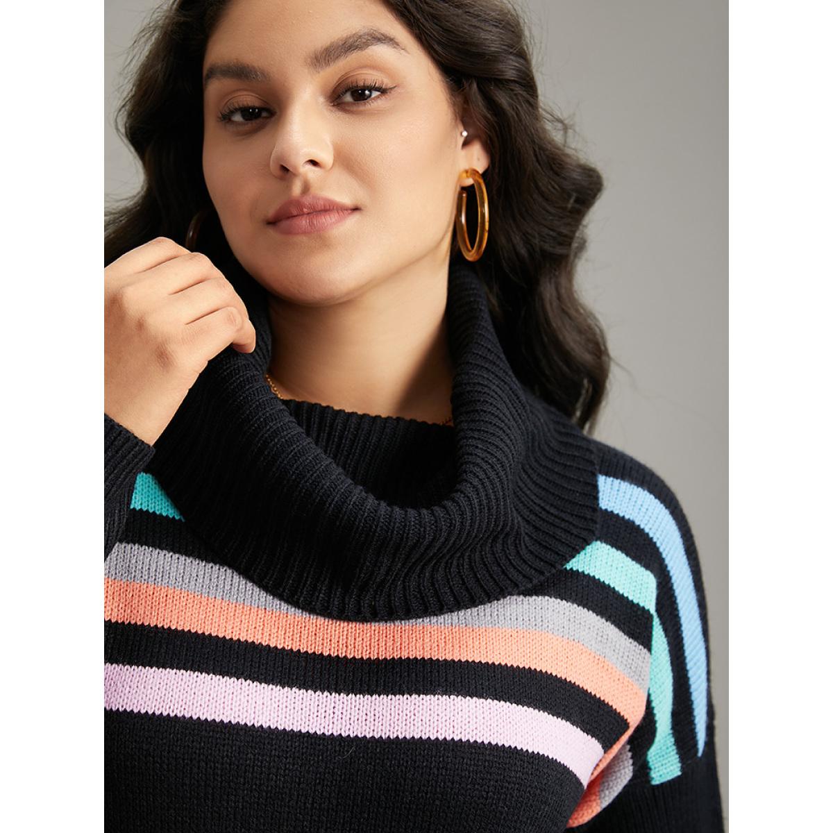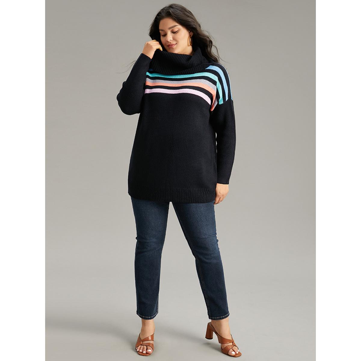 Plus Size Rainbow Striped Turtle Neck Drop Shoulder Pullover Black Women Casual Loose Long Sleeve Turtleneck Dailywear Pullovers BloomChic 26/4X