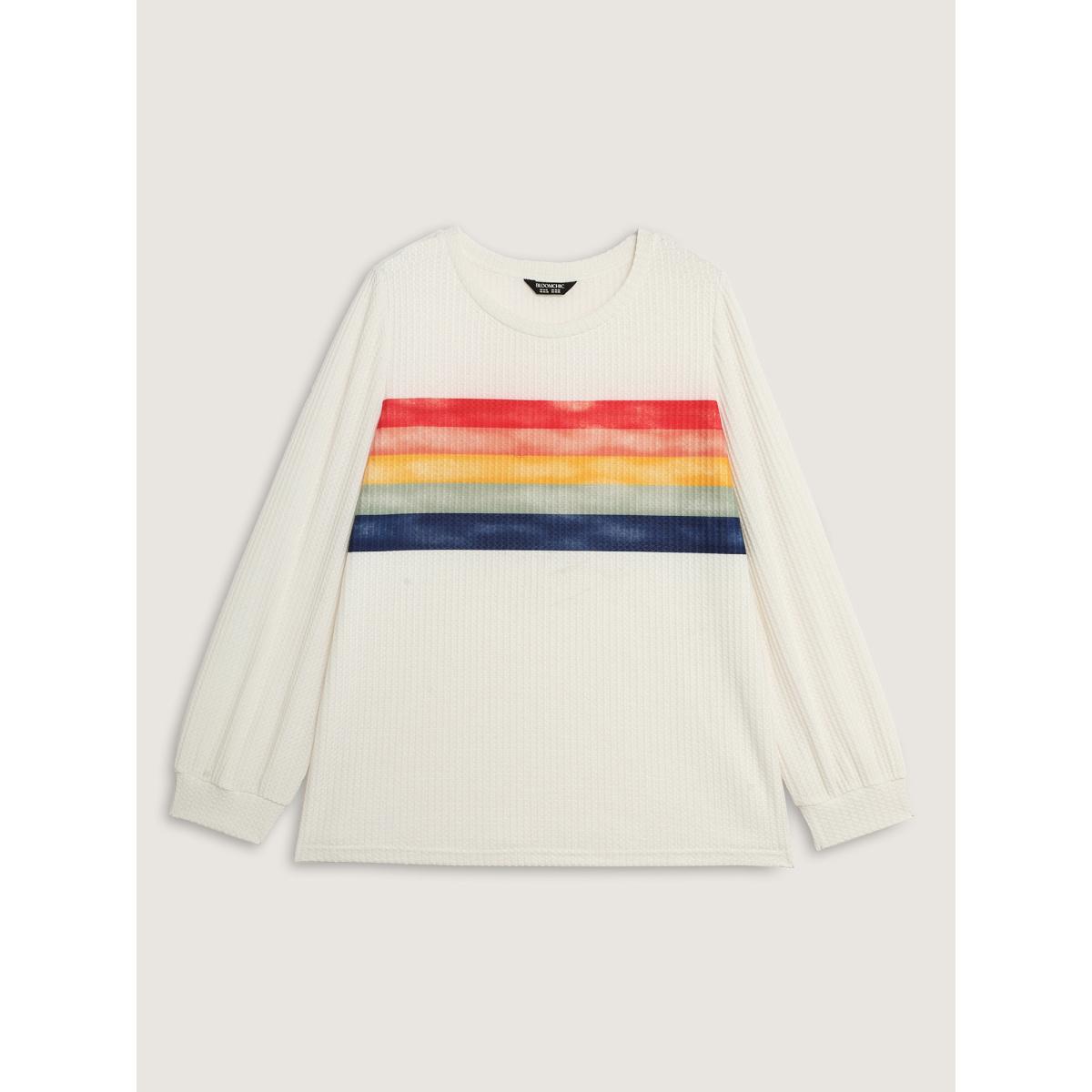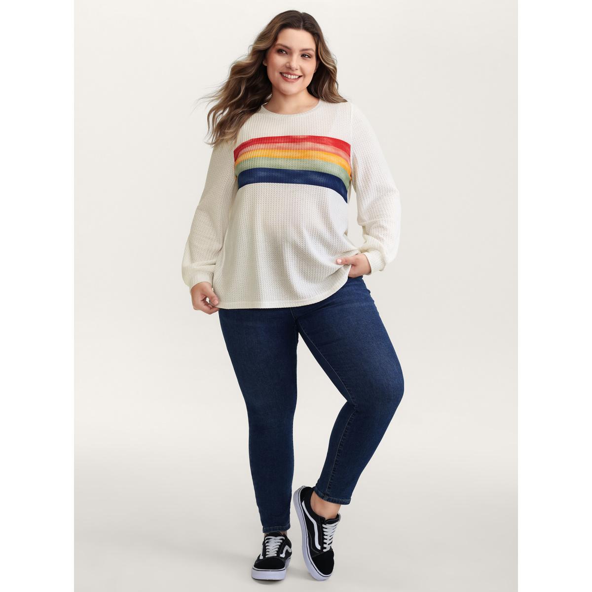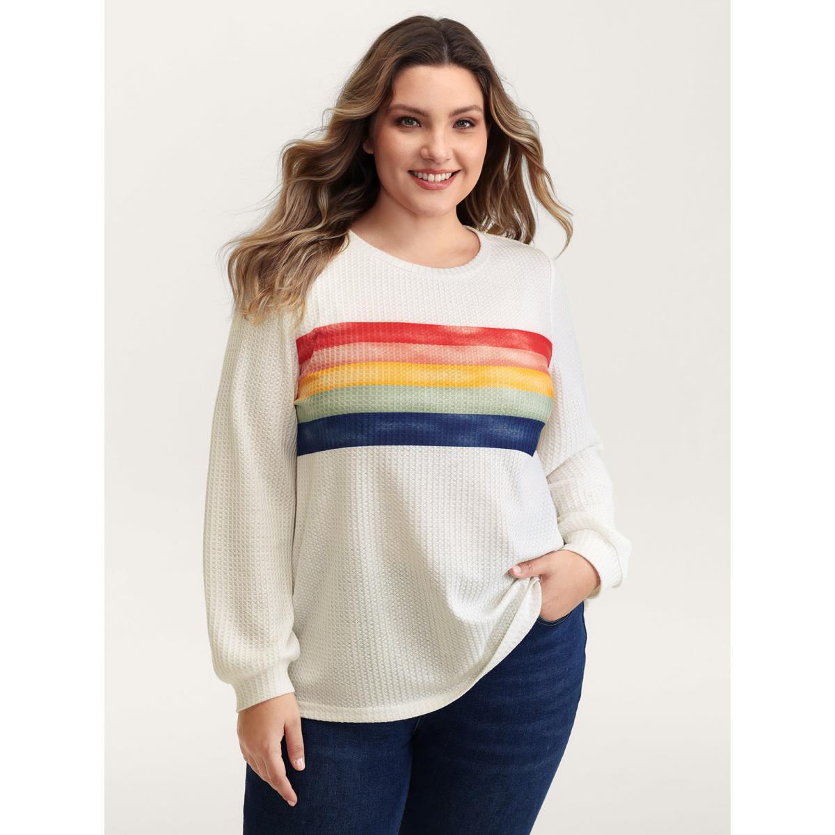 Plus Size Rainbow Stripes Textured T-Shirt Ivory Women Playful Round Neck Casual T-shirts BloomChic 22-24/3X