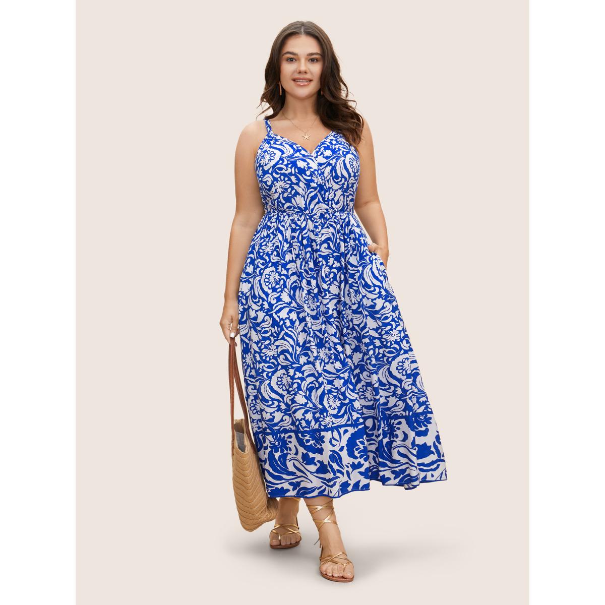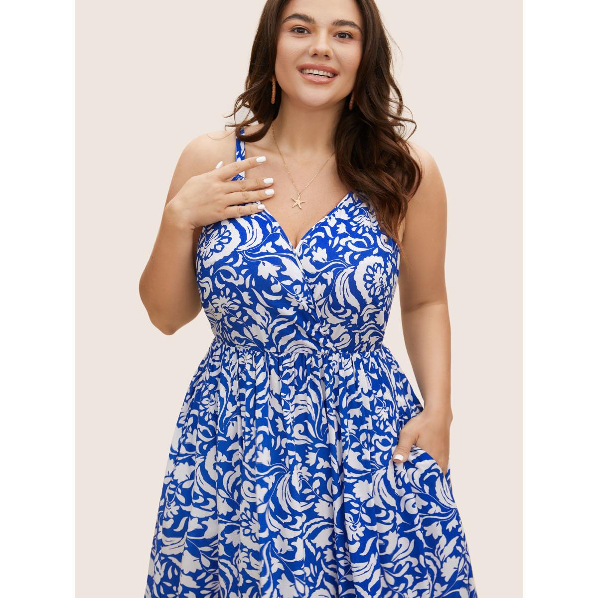 Plus Size Rayon Boho Print Wrap Cami Dress Brightblue Women Resort Ruffles Overlap Collar Sleeveless Curvy BloomChic 14-16/1X