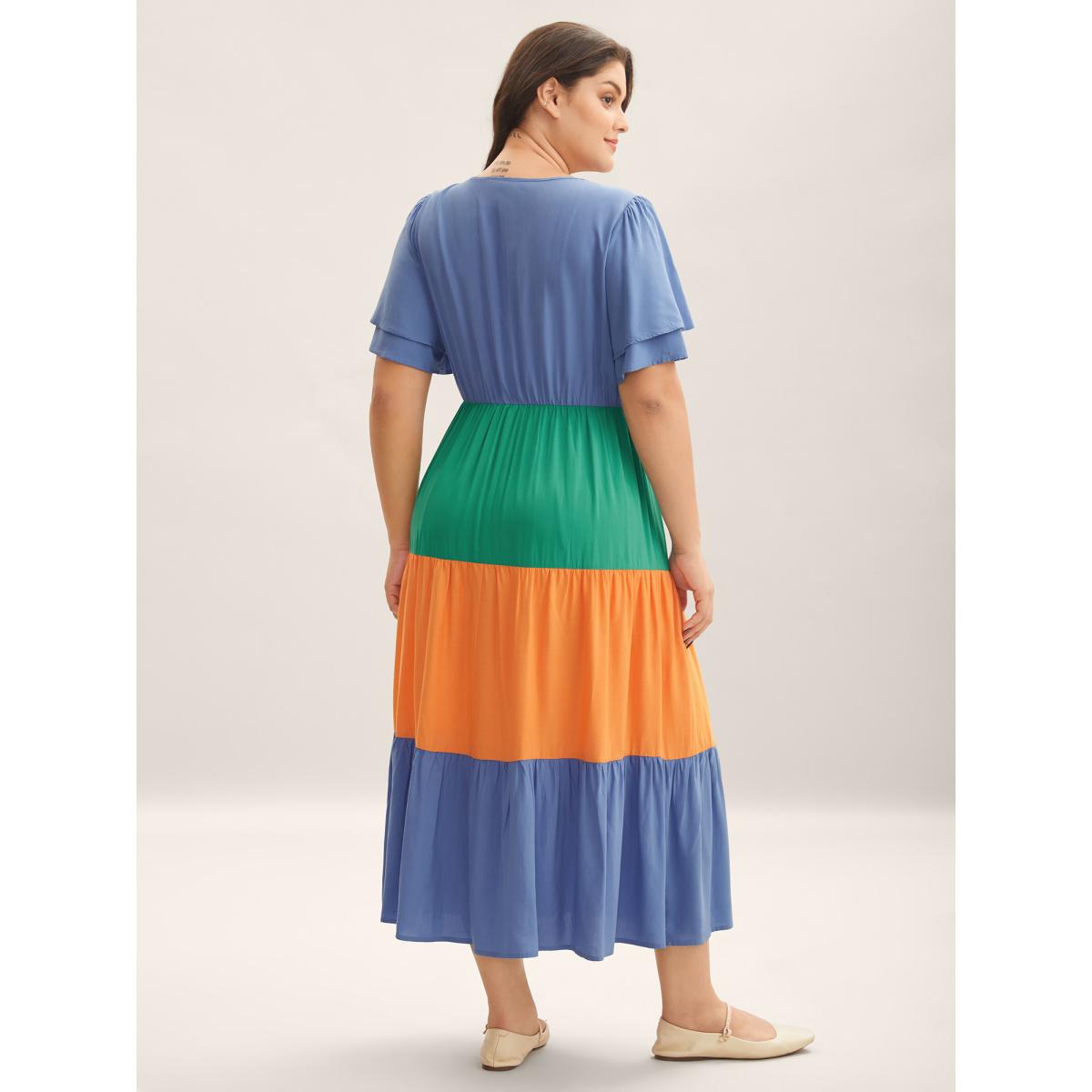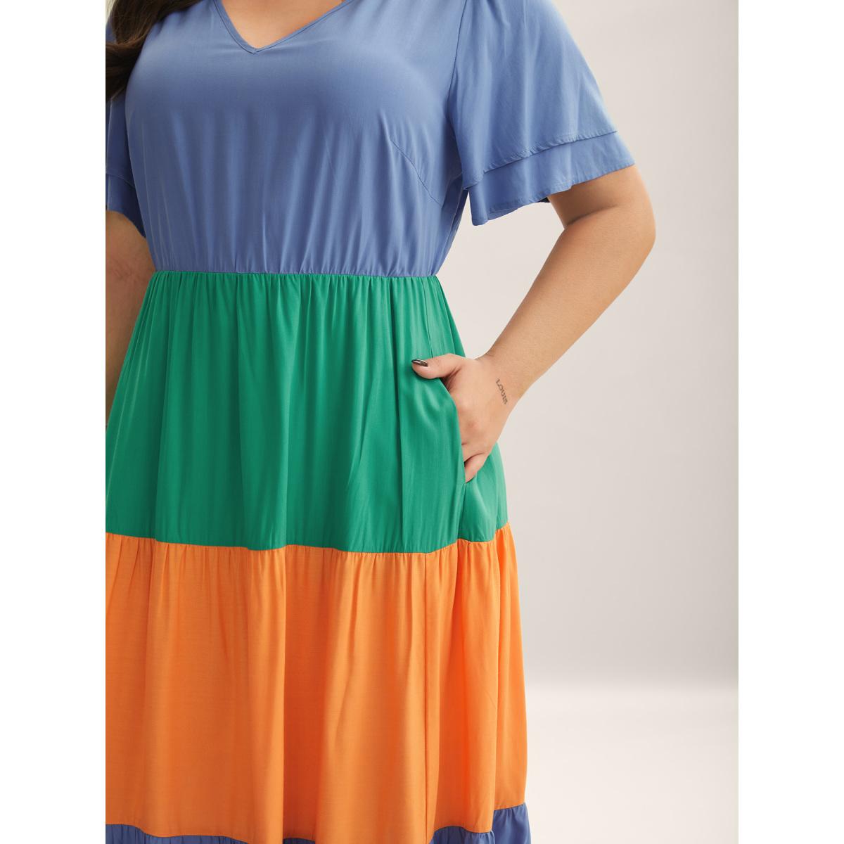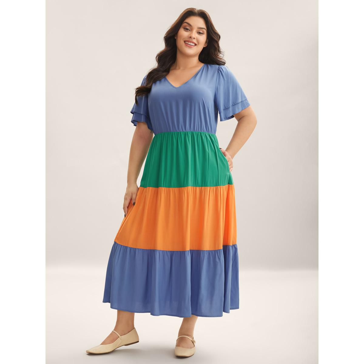 Plus Size Colorblock Contrast Ruffle Layered Hem Dress Blue Women Casual Overlapping V-neck Sleeveless Curvy BloomChic 14-16/1X