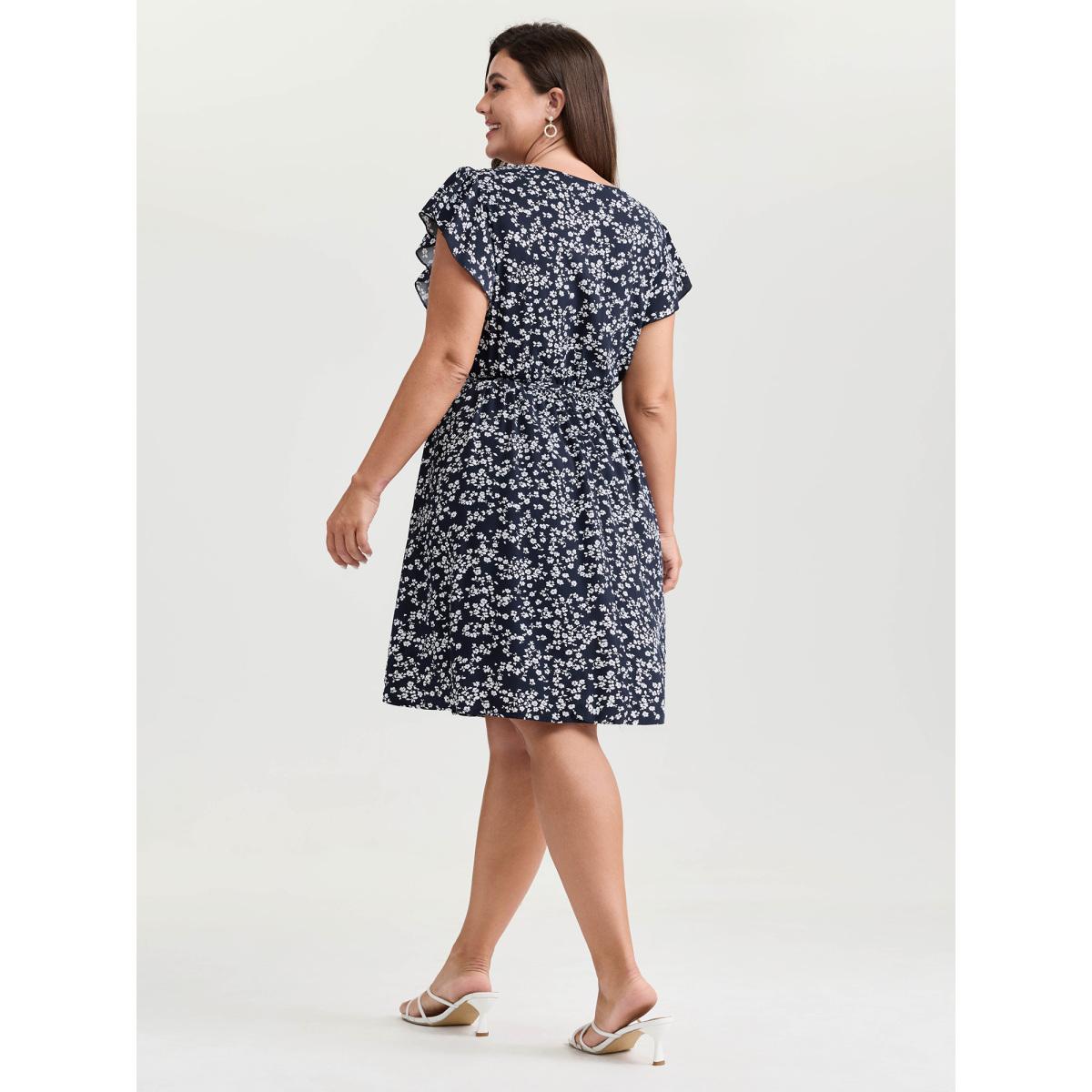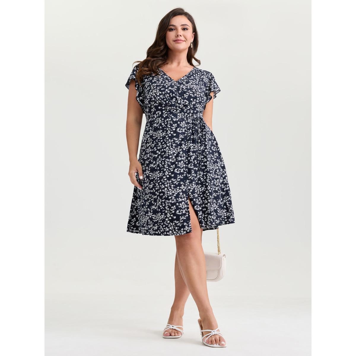 Plus Size Rayon Floral Print Pleated Pockets Mini Dress Indigo Women Timeless Gathered Overlap Collar Short sleeve Curvy BloomChic 18-20/2X
