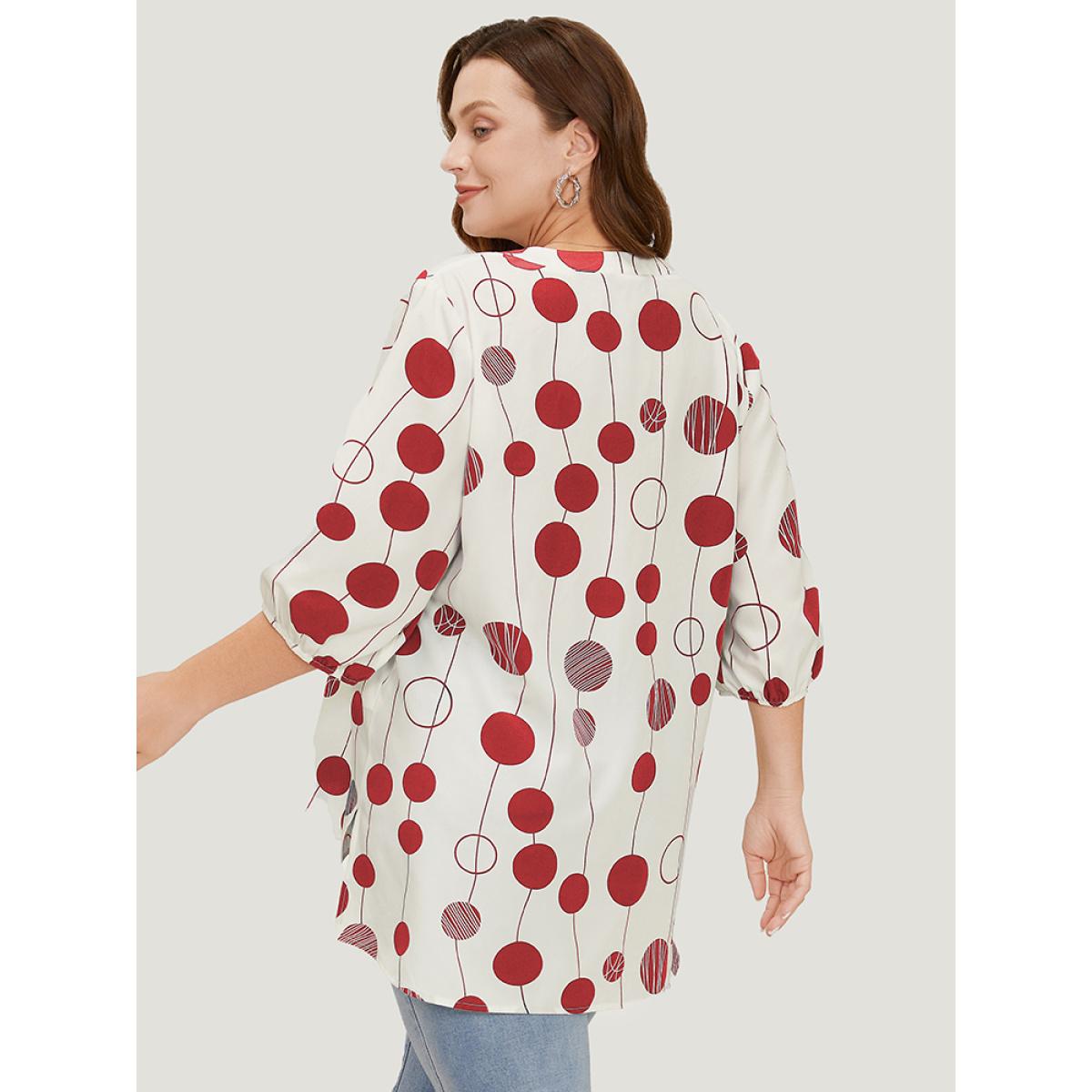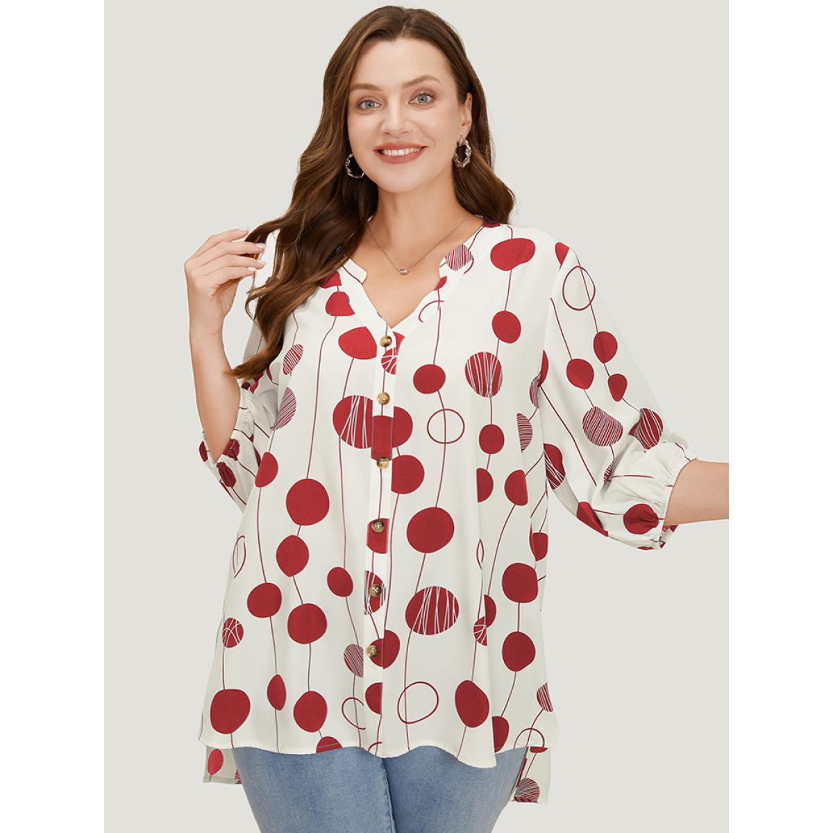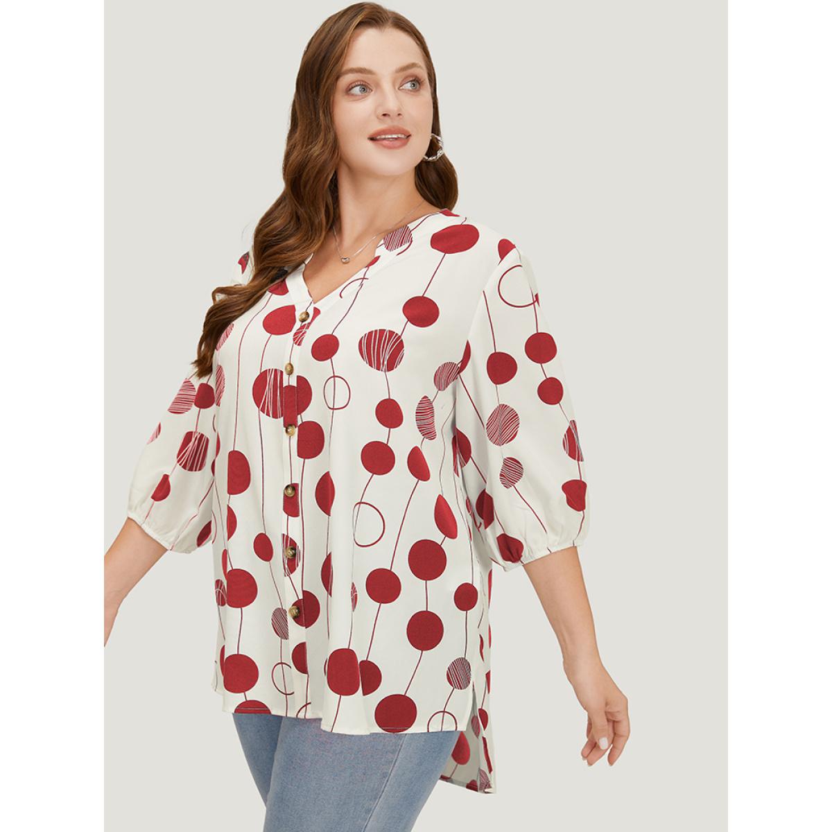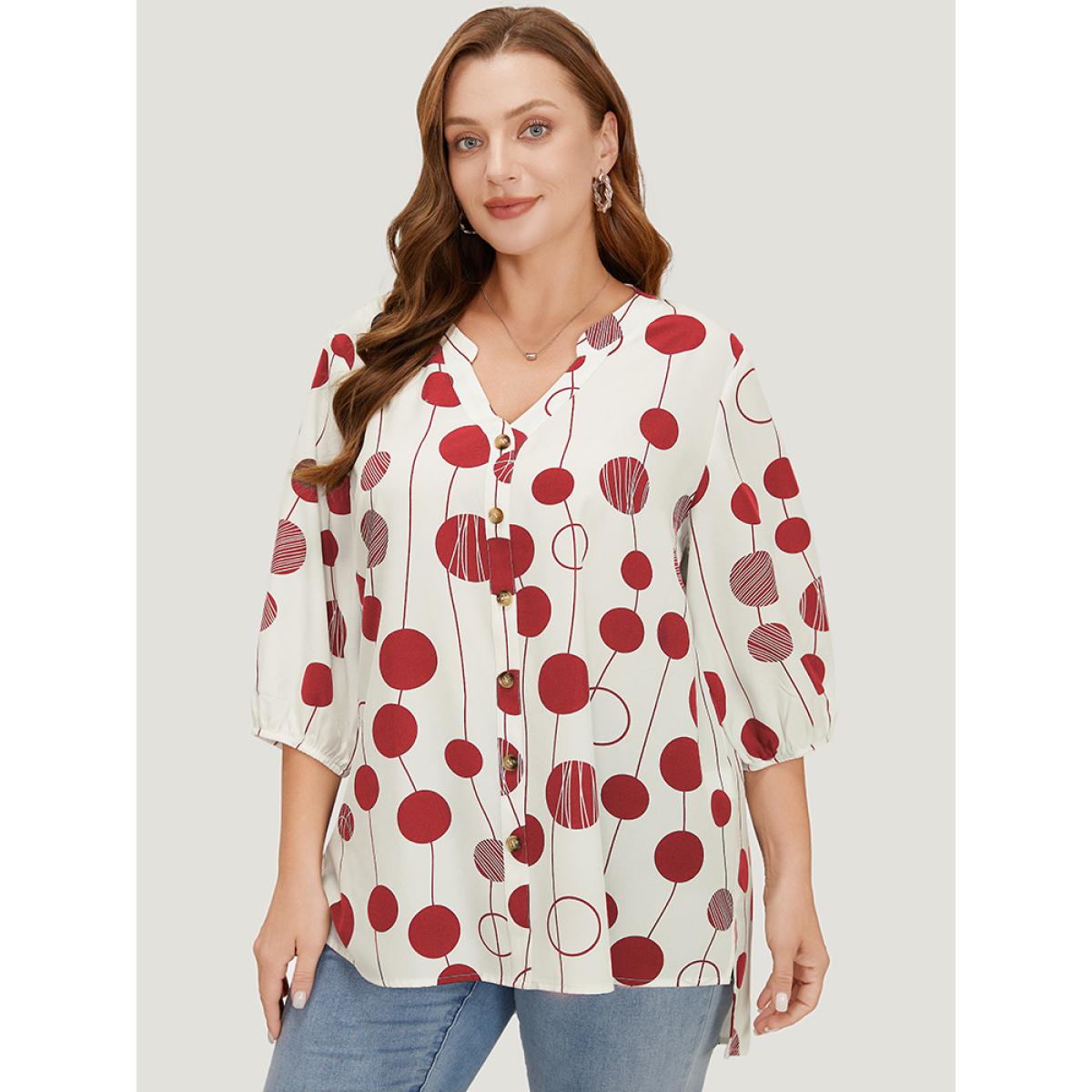 Plus Size Red Polka Dot Button Detail Lantern Sleeve Split High Low Blouse Women Elegant Elbow-length sleeve V-neck Dailywear Blouses BloomChic 30/6X