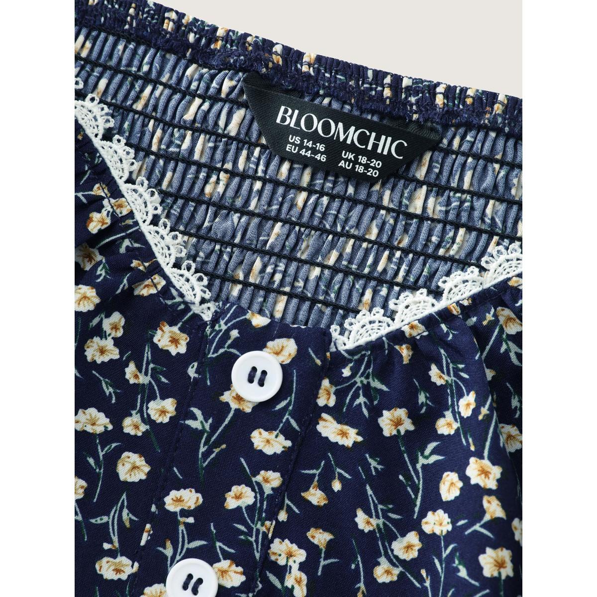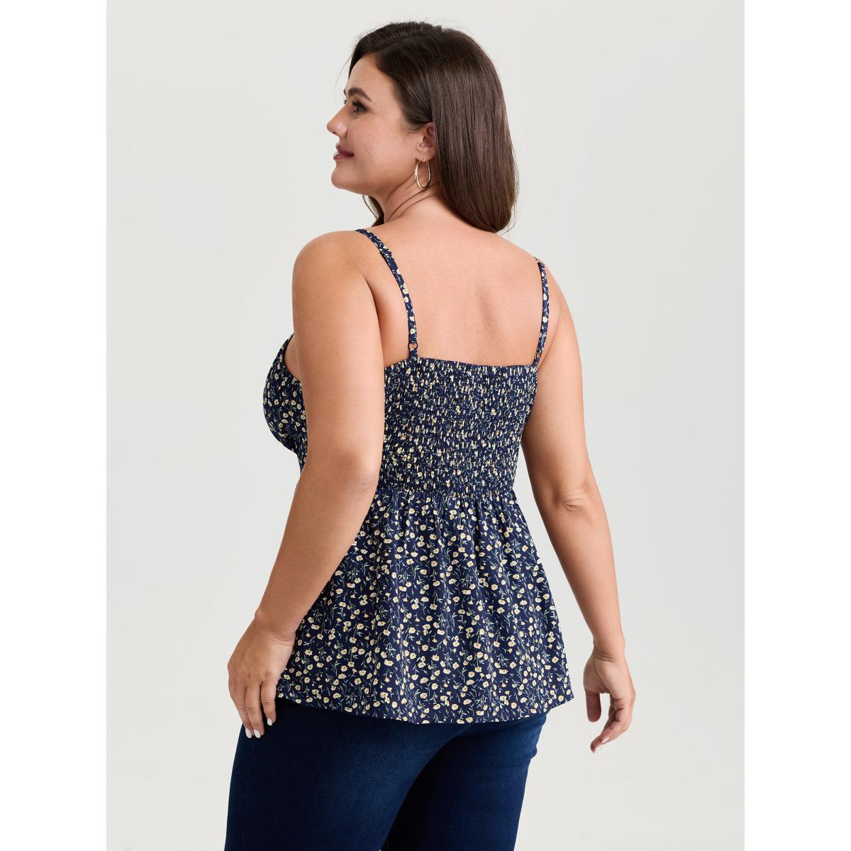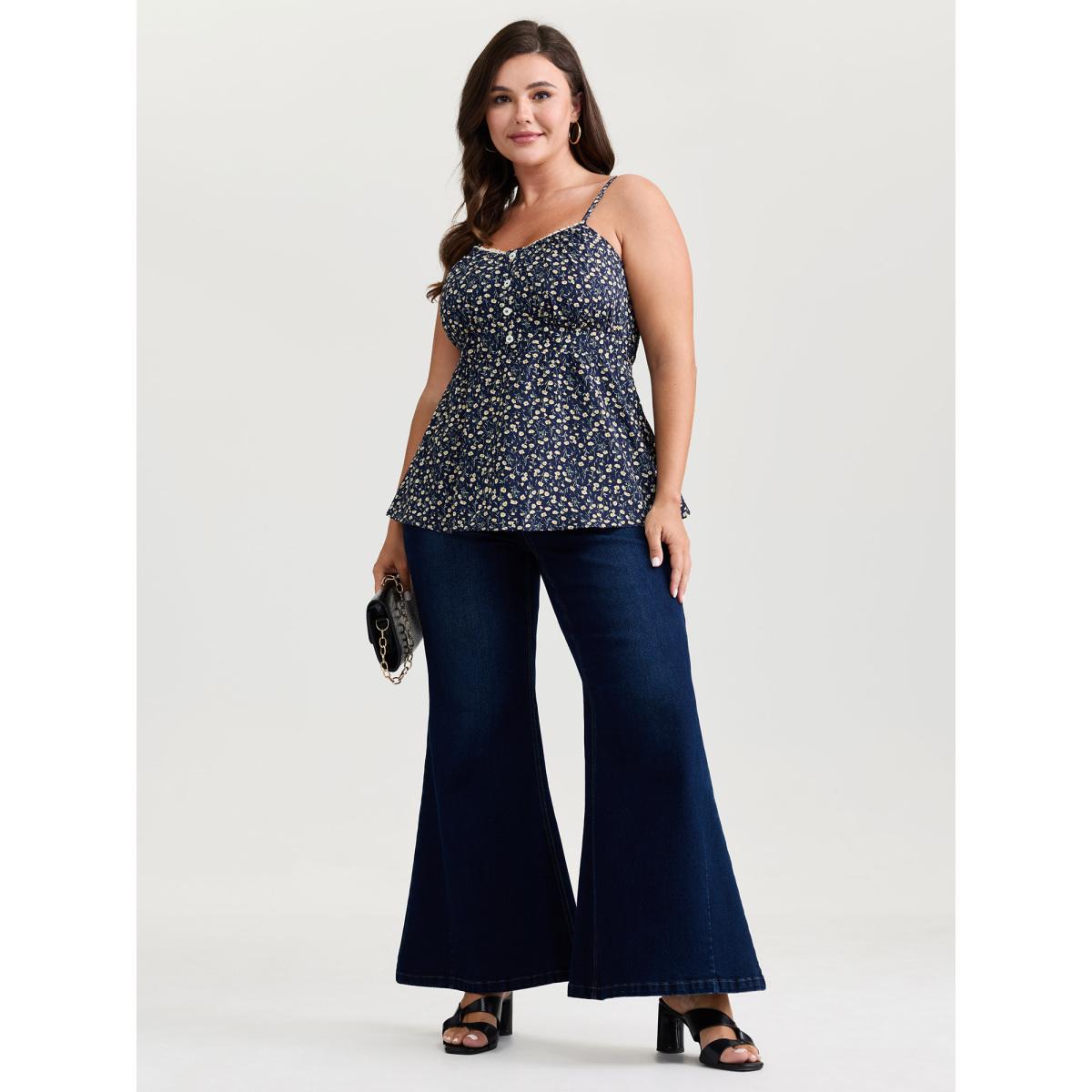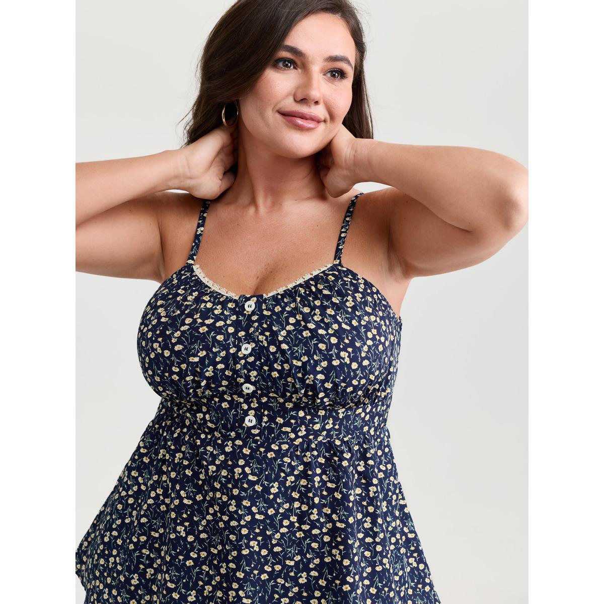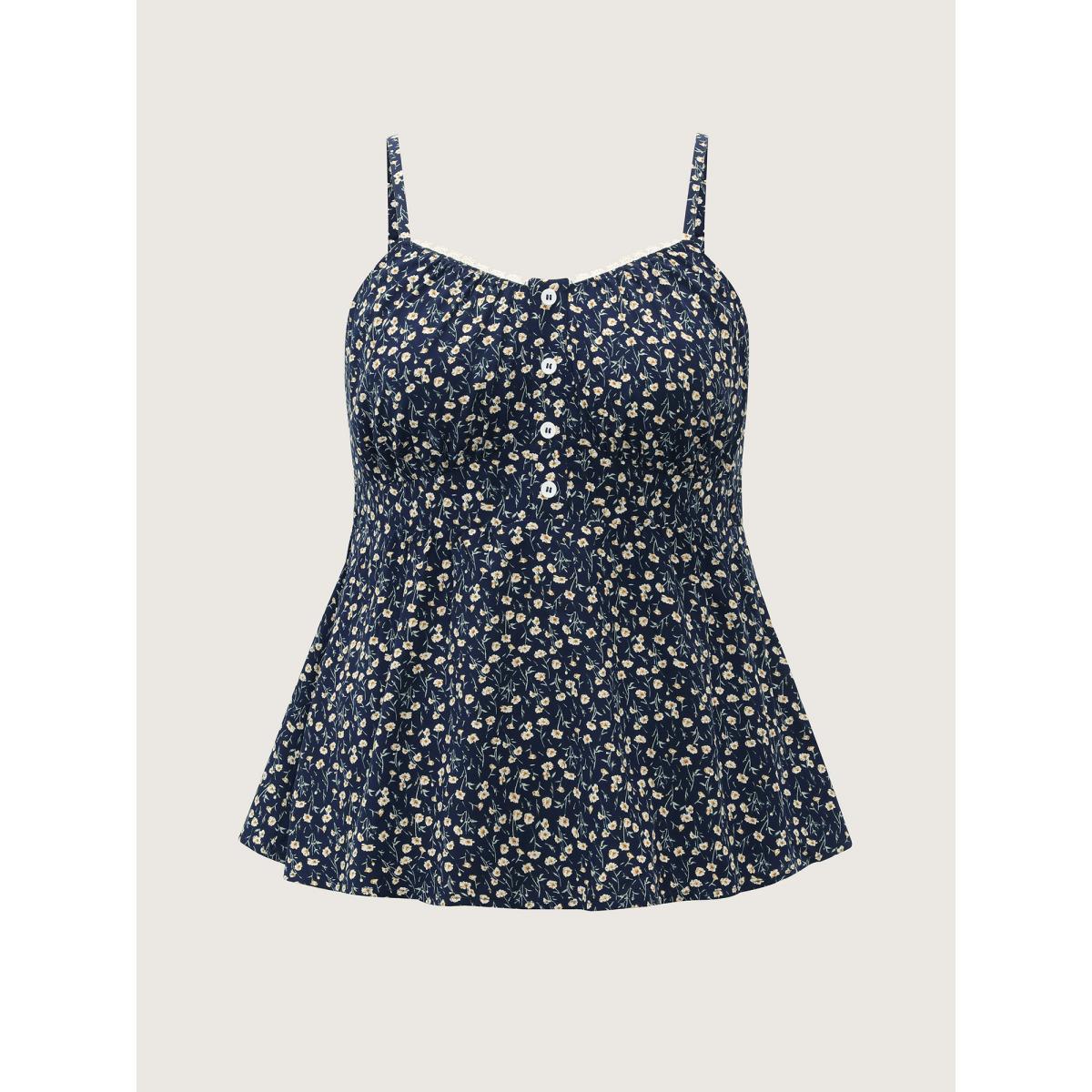 Plus Size Retro Floral Print Lace Trim Tank Top Women DarkBlue Timeless Woven ribbon&lace trim Heart neckline Elegant Tank Tops Camis BloomChic 10/M