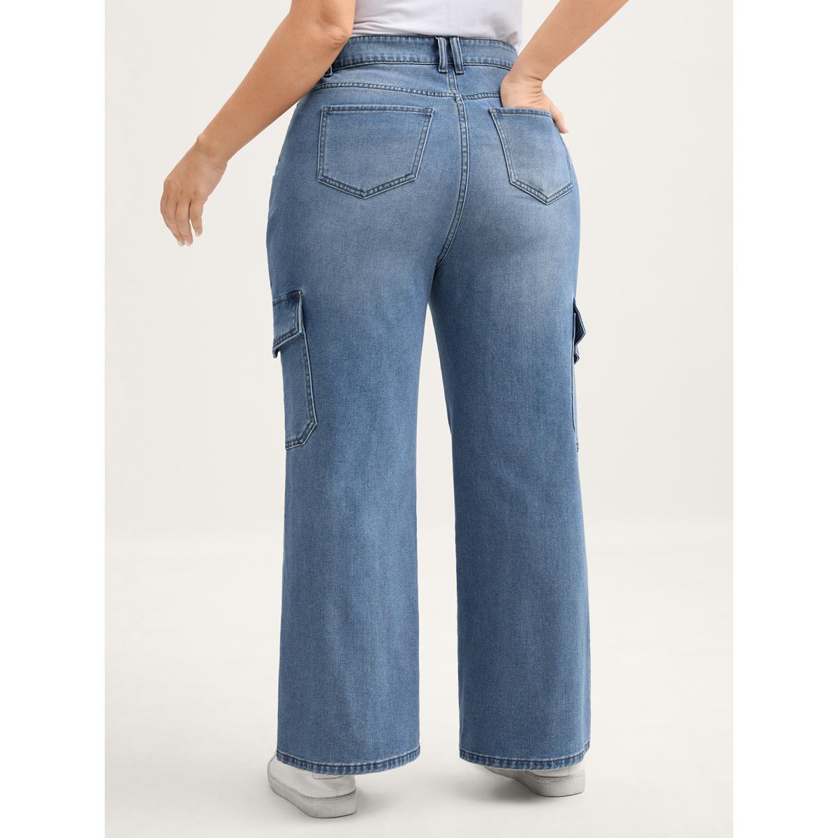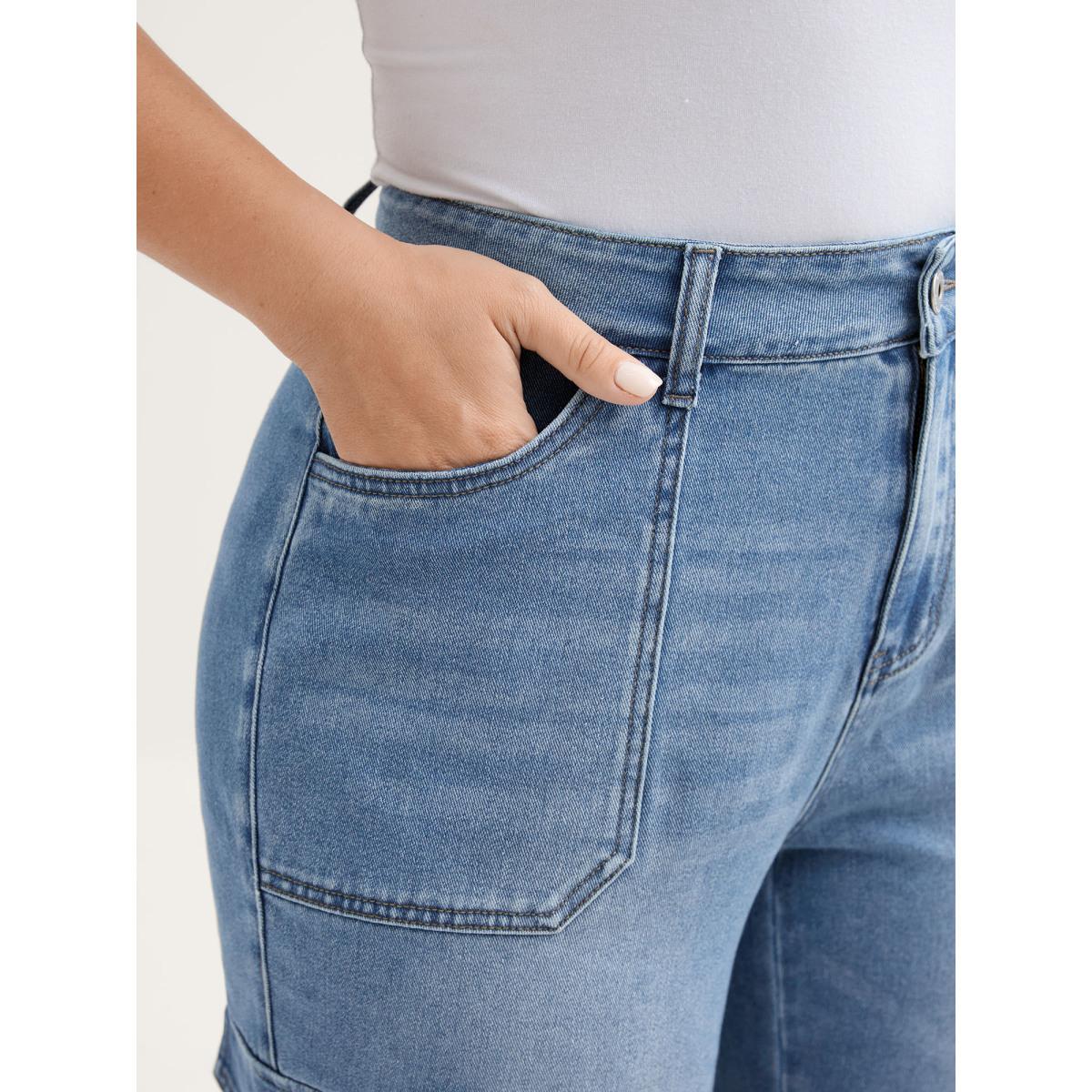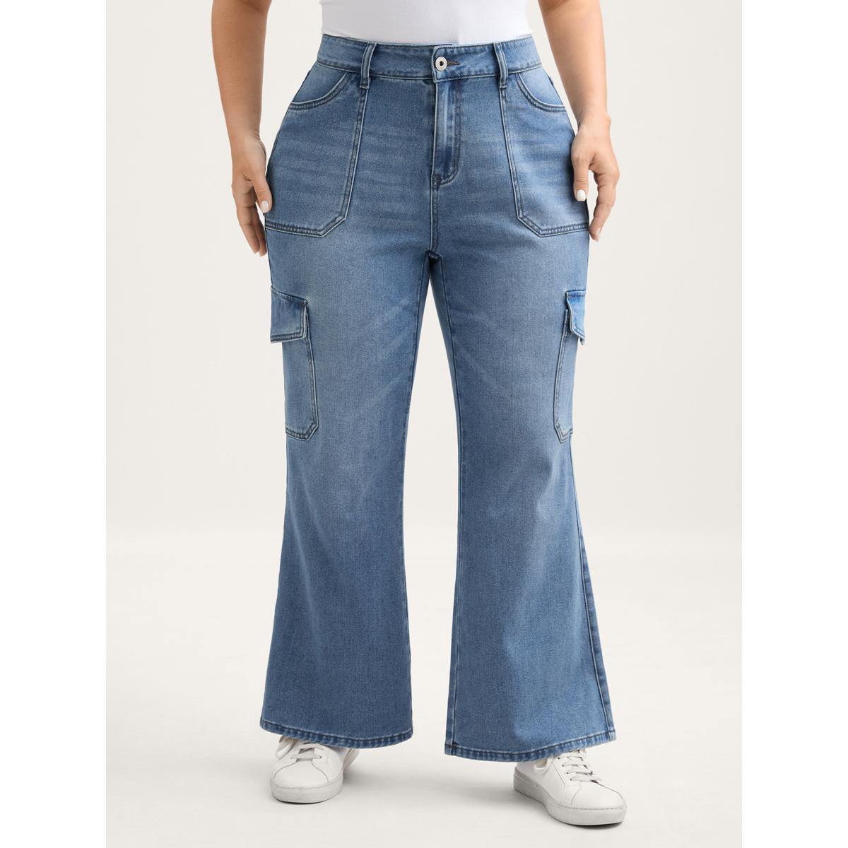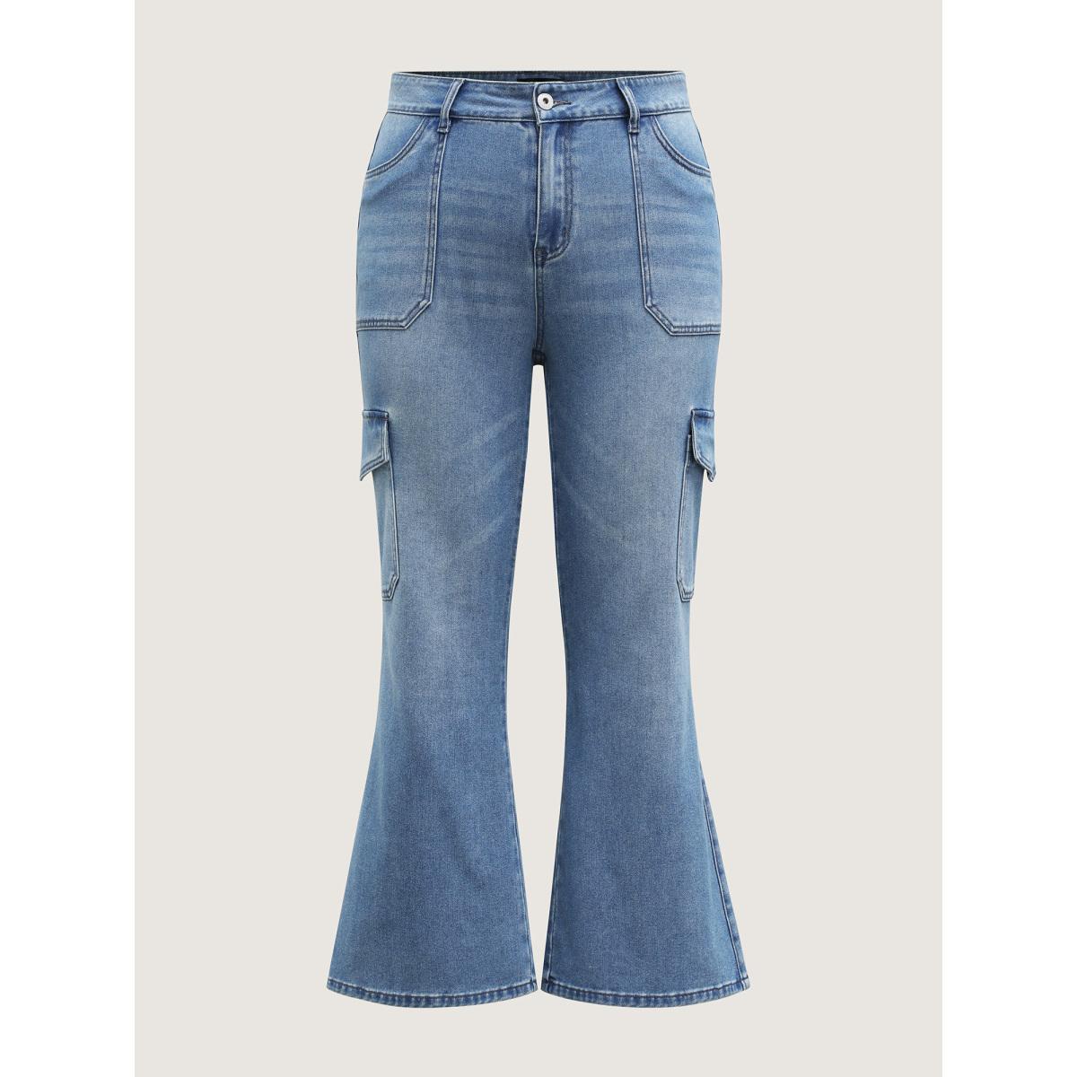Plus Size Retro Wash Flared Hem Jeans Women Bluevintage Leisure Pocket High stretch Slanted pocket Jeans BloomChic 10/M