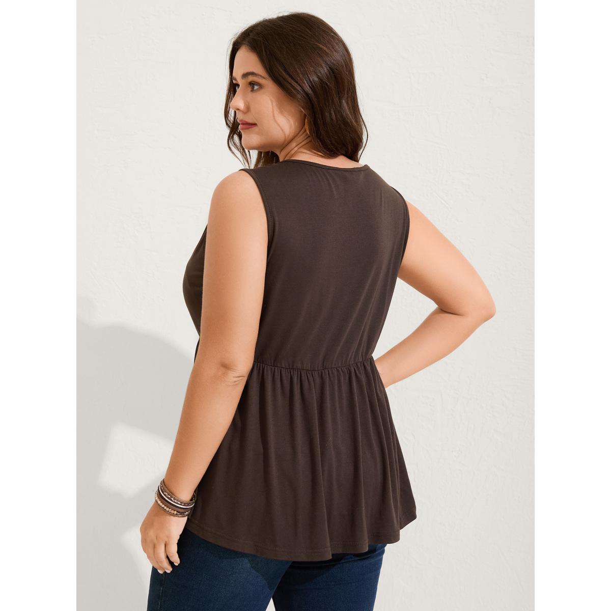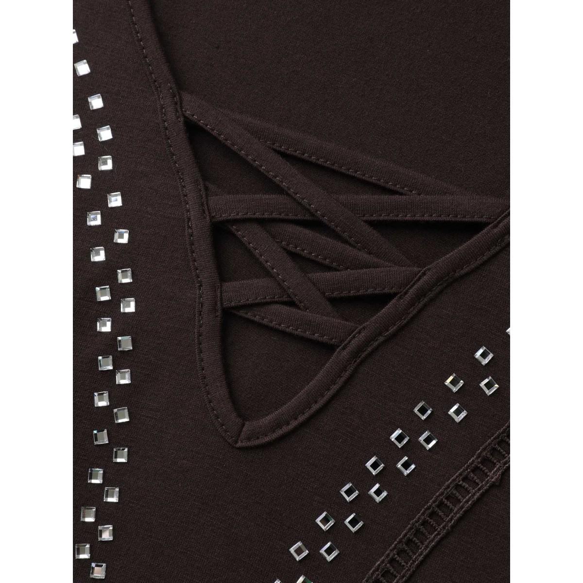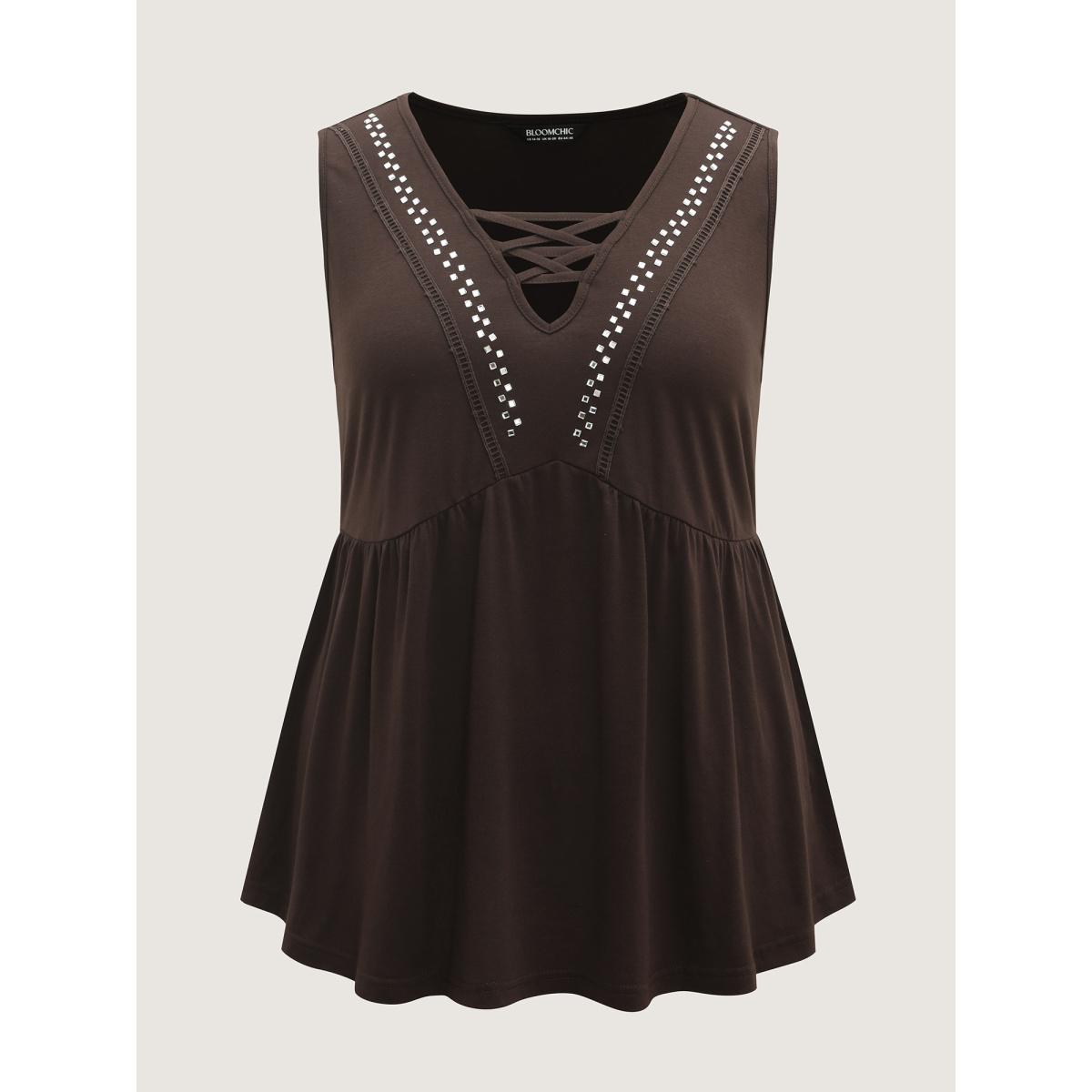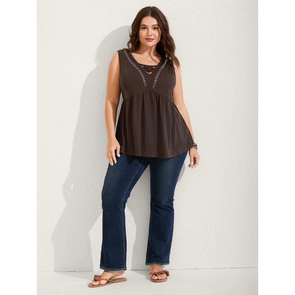 Plus Size Rhinestone Cross-Tie Flared Top Women DarkBrown Boho Woven ribbon&lace trim Deep V-neck Vacation Tank Tops Camis BloomChic 10/M
