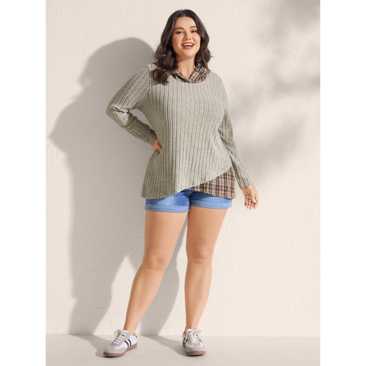 Plus Size Ribbed Asymmetrical Hem Spliced Hoodie Women Apricot Leisure Overlapping Hooded Casual Sweatshirts BloomChic 10/M Product Image