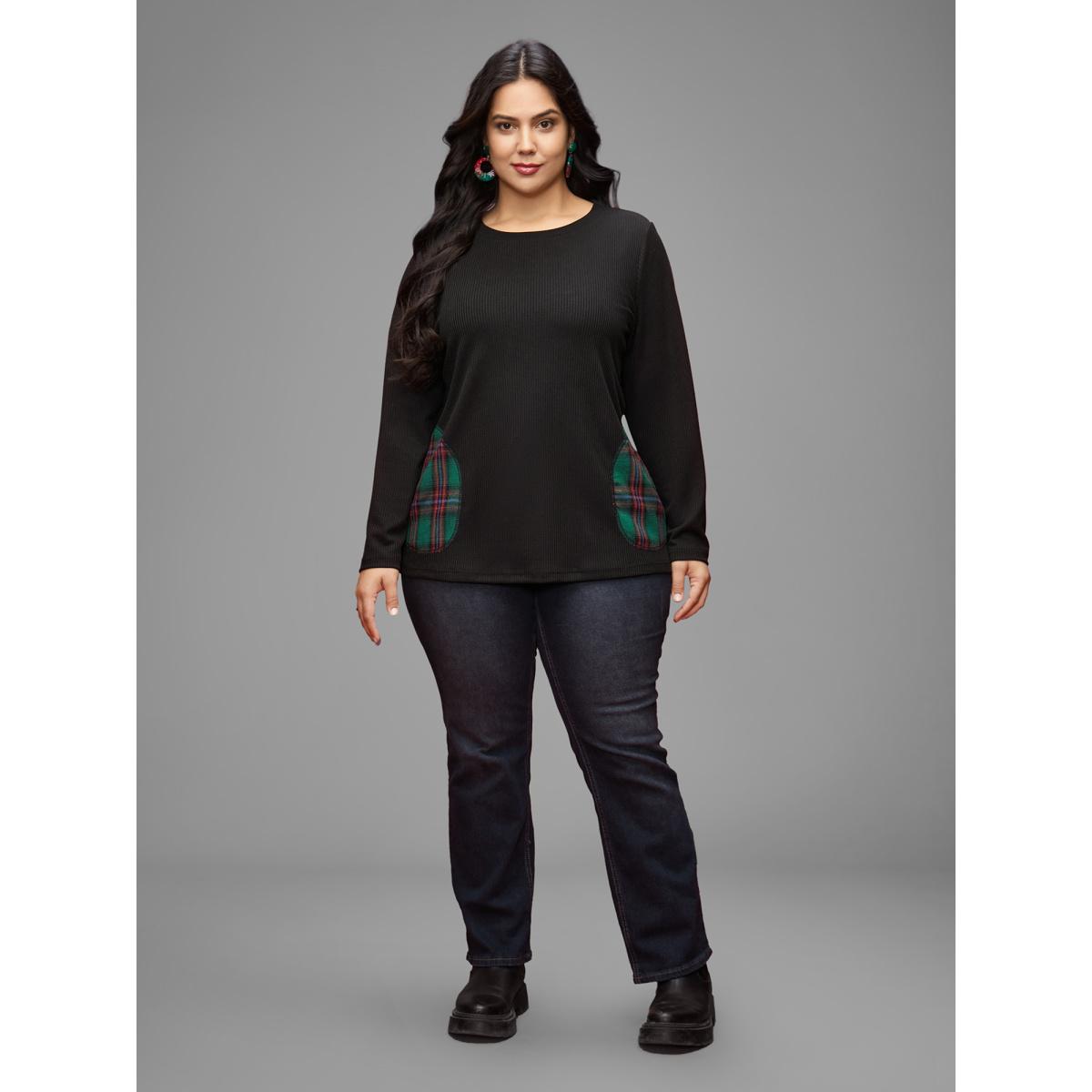 Plus Size Ribbed Contrast Pocket Slim-Fit Tee Black Women Casual Texture Round Neck Everyday T-shirts BloomChic 22-24/3X