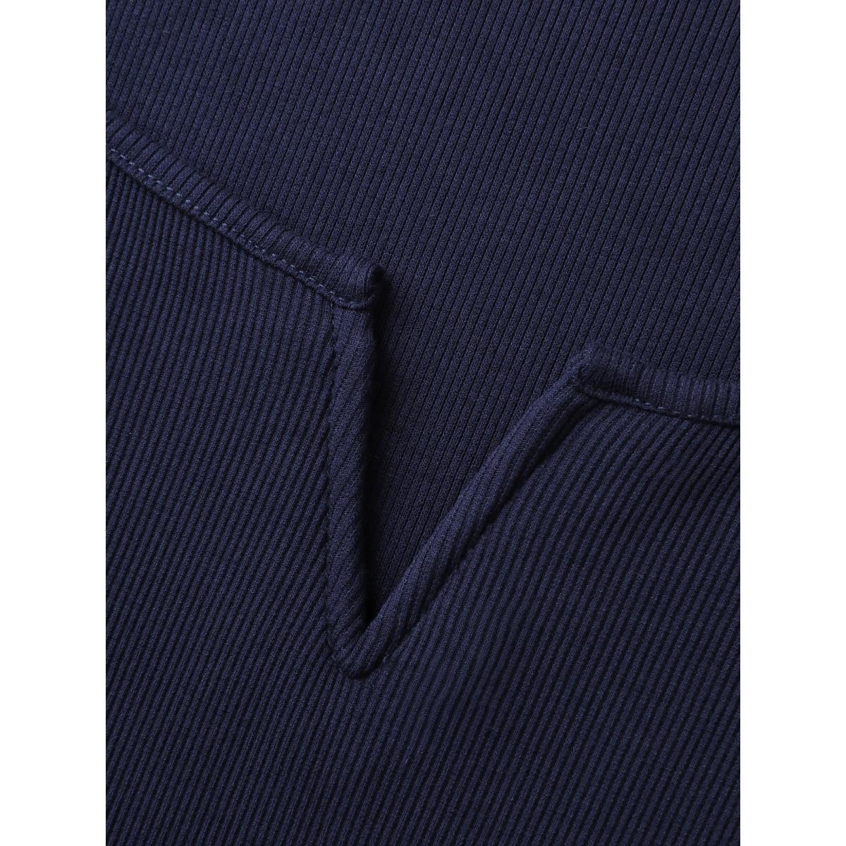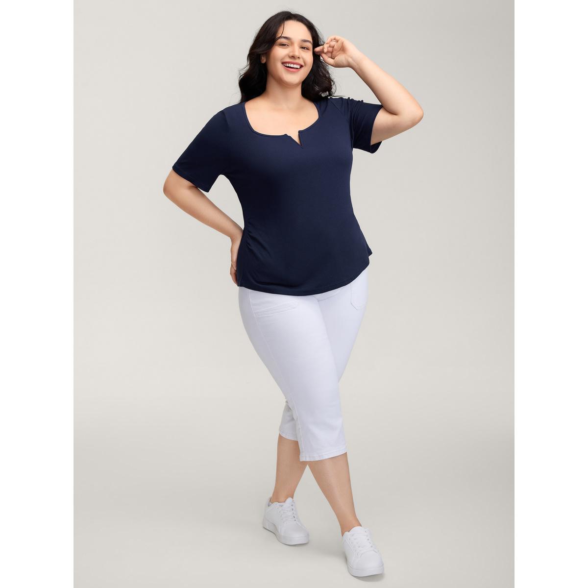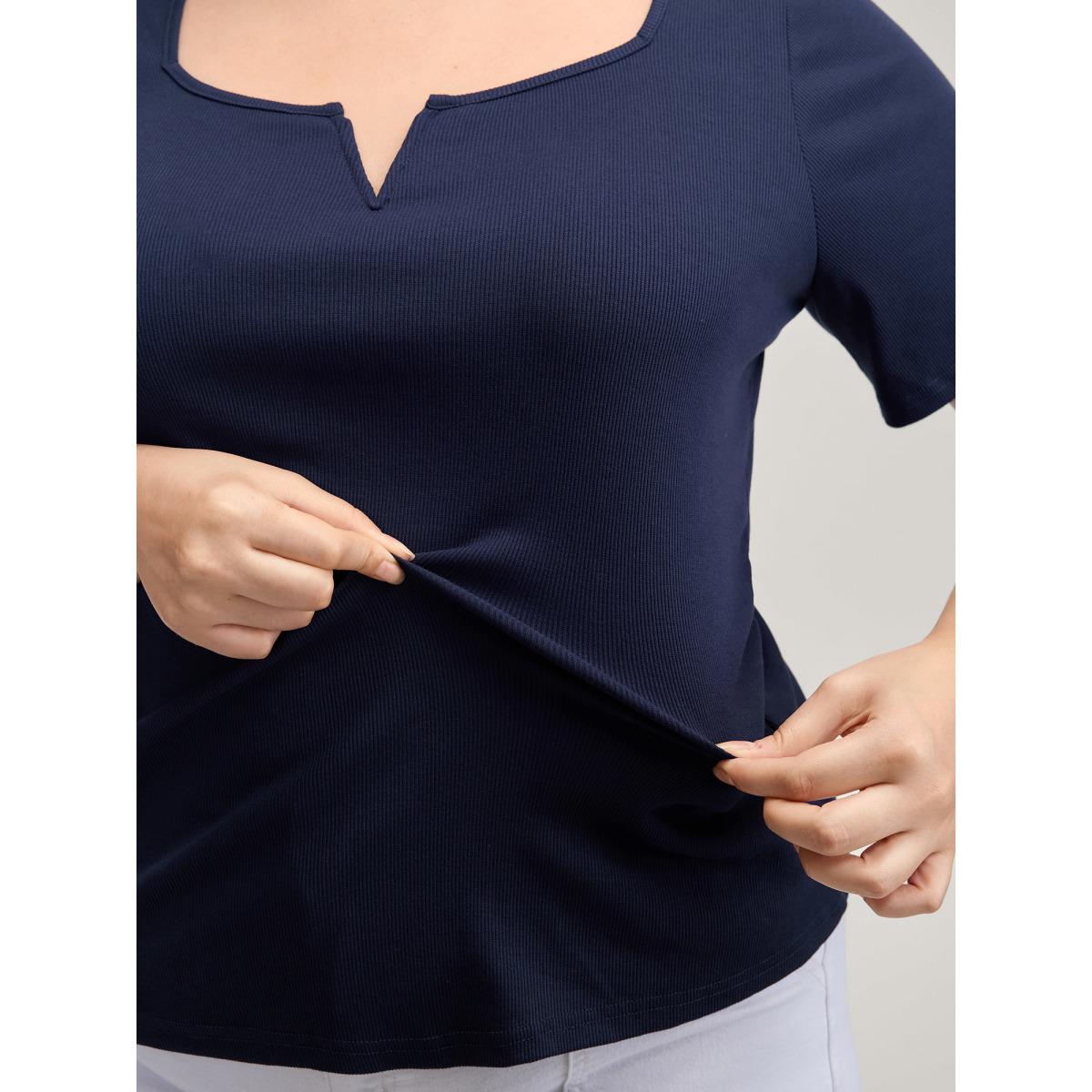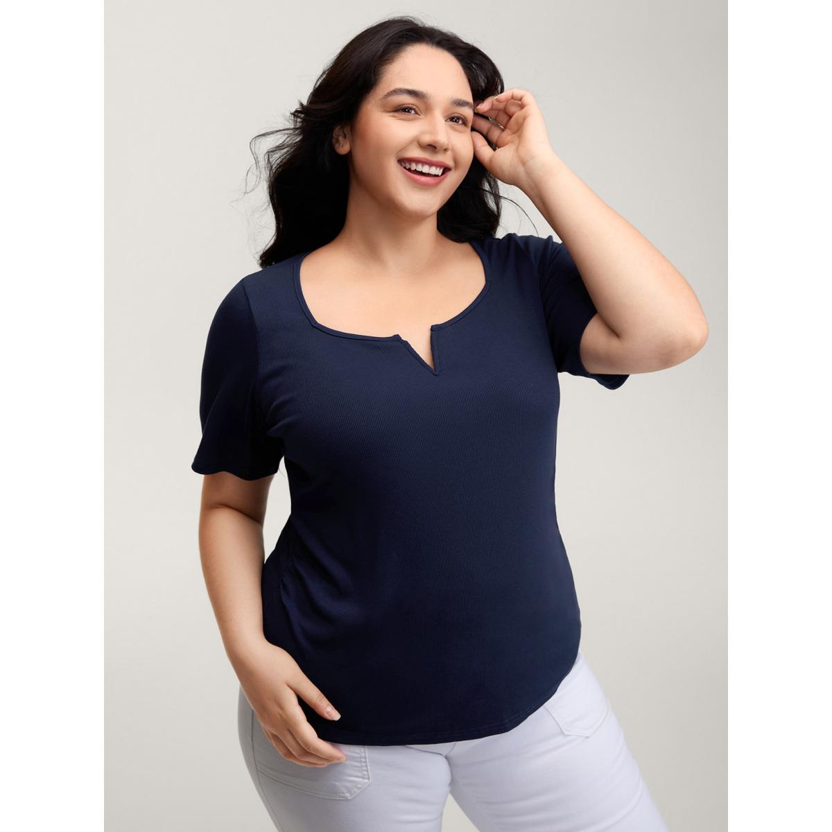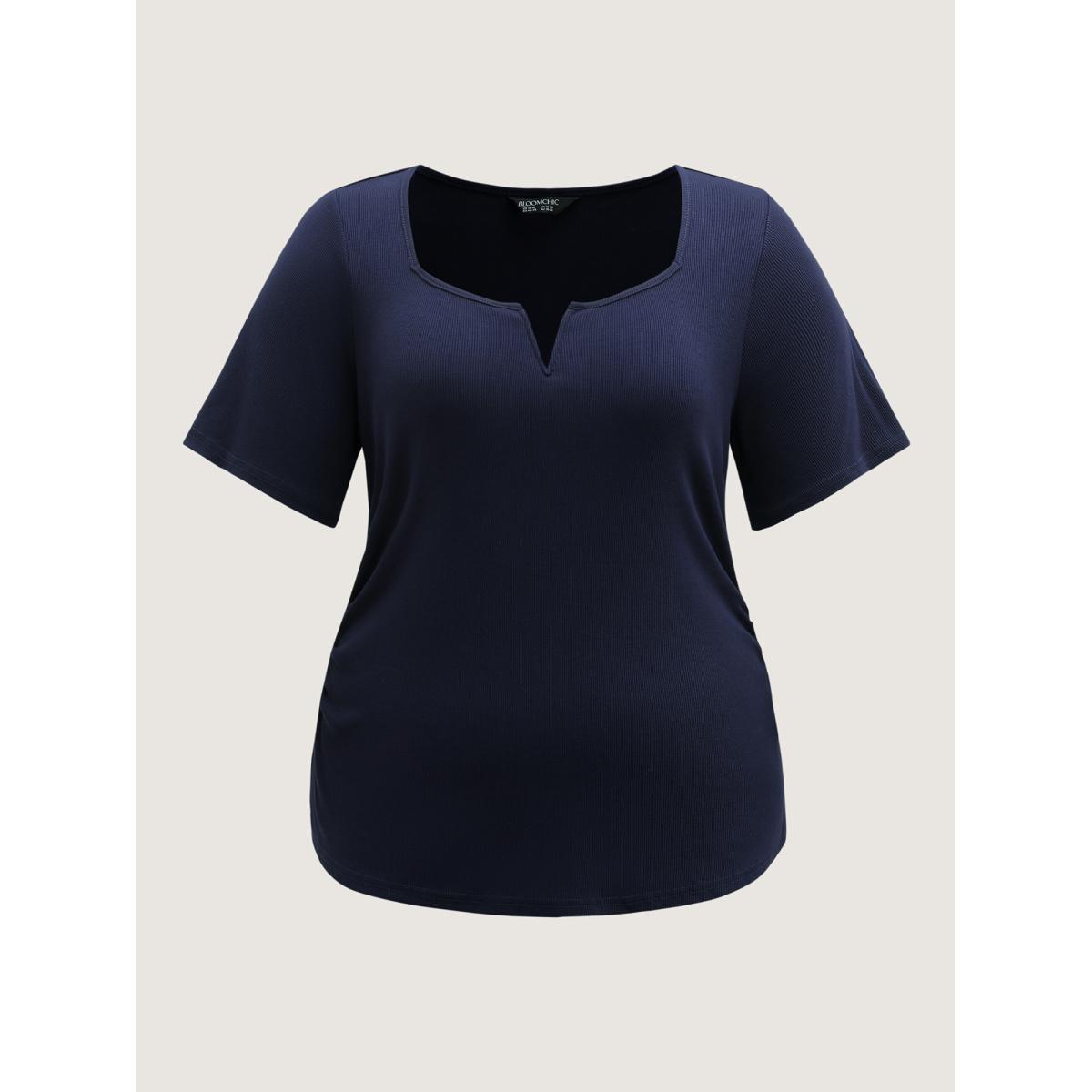 Plus Size Ribbed High Stretch Split Neck T-Shirt Indigo Women Leisure Texture Flat collar with V-notch Bodycon Casual T-shirts BloomChic 14-16/1X