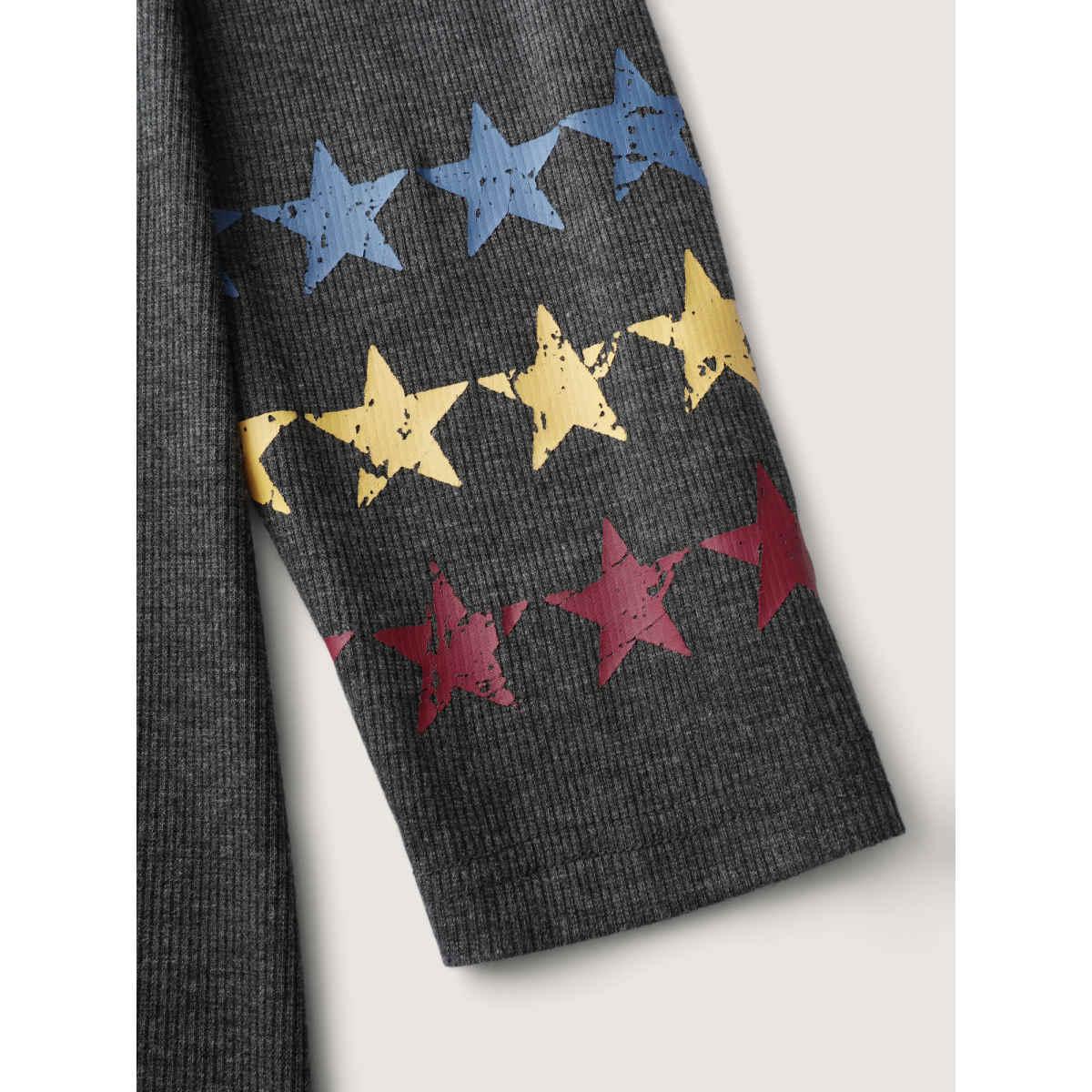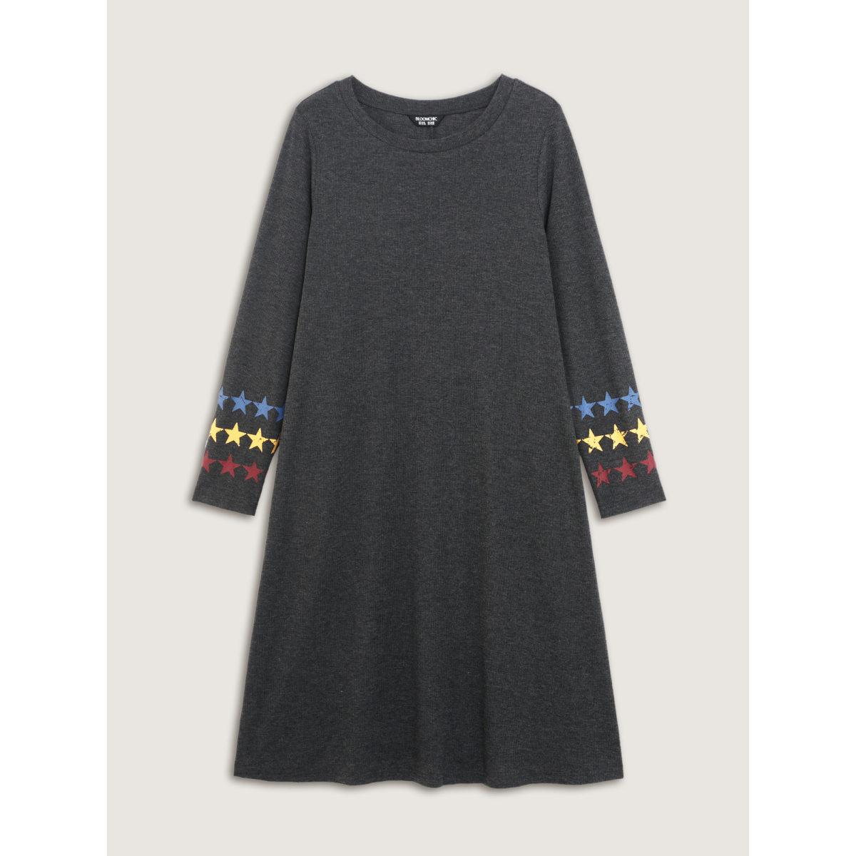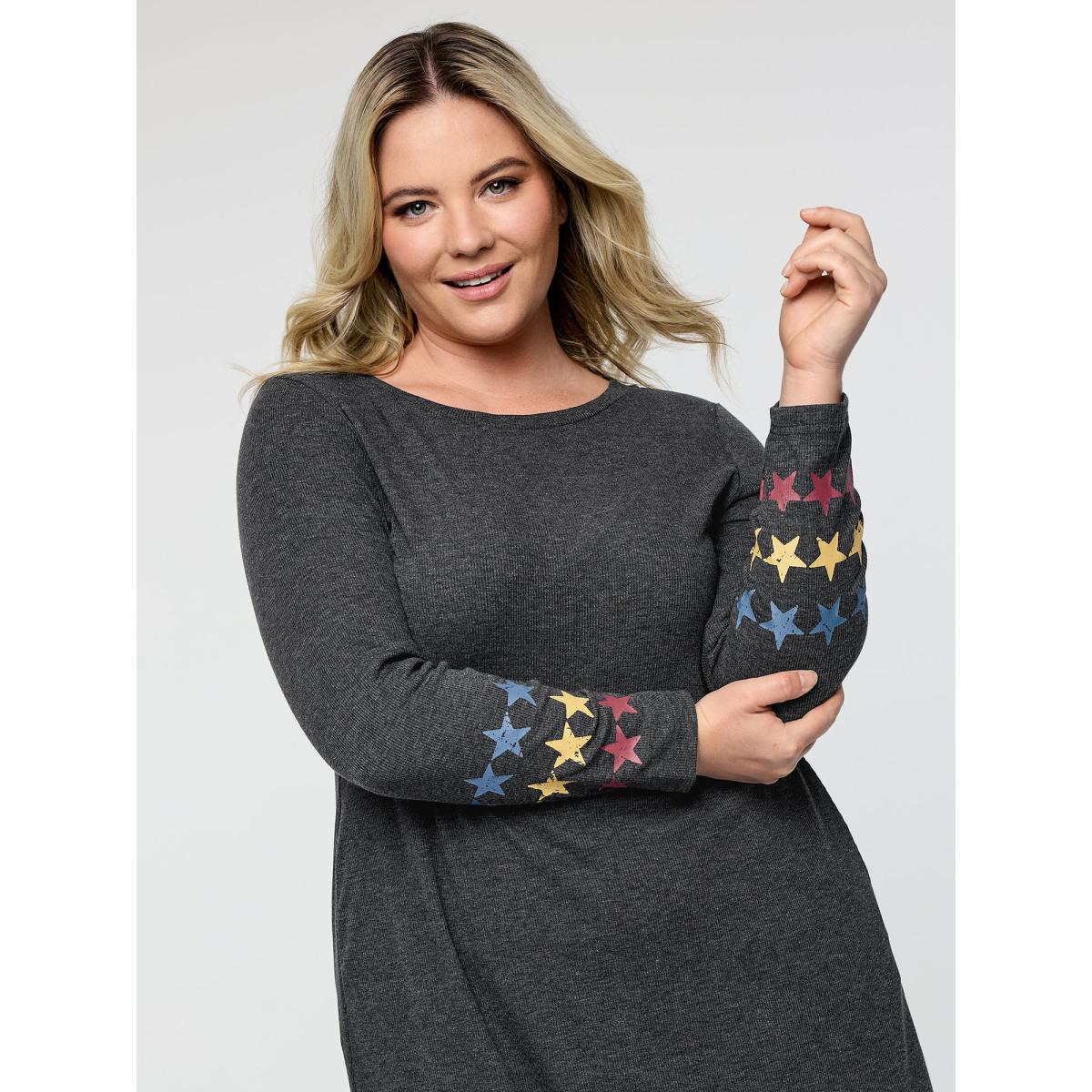 Plus Size Ribbed Star Print Sleeve Pockets Midi Dress Black Women Round Neck Long Sleeve Curvy BloomChic 18-20/2X