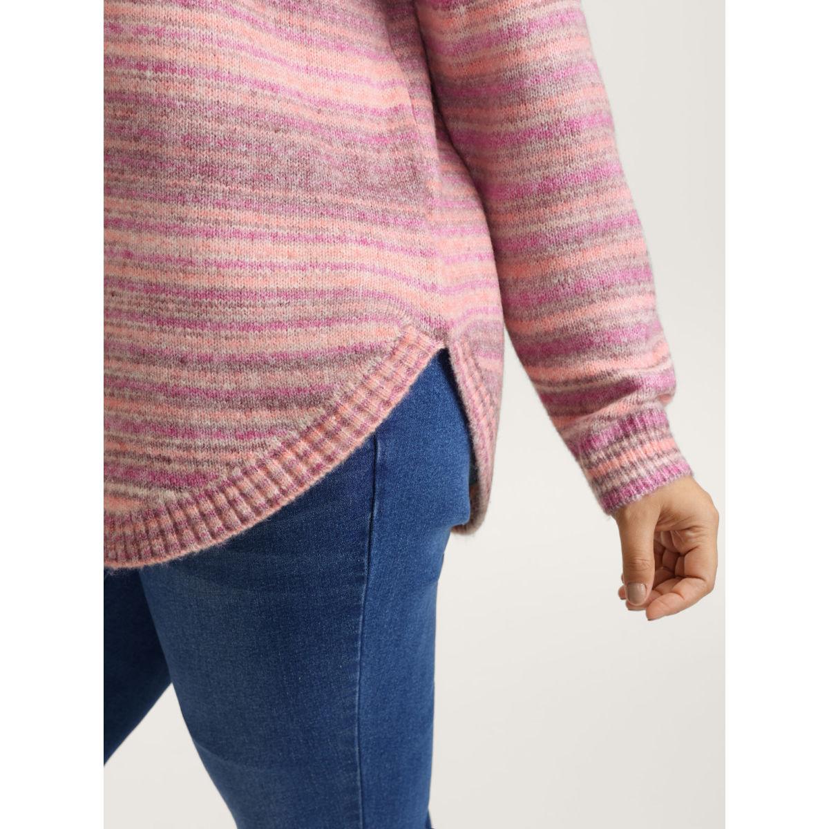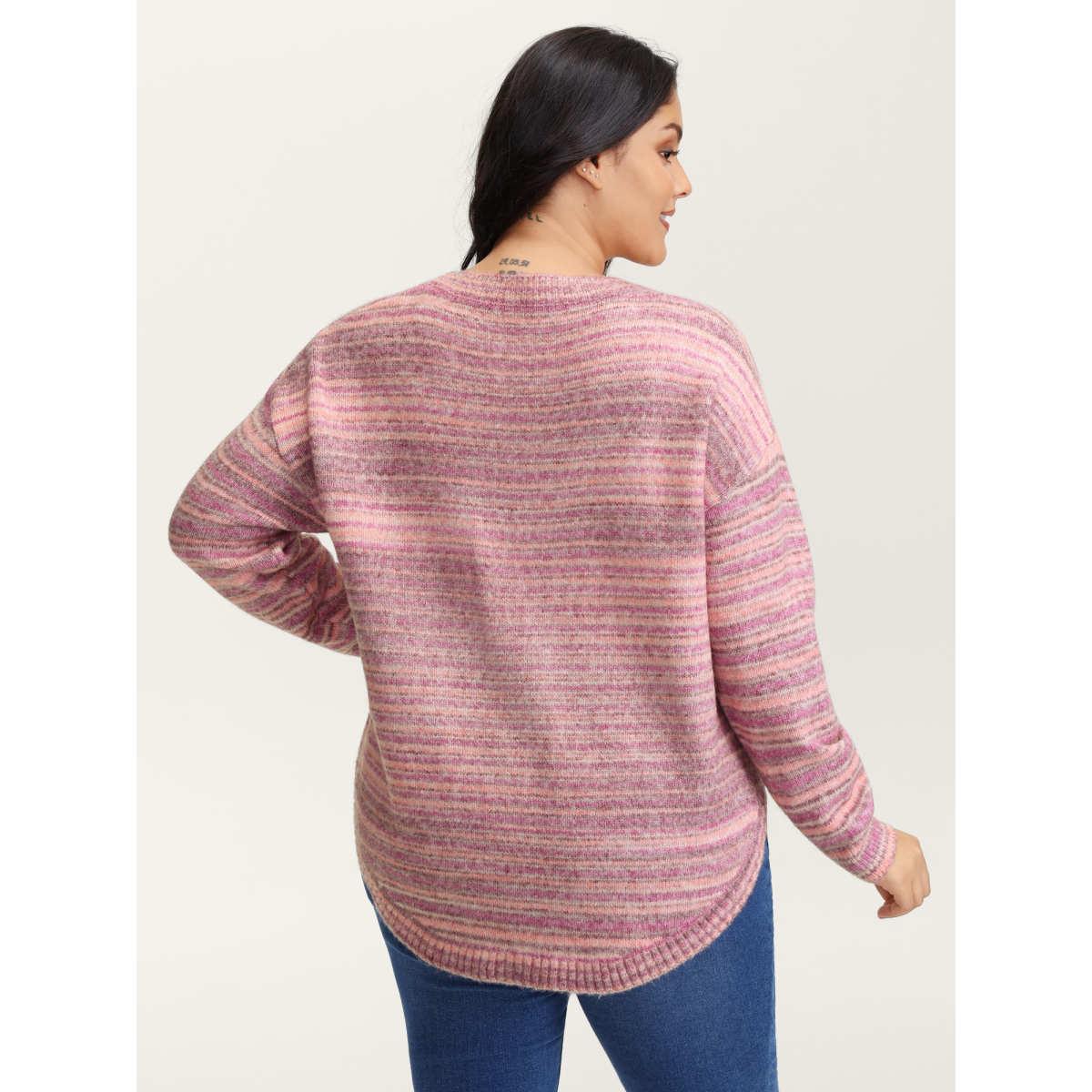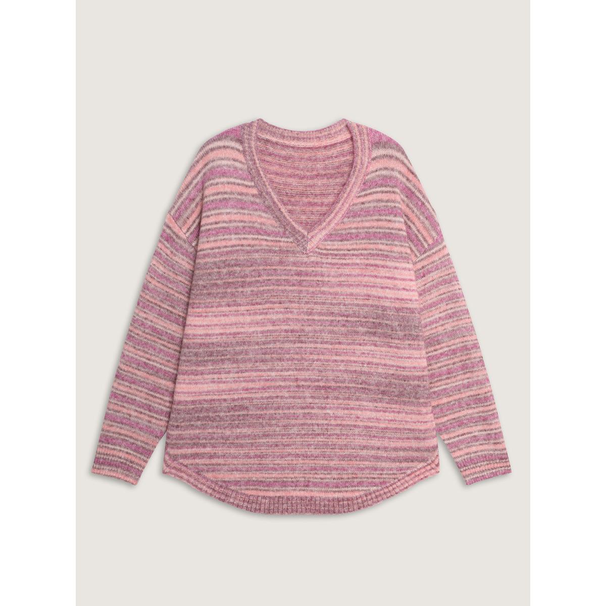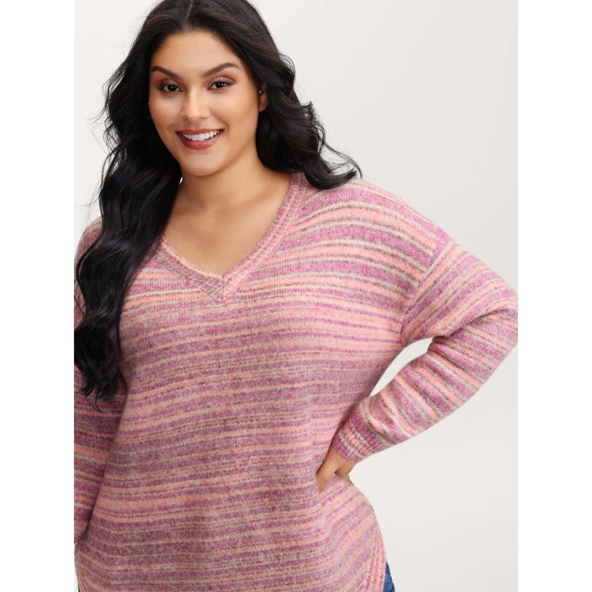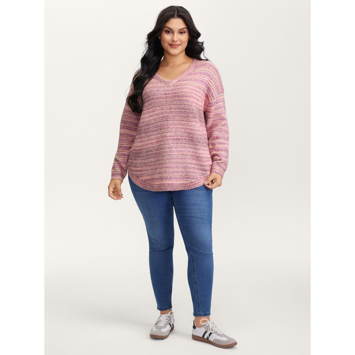 Plus Size Ribbed Texture Curvy Hem V-Neck Pullover Blush Women Playful Loose Long Sleeve V-neck Casual Pullovers BloomChic 18-20/2X