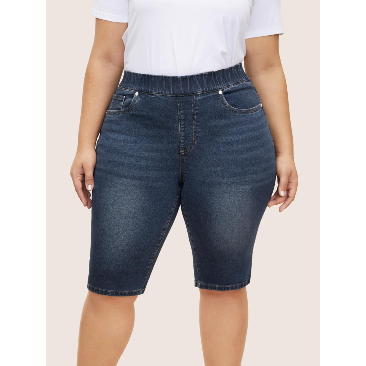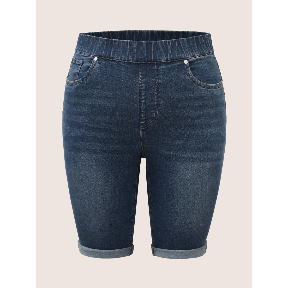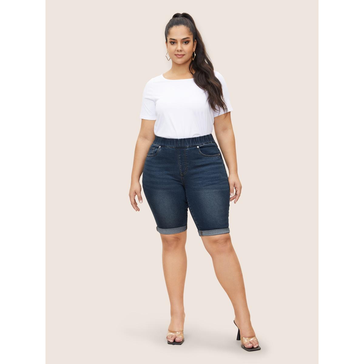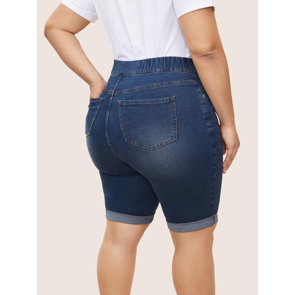 Plus Size Roll Hem Elastic Waist Dark Wash Denim Shorts Women Stone Roll Hem Mid Rise High stretch Casual Slanted pocket Leisure Denim Shorts BloomChic 14/1X