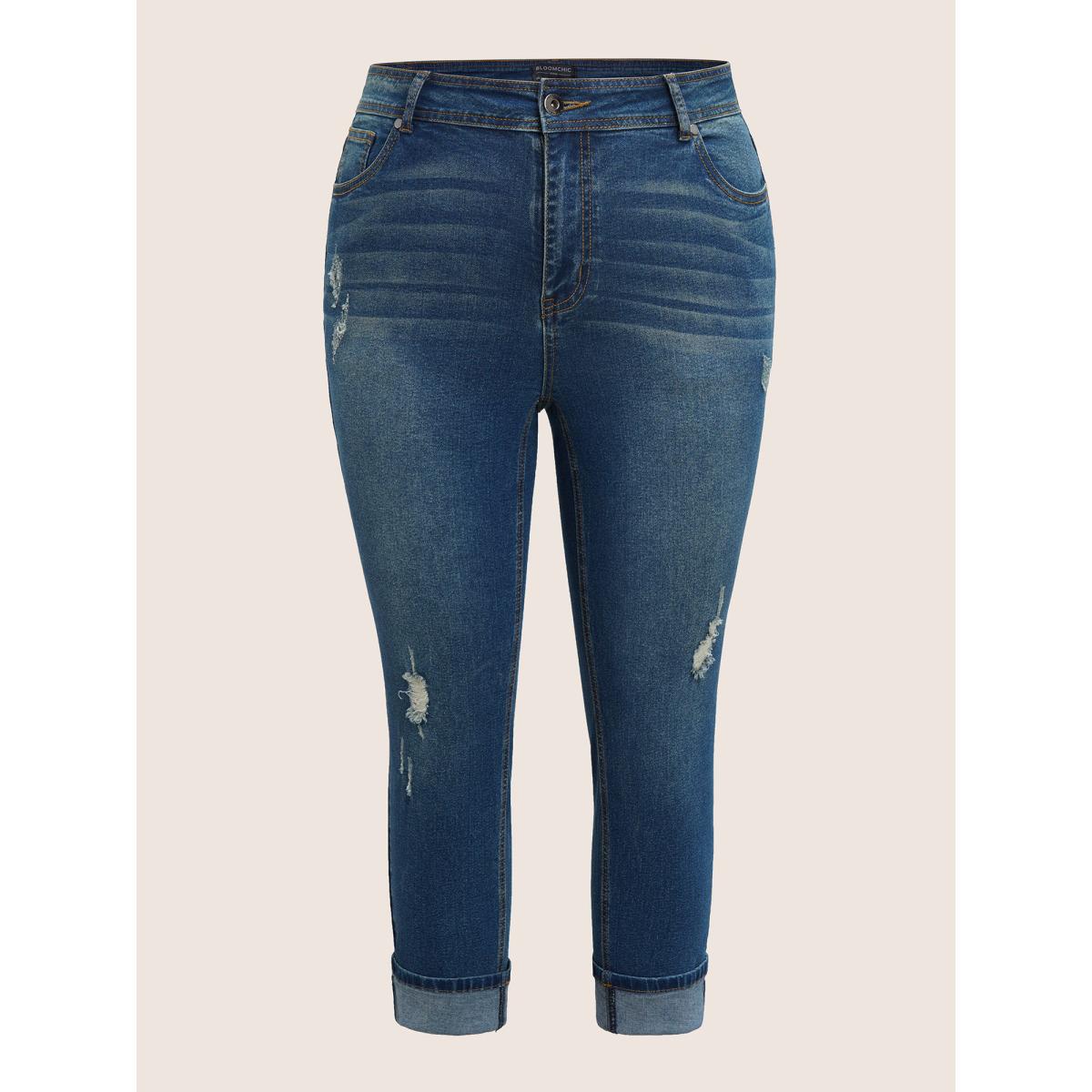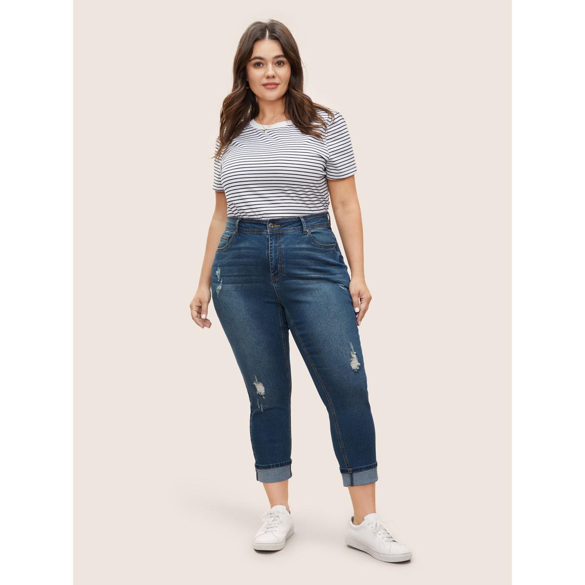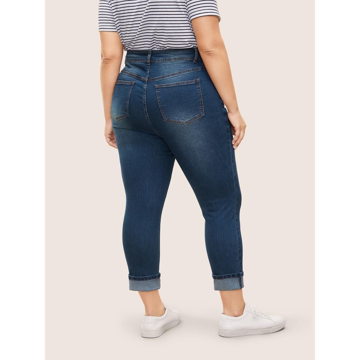 Plus Size Very Stretchy Dark Wash Roll Hem Cropped Jeans Women Blue Casual Plain Distressed High stretch Patch pocket Jeans BloomChic 14/1X