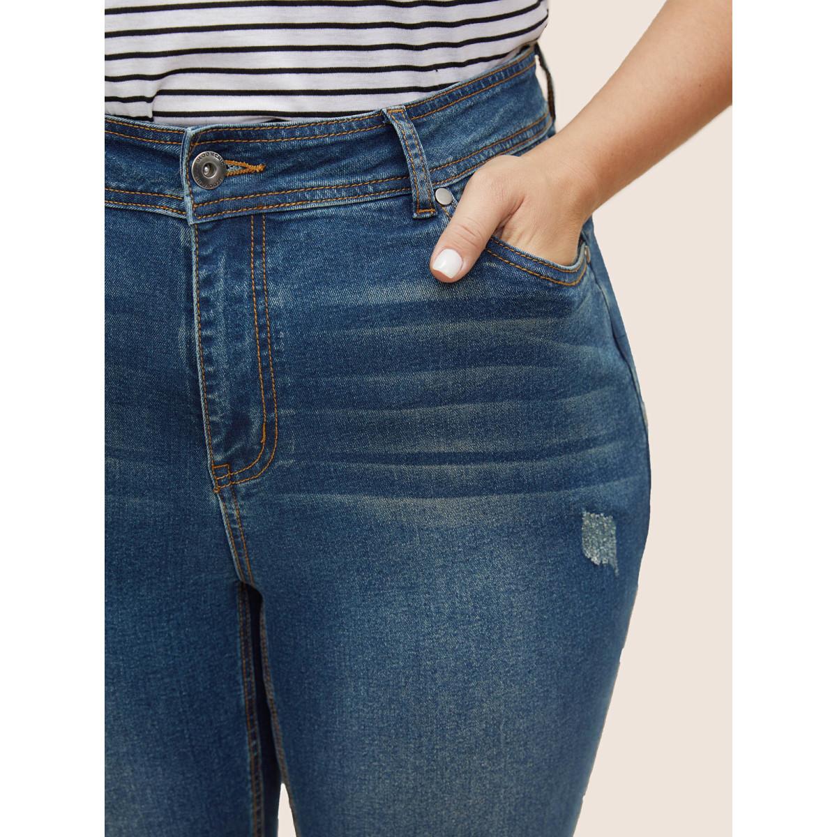 Plus Size Solid Frayed Roll Hem High Rise Jeans Women Blue Casual Plain Plain High stretch Pocket Jeans BloomChic 16/1X