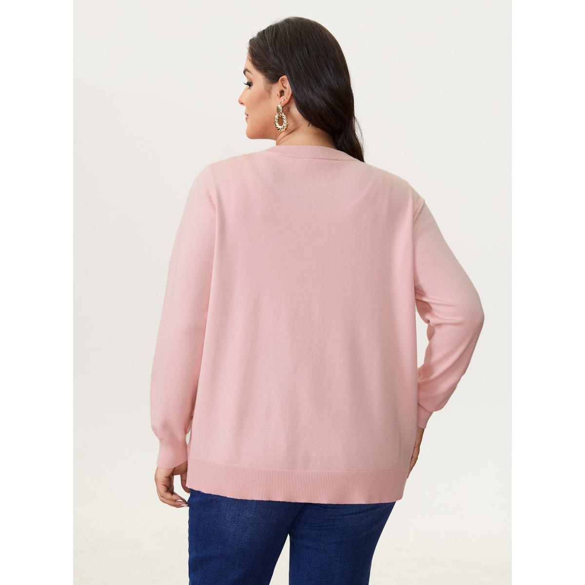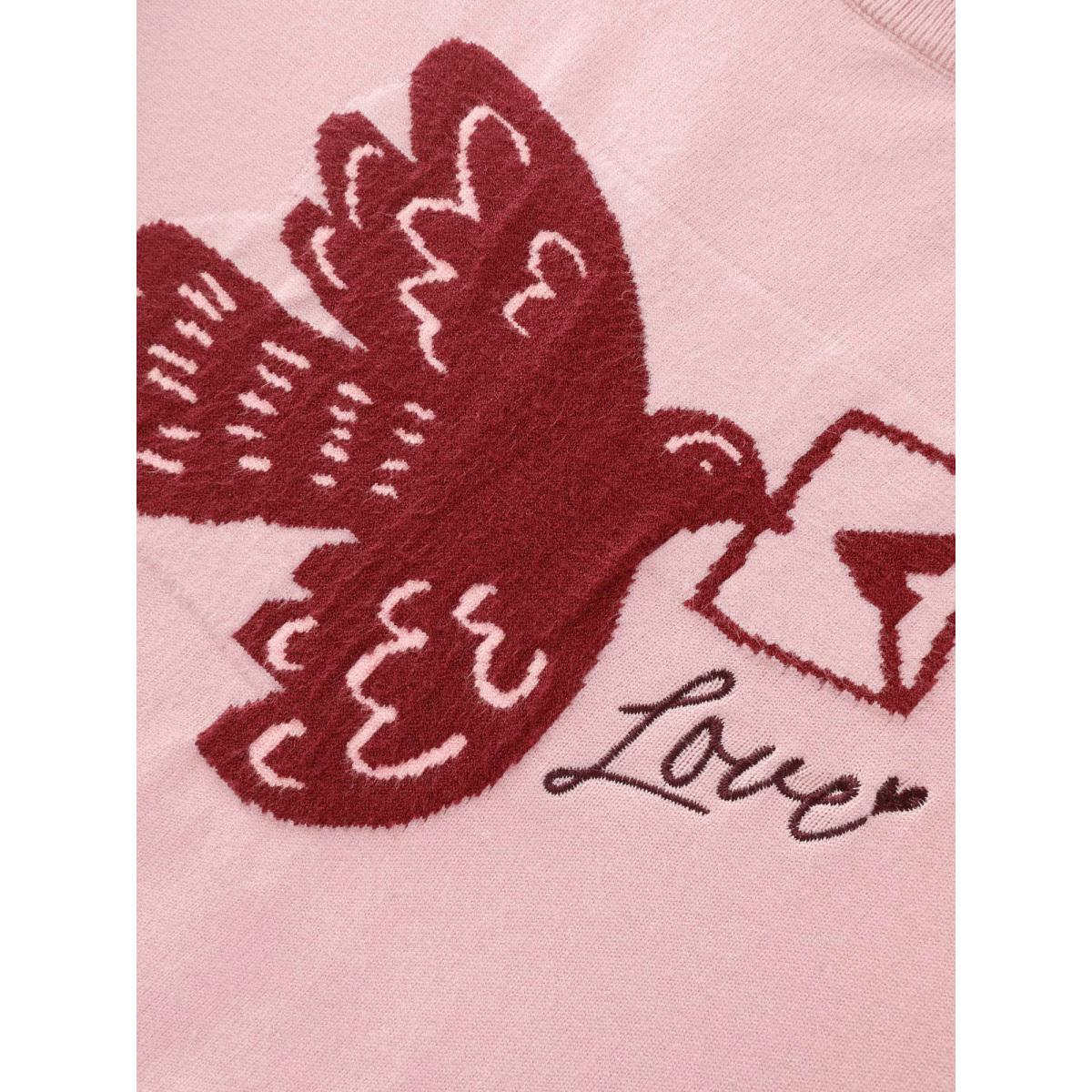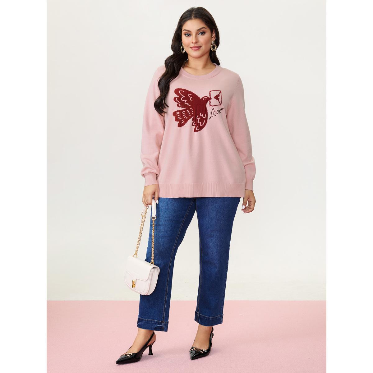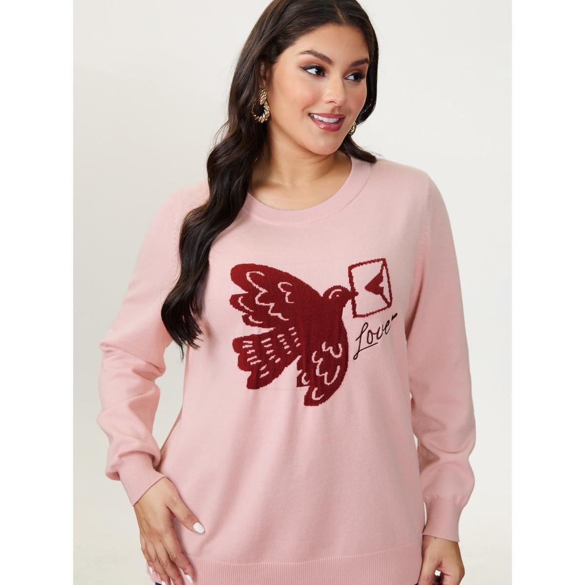 Plus Size Romantic Pigeon Jacquard Pattern Pullover Nudepink Women Playful Loose Long Sleeve Round Neck Elegant Pullovers BloomChic 14-16/1X