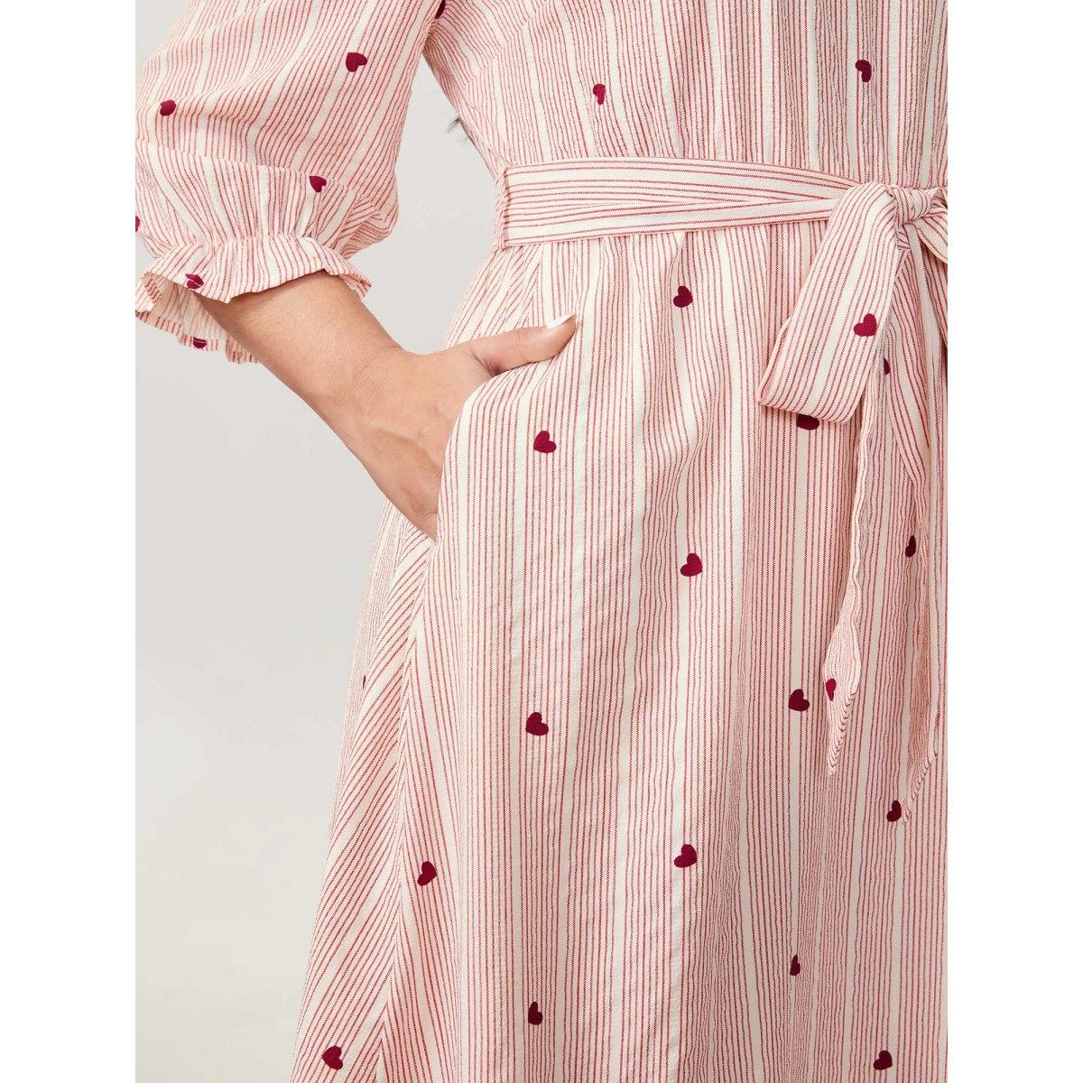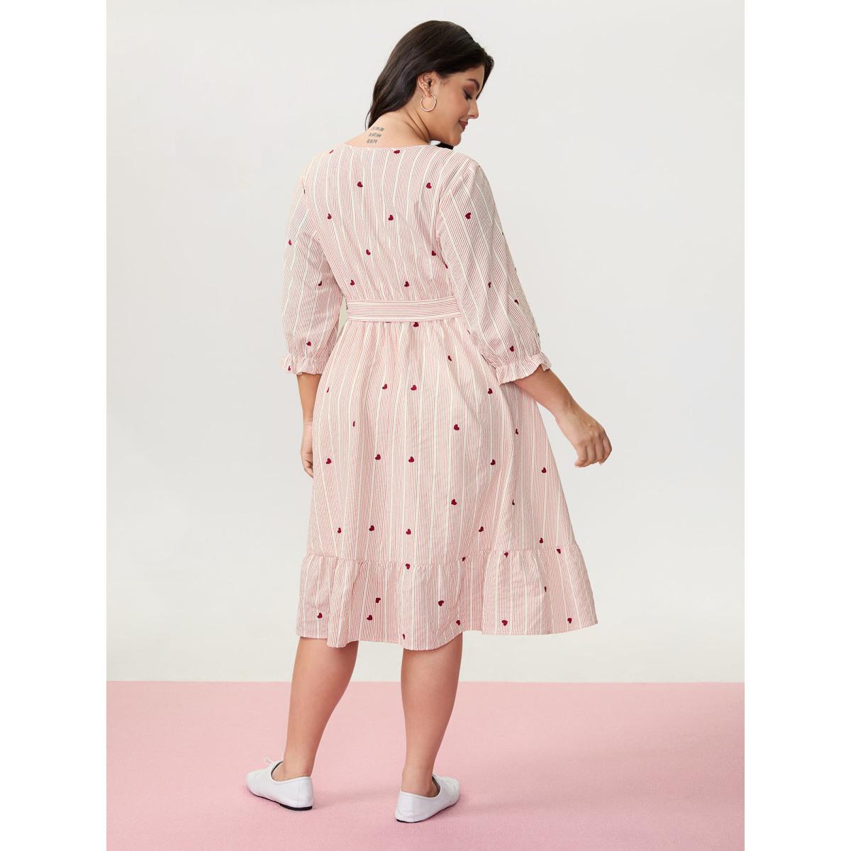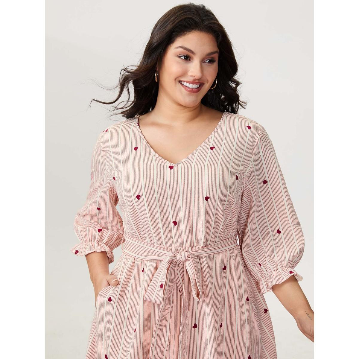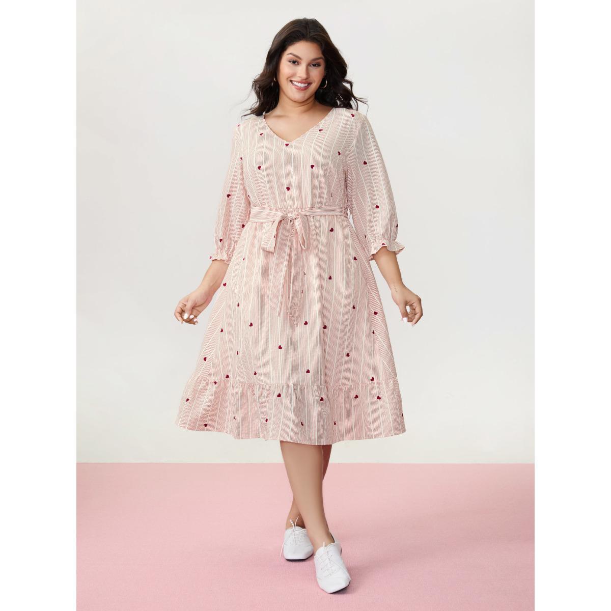 Plus Size Romantic Ruffled Sleeve Pleated Waist Midi Dress Originalwhite Women Playful Belted V-neck Elbow-length sleeve Curvy BloomChic 12/L