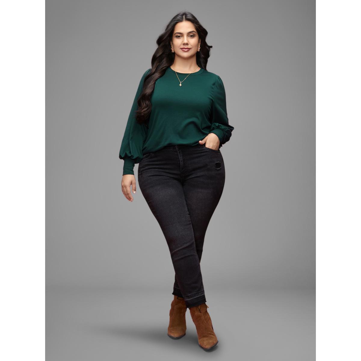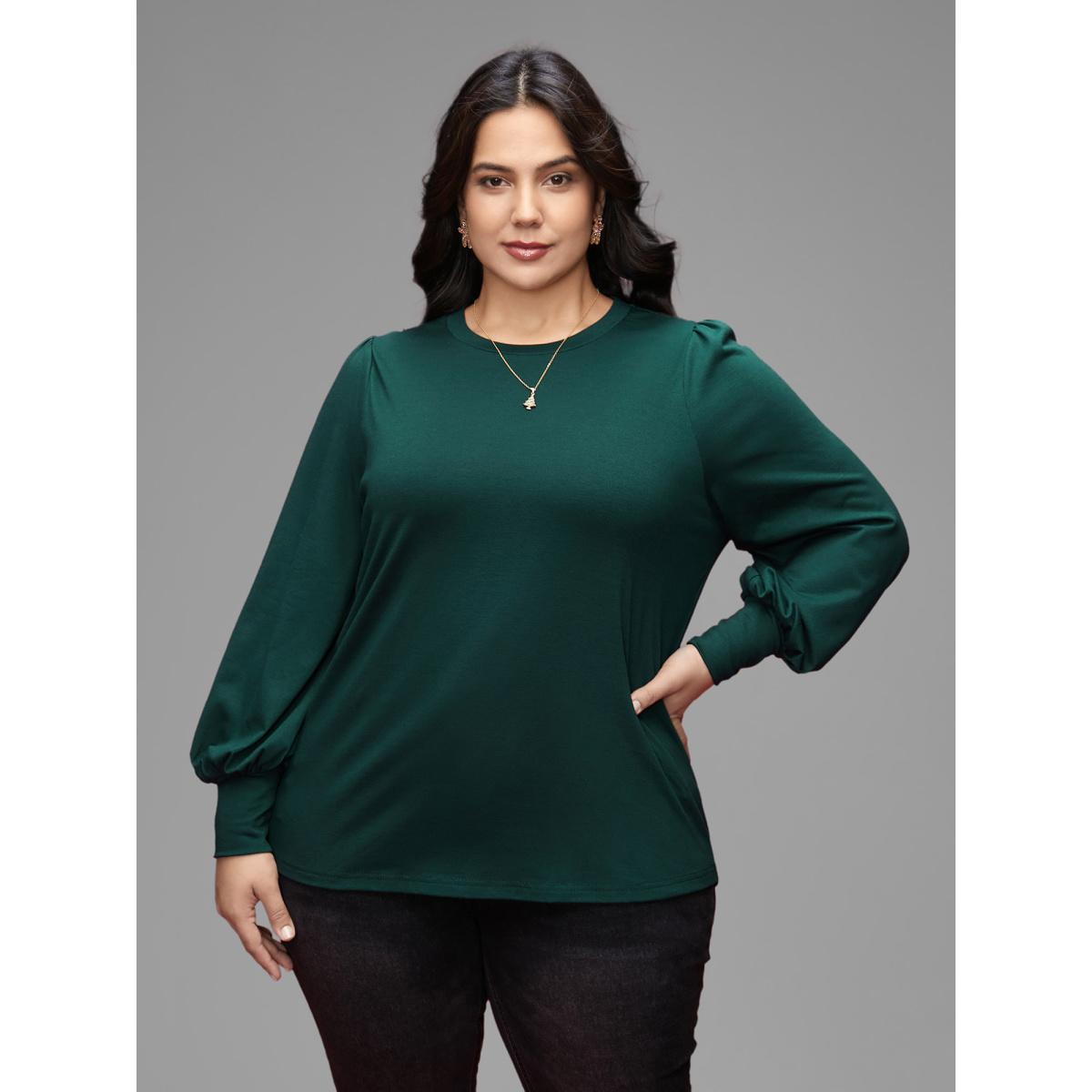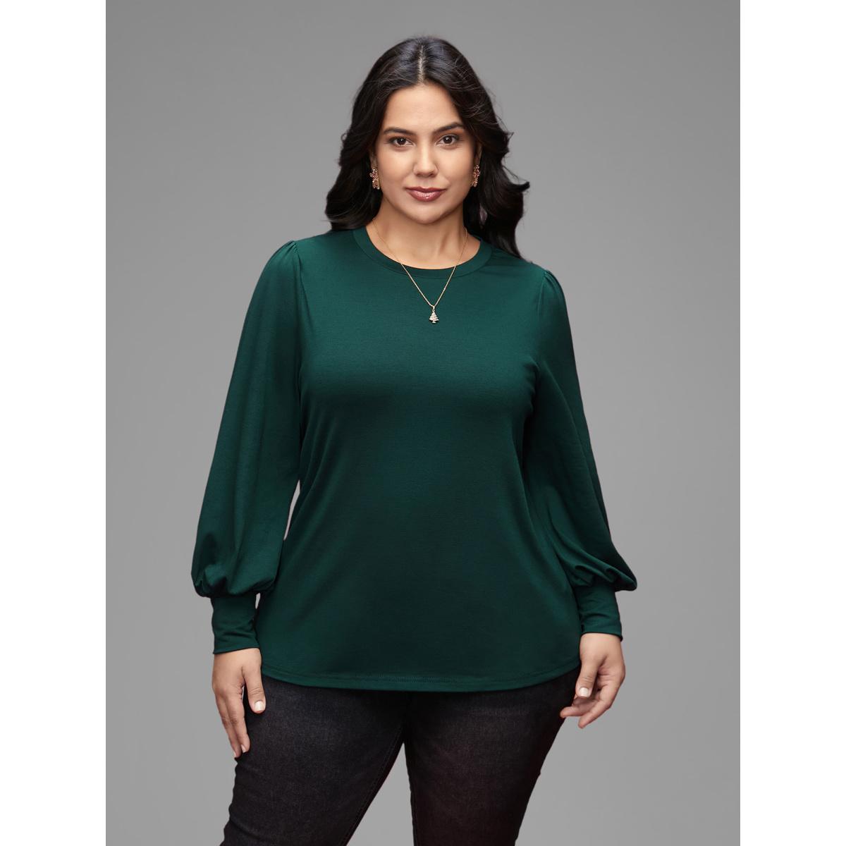 Plus Size Round Neck Balloon Sleeves A-line Tee DarkGreen Women Timeless Gathered Plain Round Neck Elegant T-shirts BloomChic 10/M