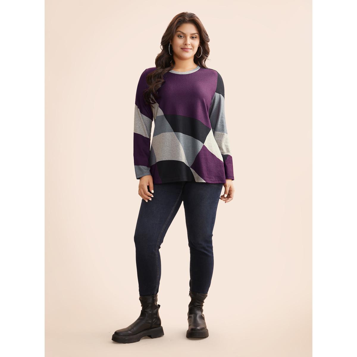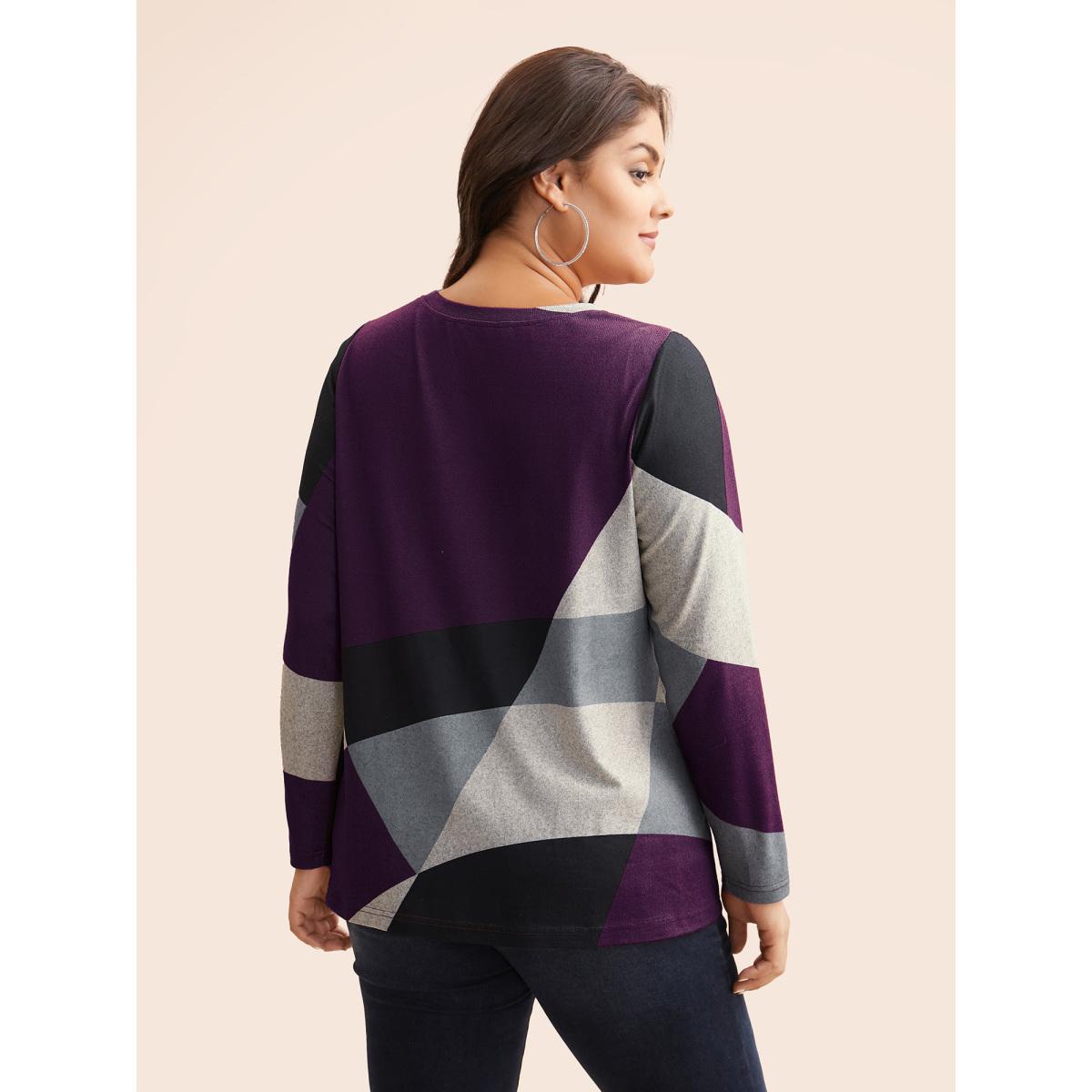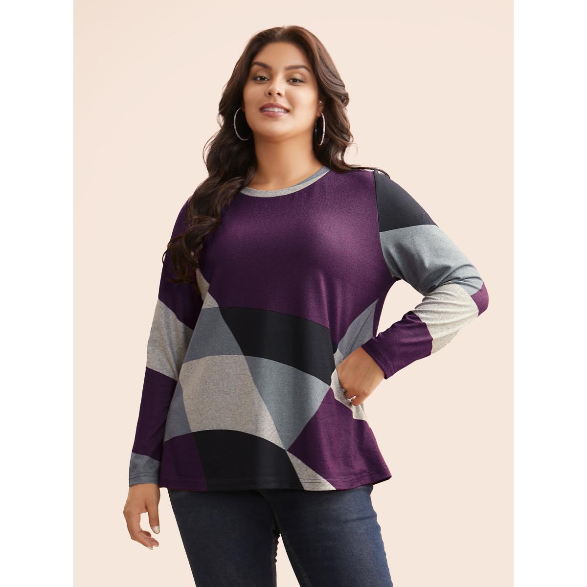 Plus Size Round Neck Colorblock Contrast T-shirt Eggplant Women Leisure Contrast Non Casual T-shirts BloomChic 22-24/3X