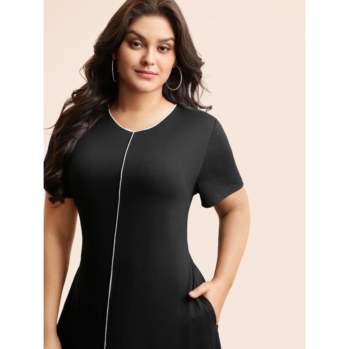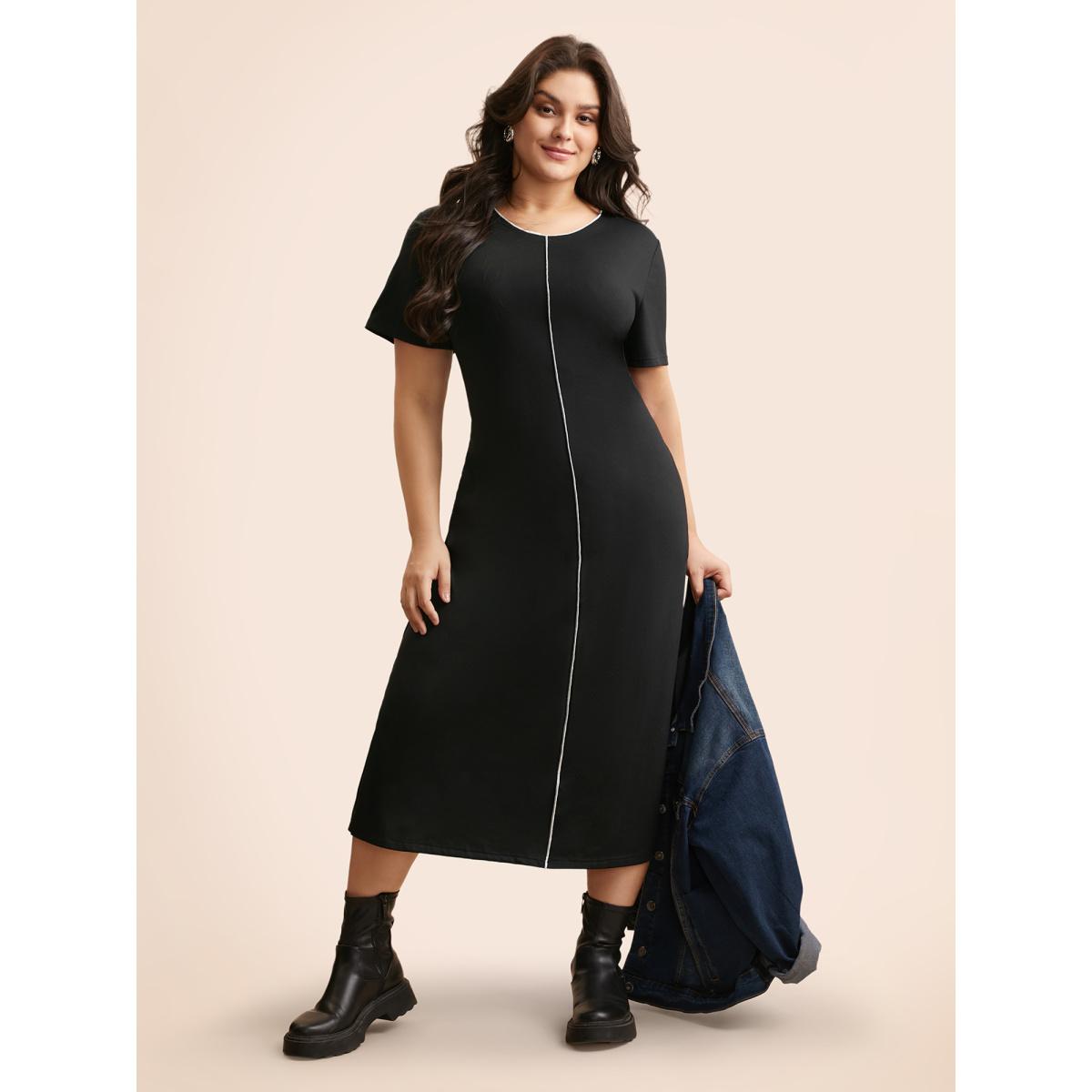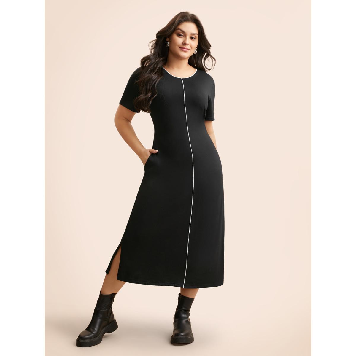 Plus Size Round Neck Contrast Topstitching Slit Hem Dress Black Women Casual Topstitching Round Neck Short sleeve Curvy BloomChic 28/5X
