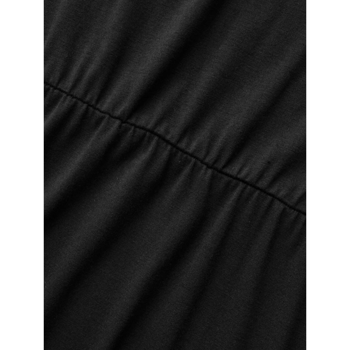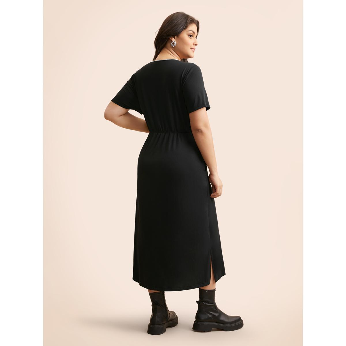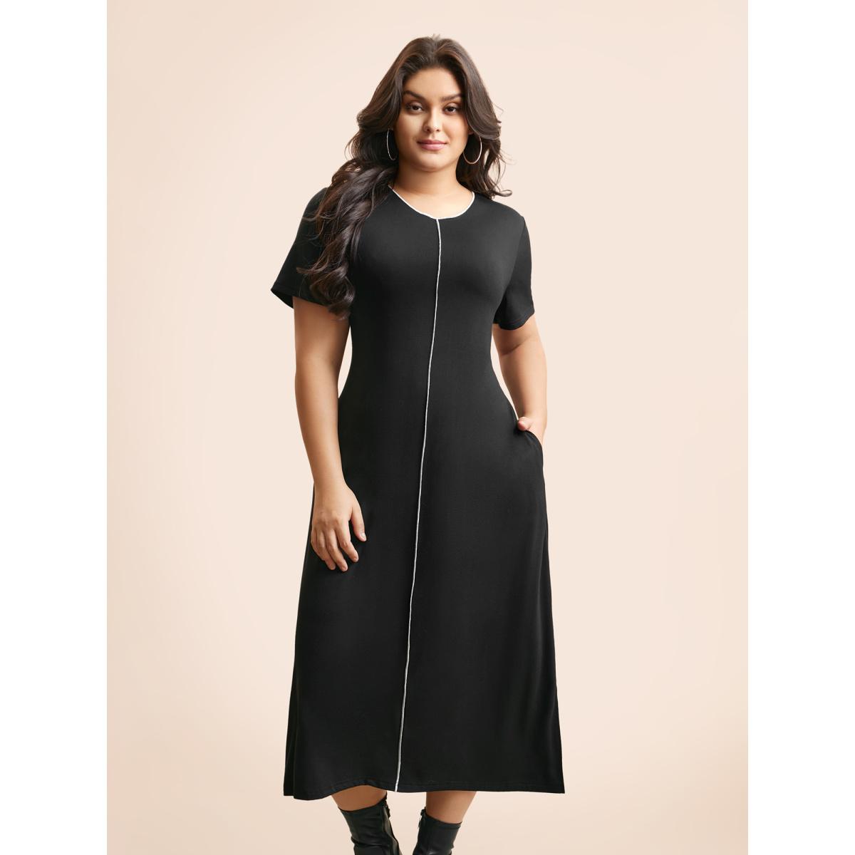 Plus Size Round Neck Contrast Topstitching Slit Hem Dress Black Women Casual Topstitching Round Neck Short sleeve Curvy BloomChic 28/5X