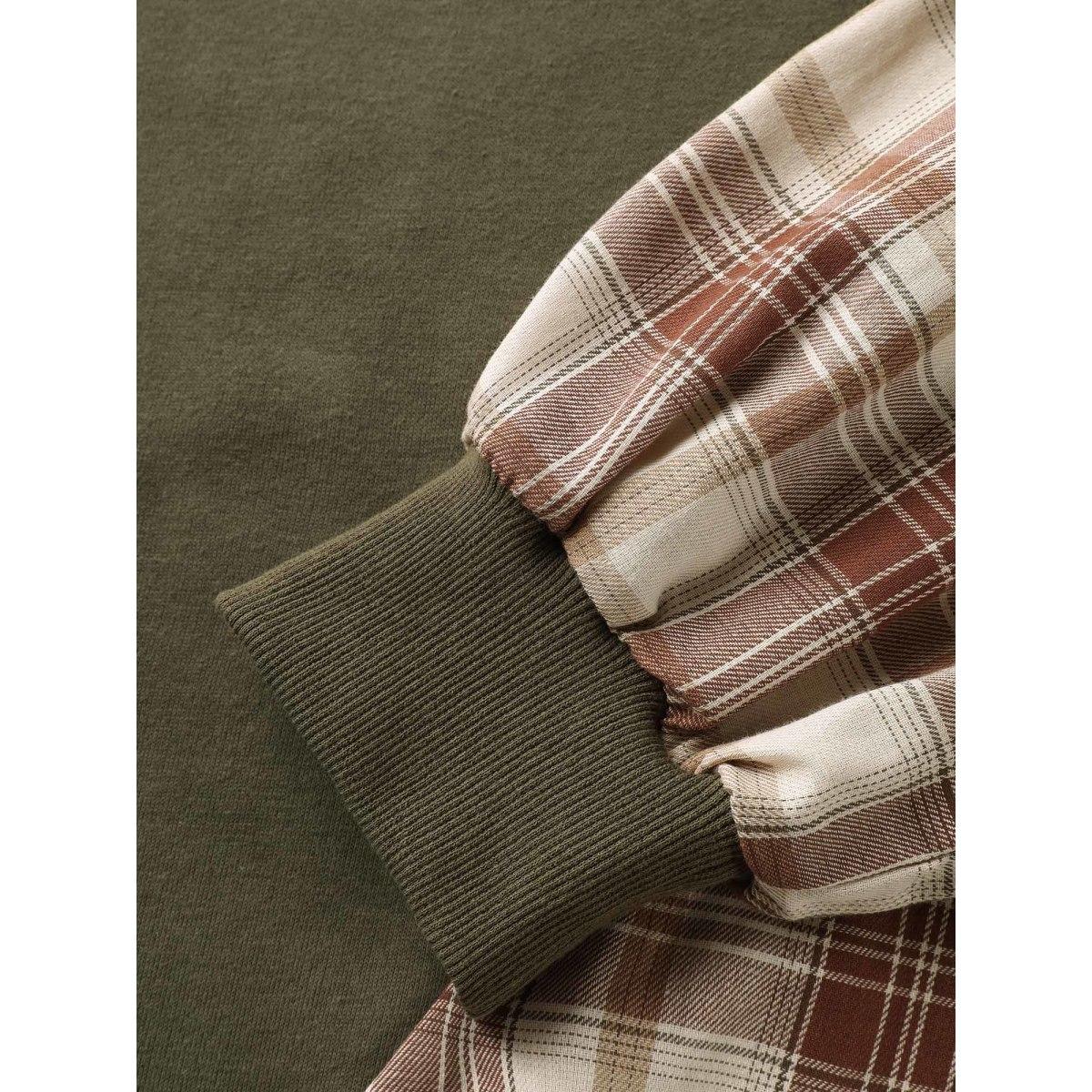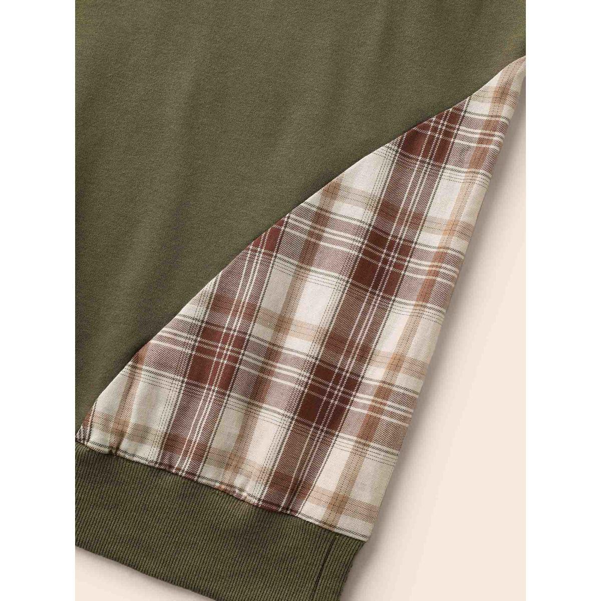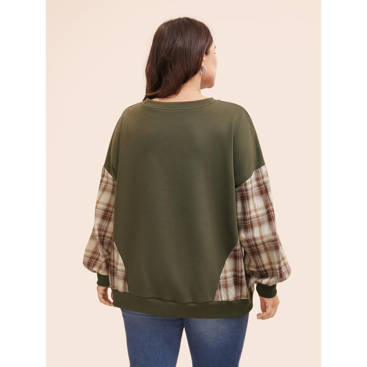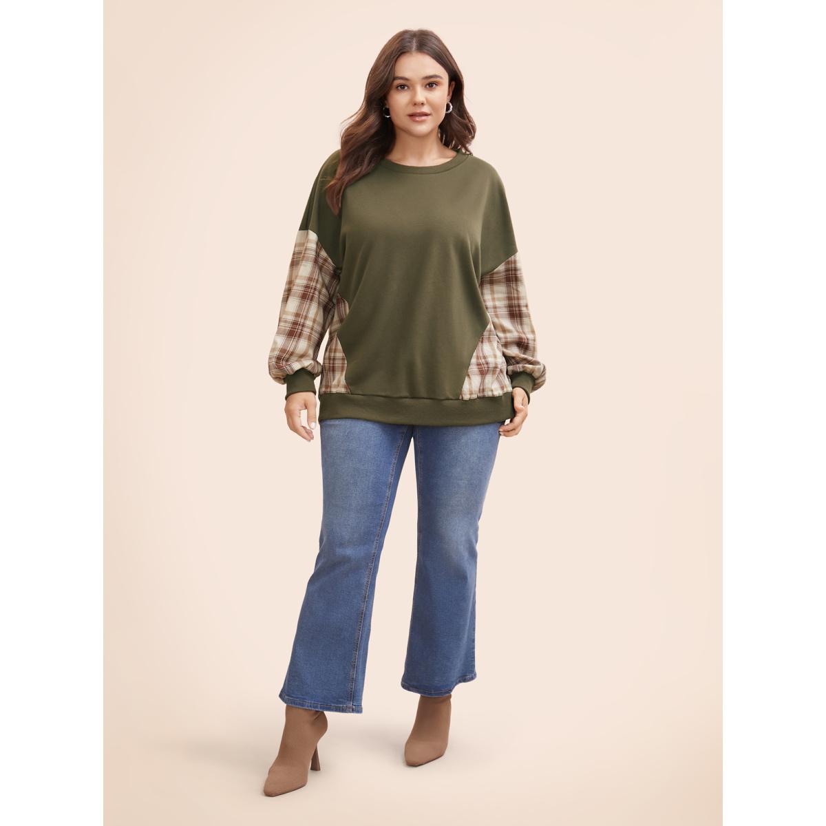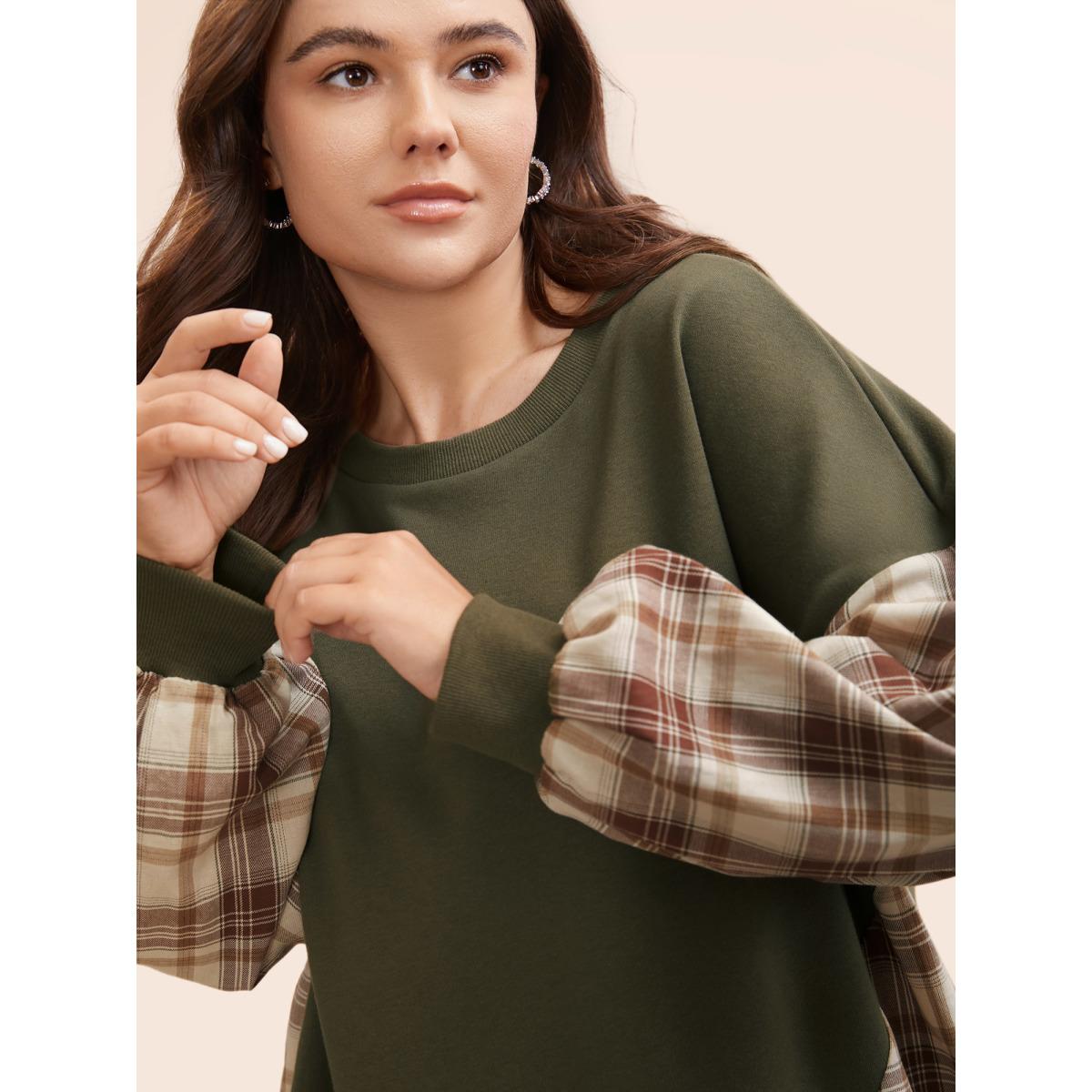Plus Size Round Neck Gingham Patchwork Sweatshirt Women Sage Elegant Contrast Round Neck Everyday Sweatshirts BloomChic 10/M
