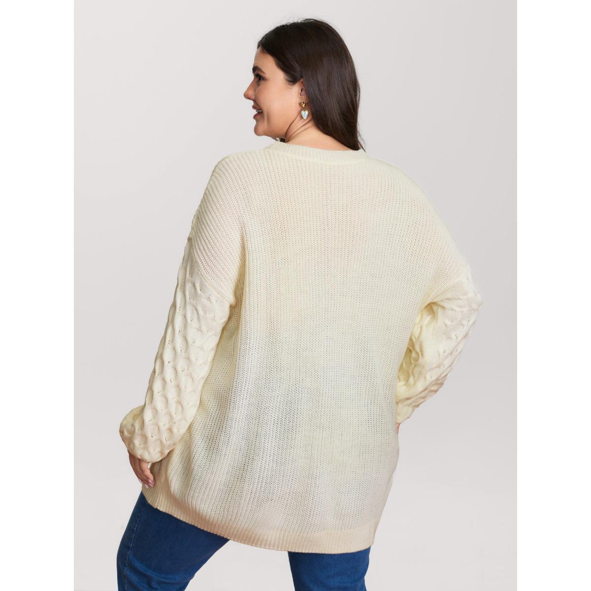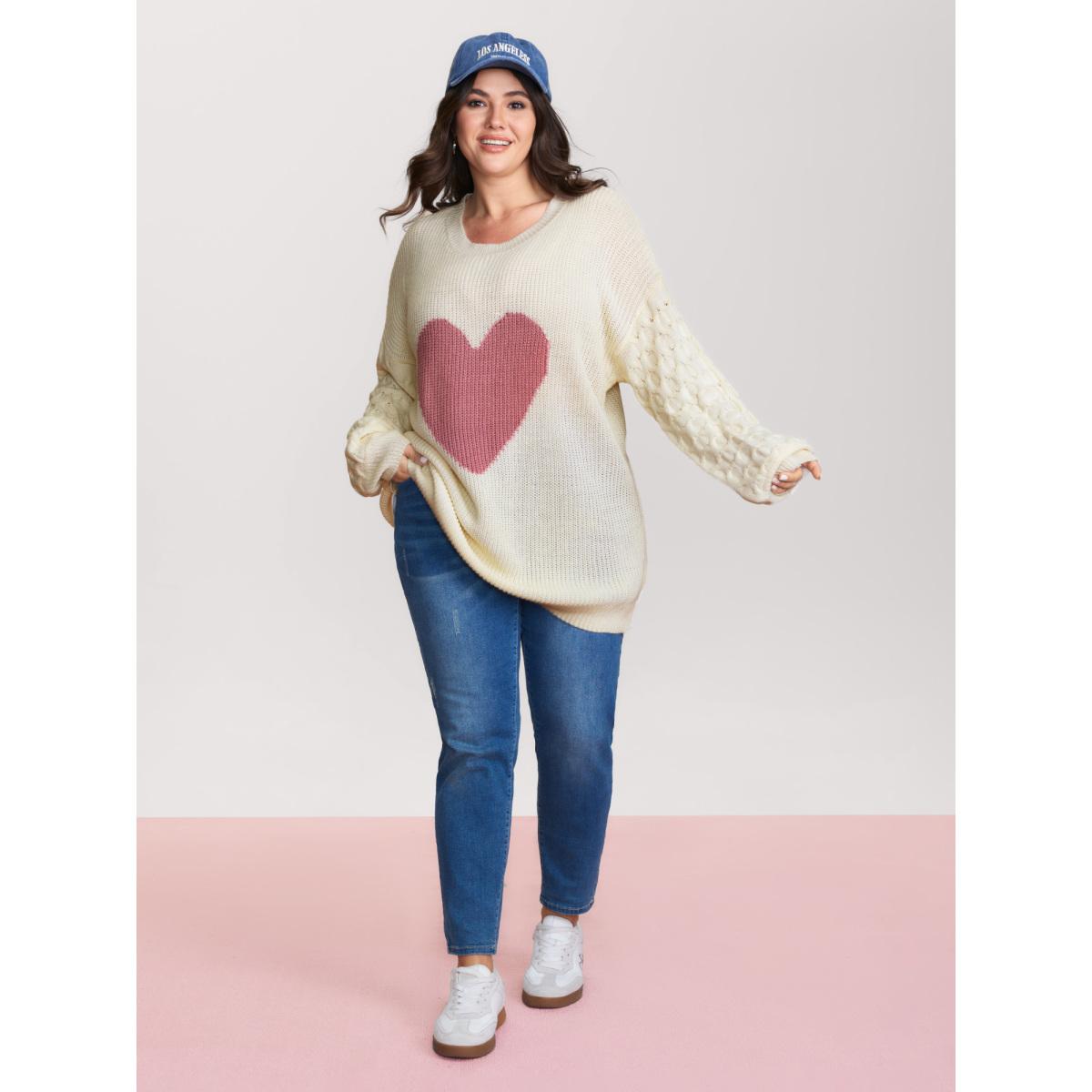 Plus Size Round Neck Heart Cable Knit Pullover Ivory Women Playful Loose Long Sleeve Round Neck Casual Pullovers BloomChic 14-16/1X