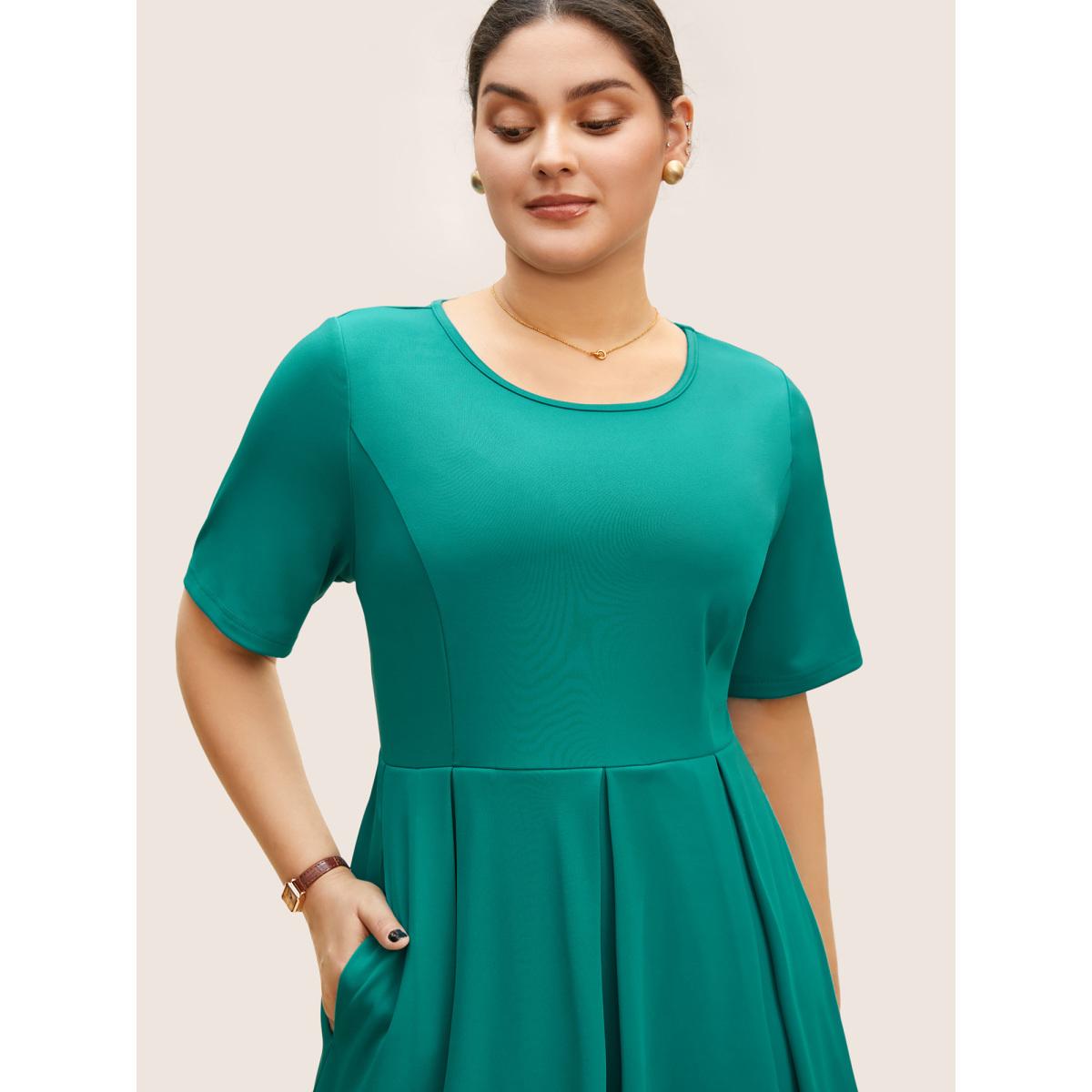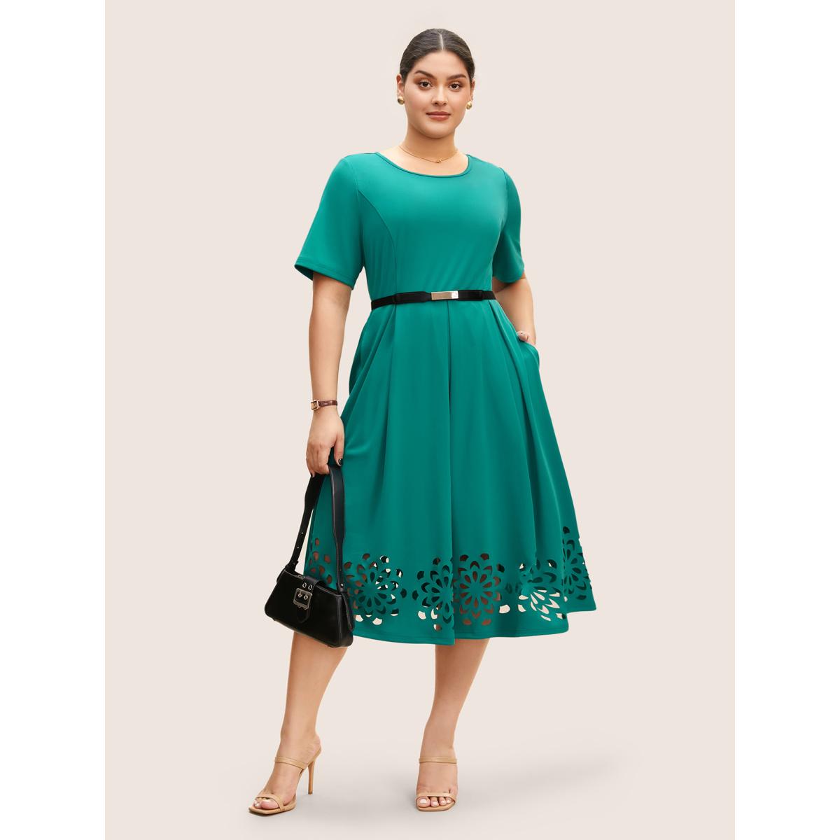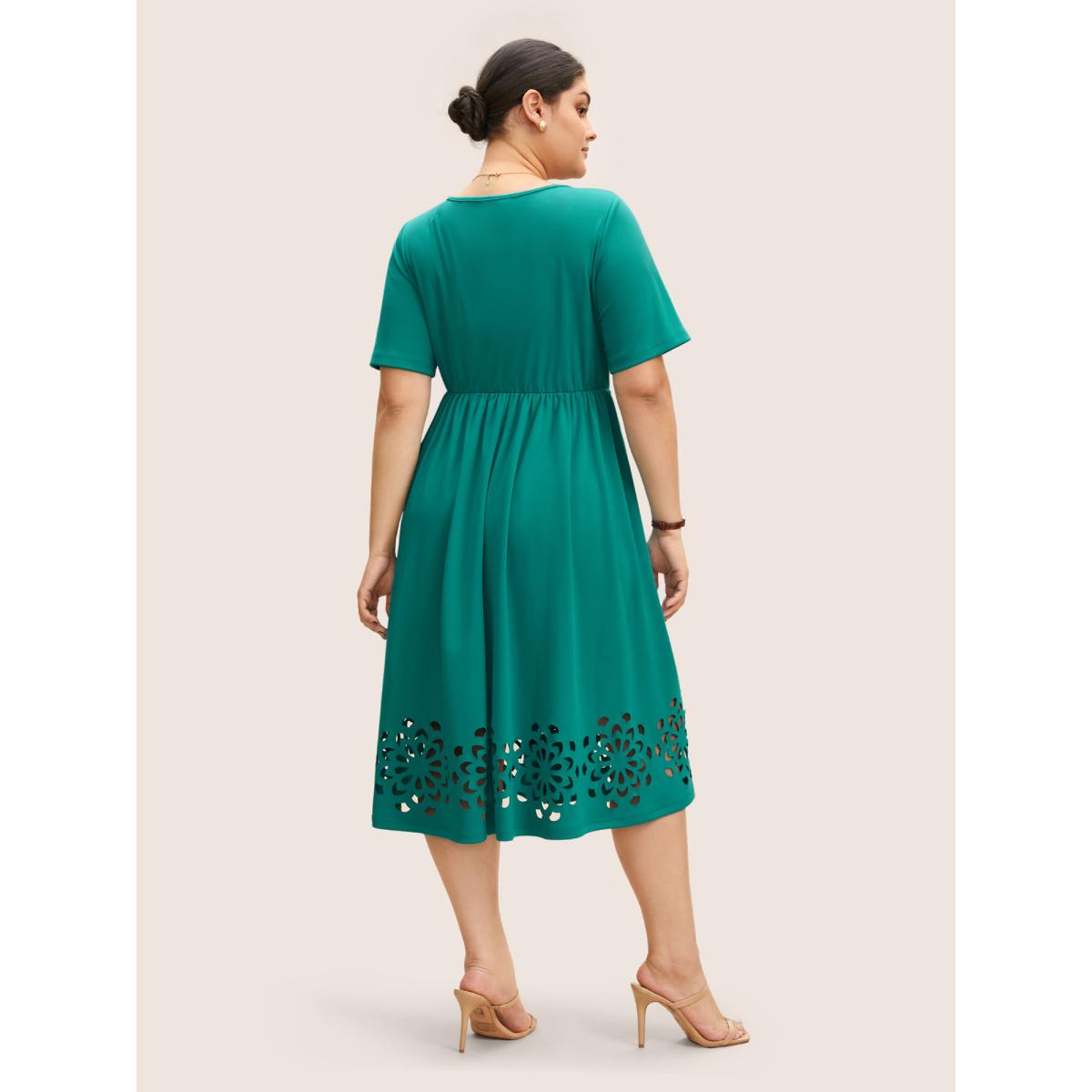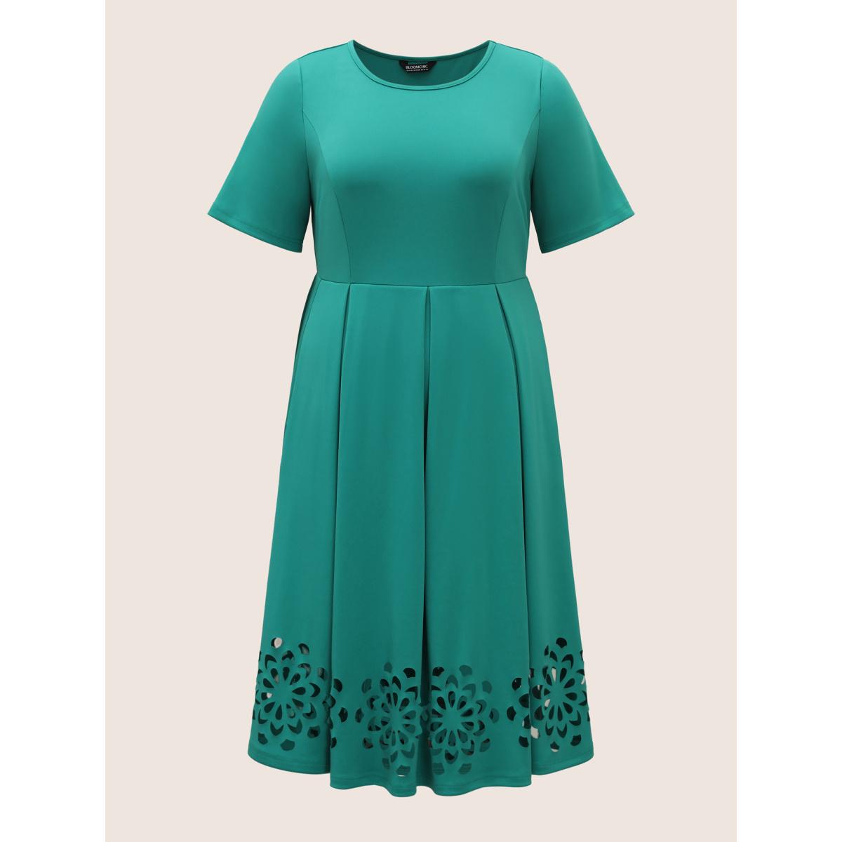 Plus Size Round Neck Laser Cut Plicated Detail Midi Dress Malachitegreen Women Work From Home Pleated Round Neck Short sleeve Curvy BloomChic 10/M