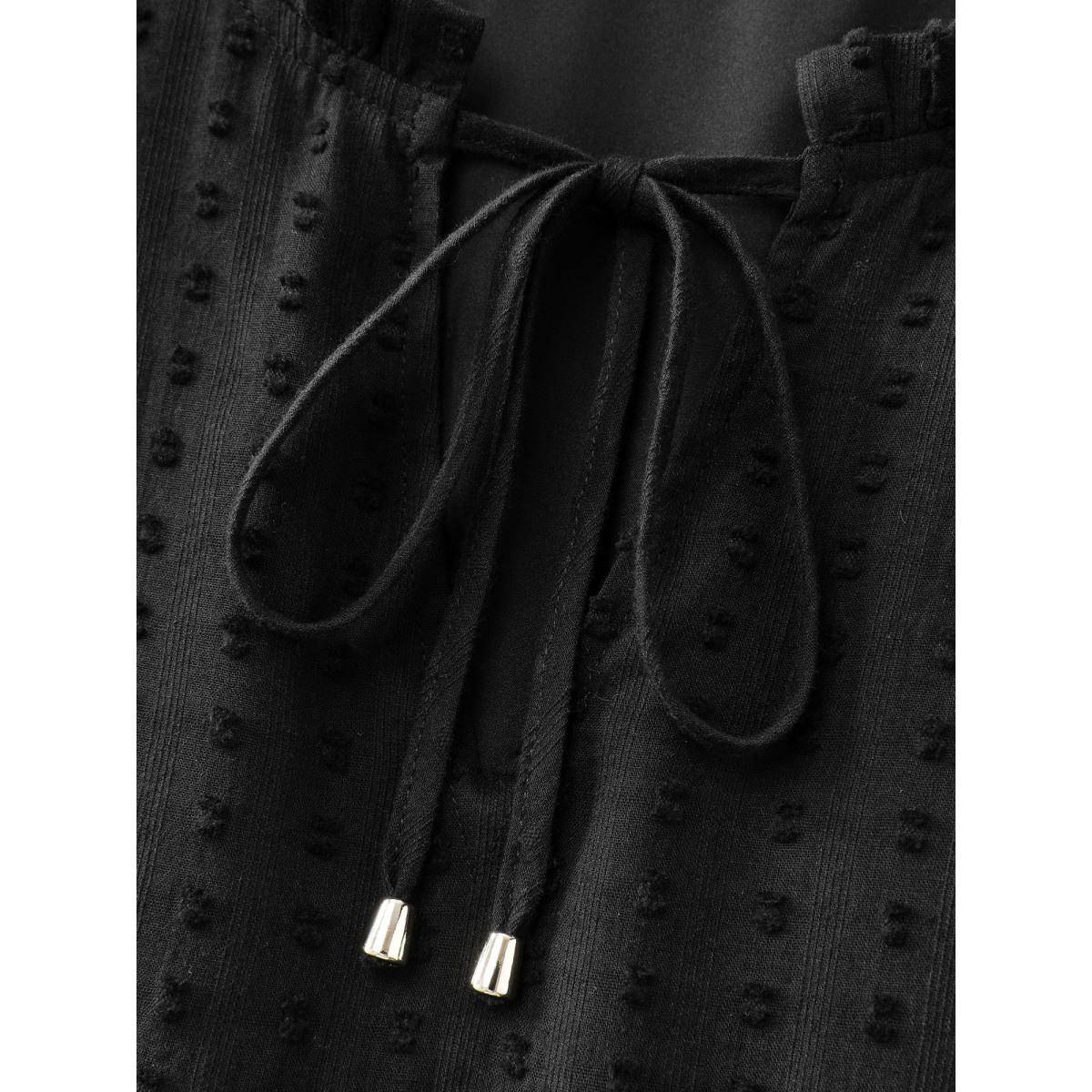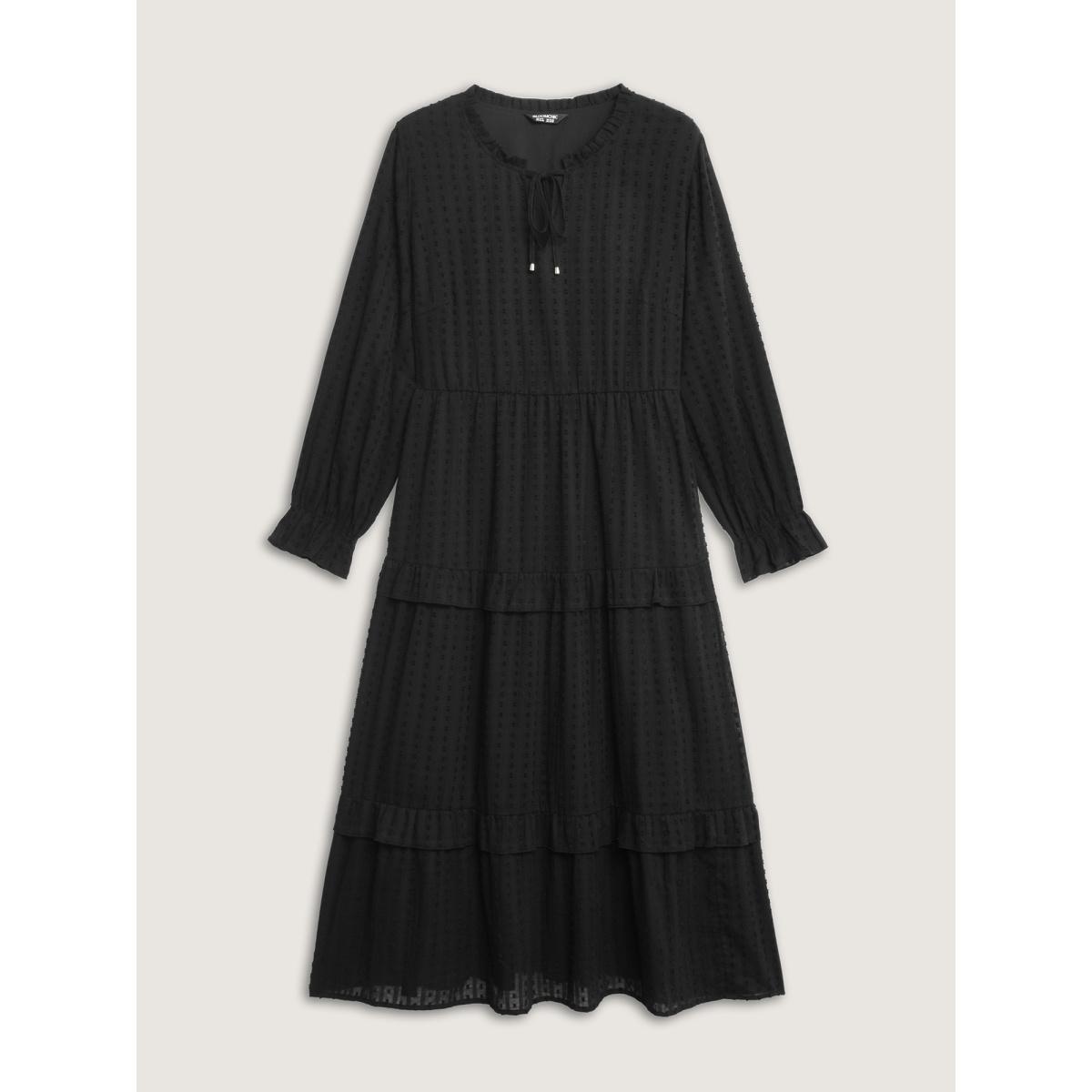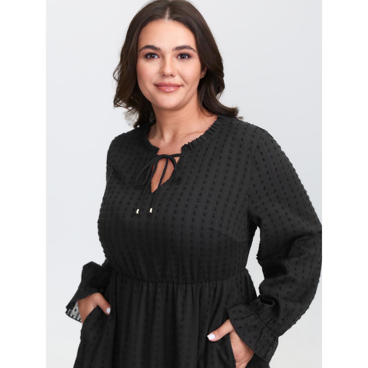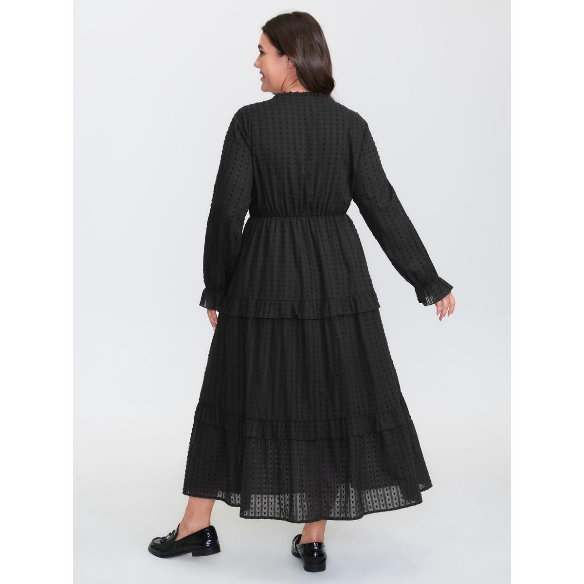 Plus Size Ruffled Tiered Drawstring Neckline Maxi Dress Black Women Leisure Tie knot Flat collar with V-notch Extra Long Sleeve Curvy BloomChic 12/L