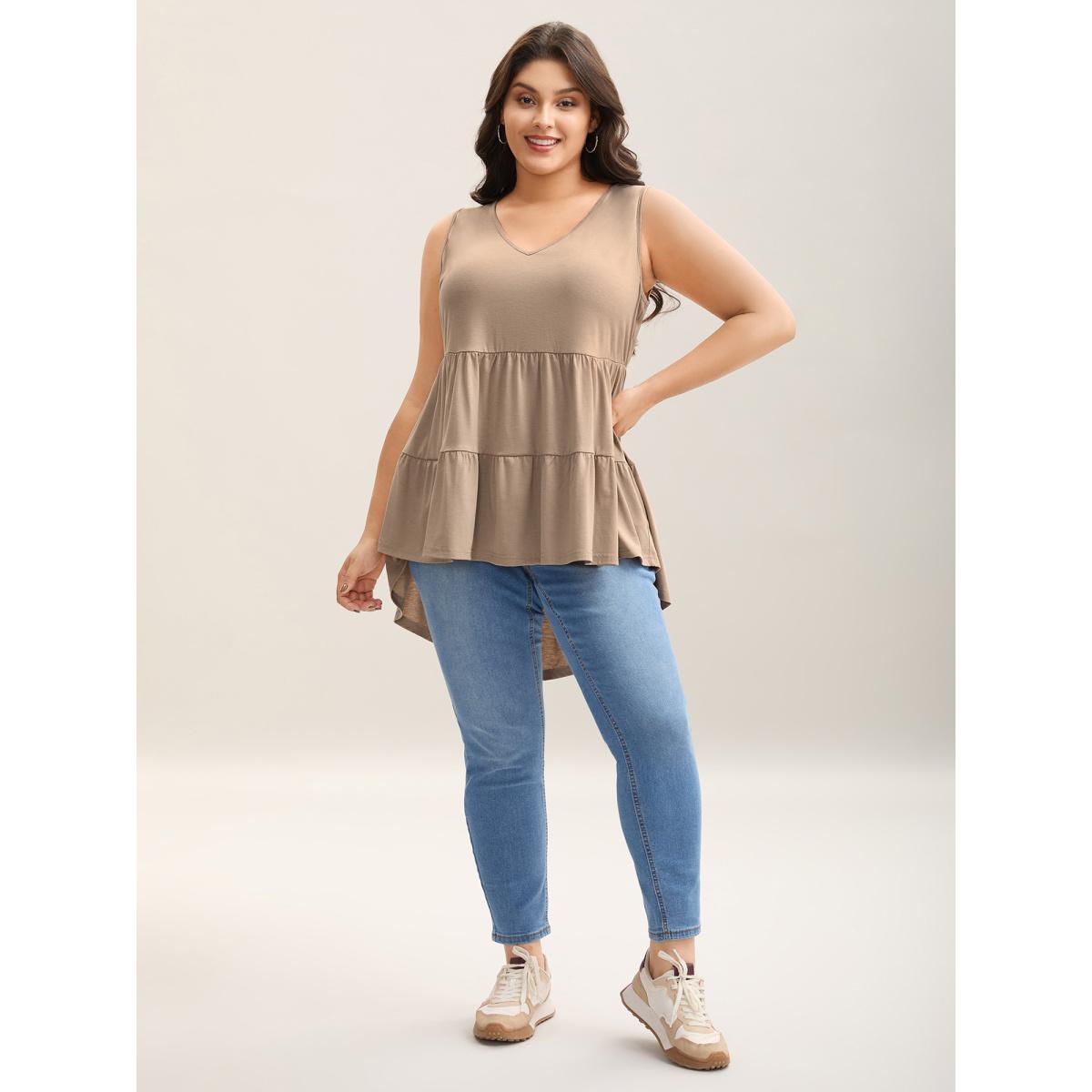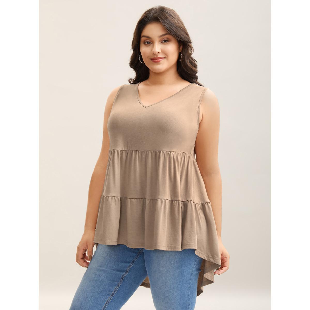 Plus Size Ruffled Tiered Long Tank Top Women Tan Gathered V-neck Everyday-Casual Tank Tops Camis BloomChic 22-24/3X