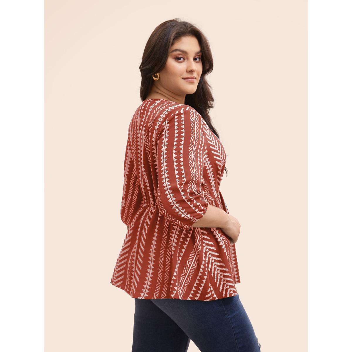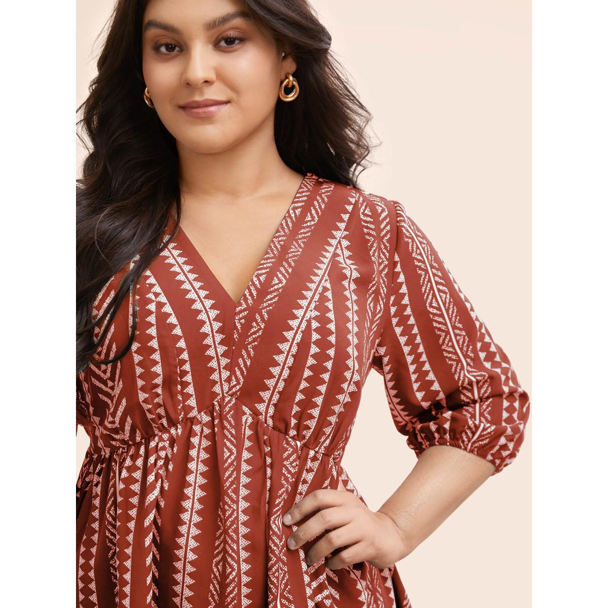Plus Size Russet Bandana Geometric Lantern Sleeve Gathered Blouse Women Resort Elbow-length sleeve V-neck Vacation Blouses BloomChic 22-24/3X