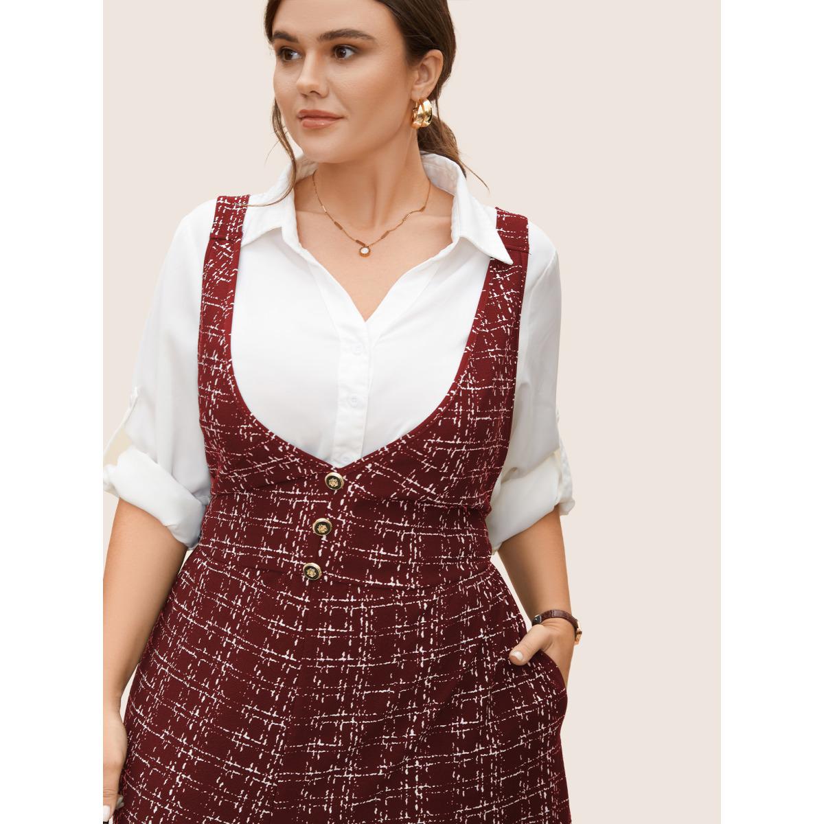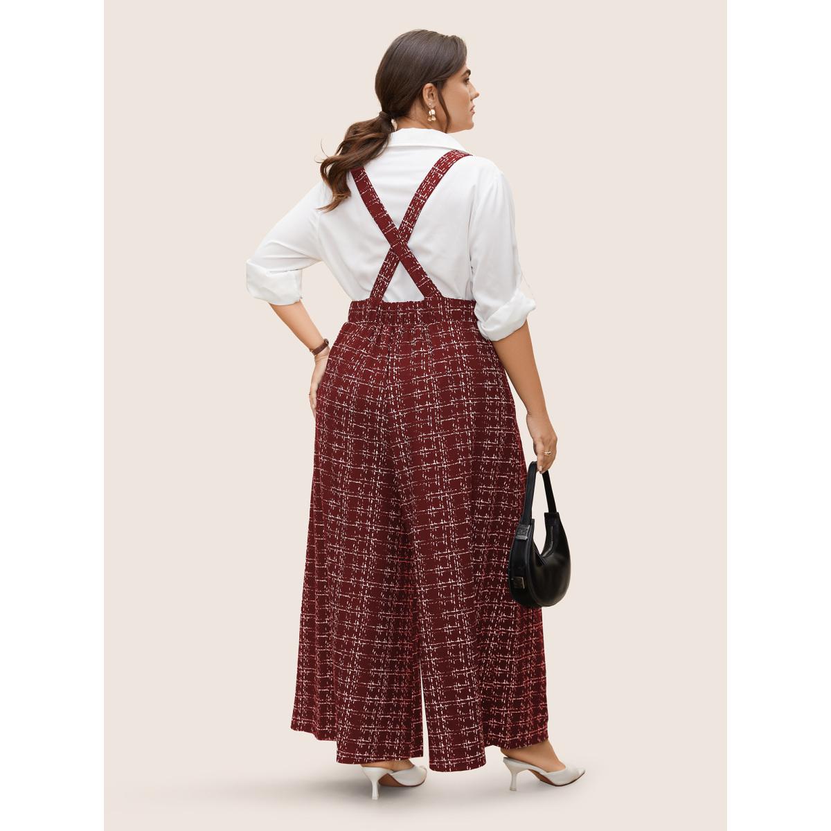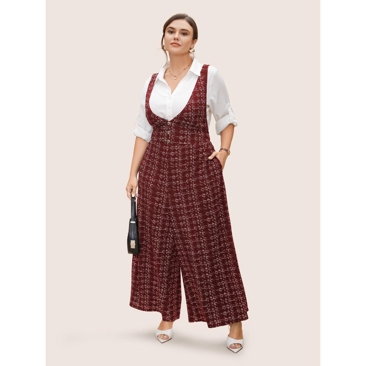Plus Size Russet Plaid Tweed Crisscross Back Button Detail Jumpsuit Women Work From Home Sleeveless Non Work Loose Jumpsuits BloomChic 28/5X