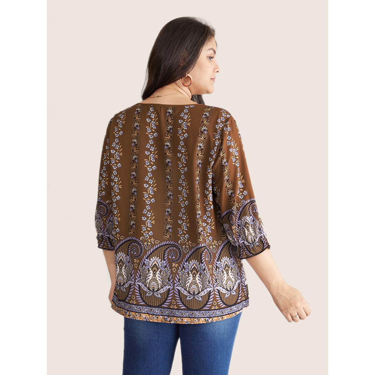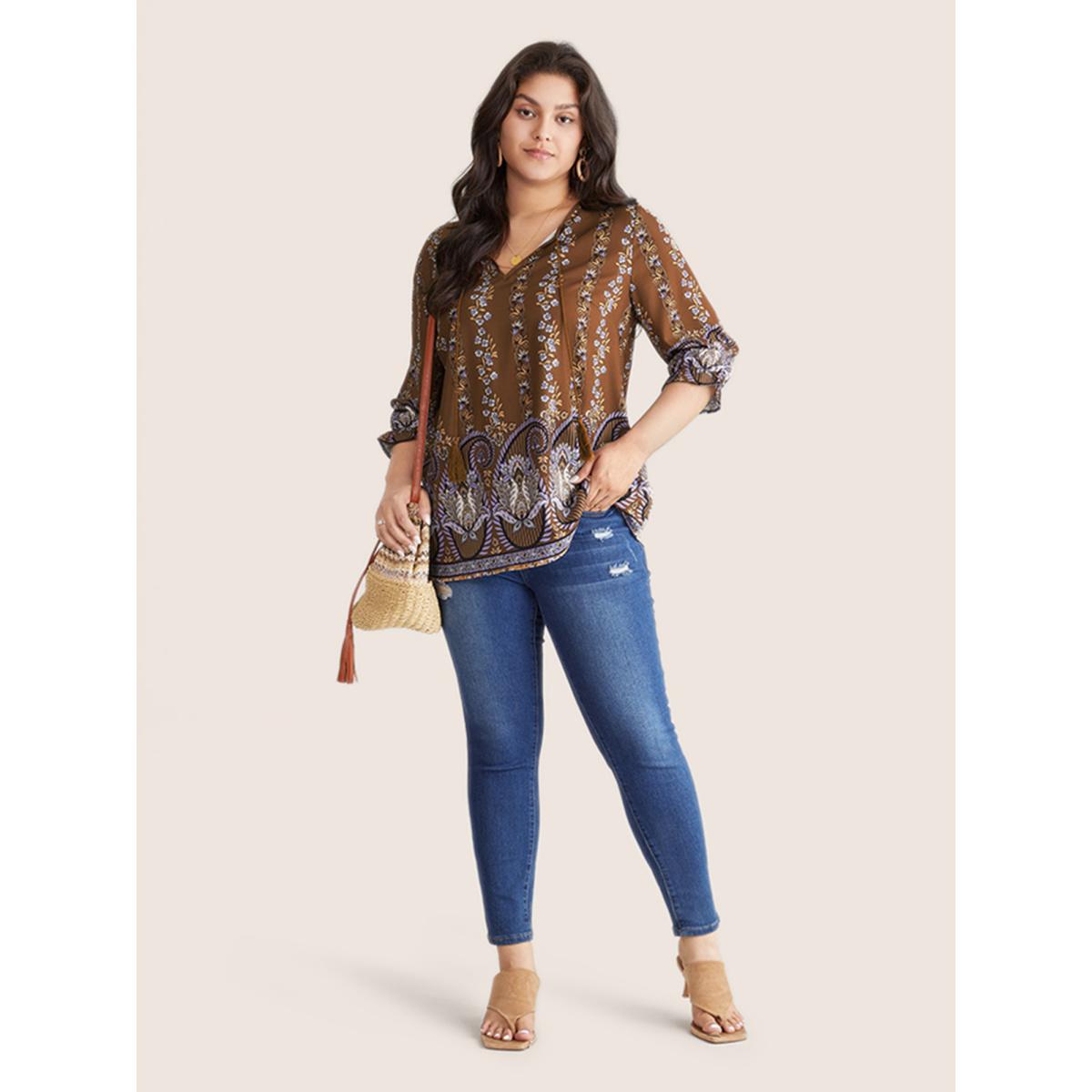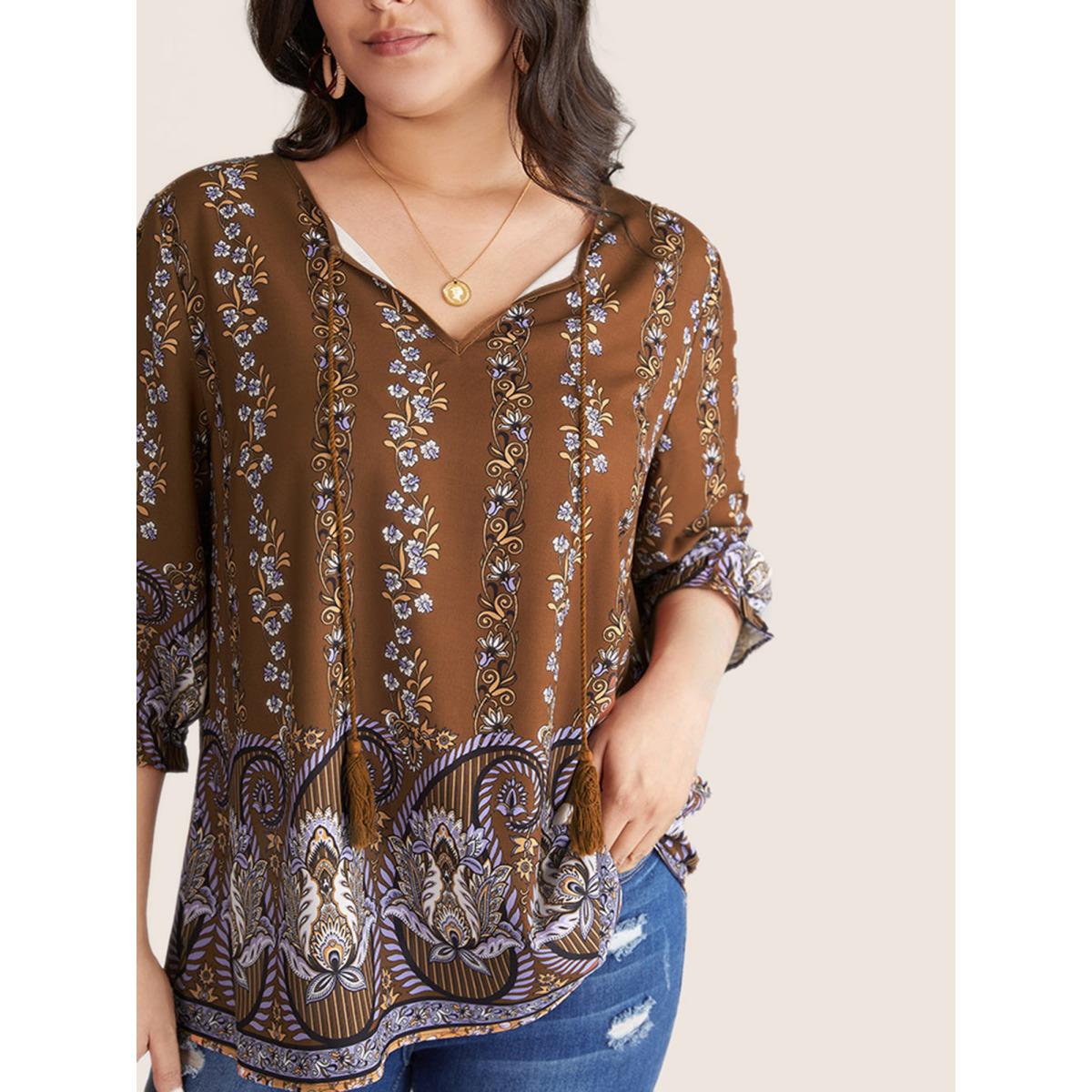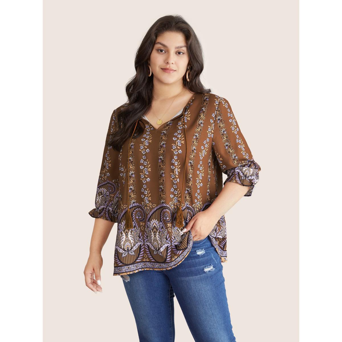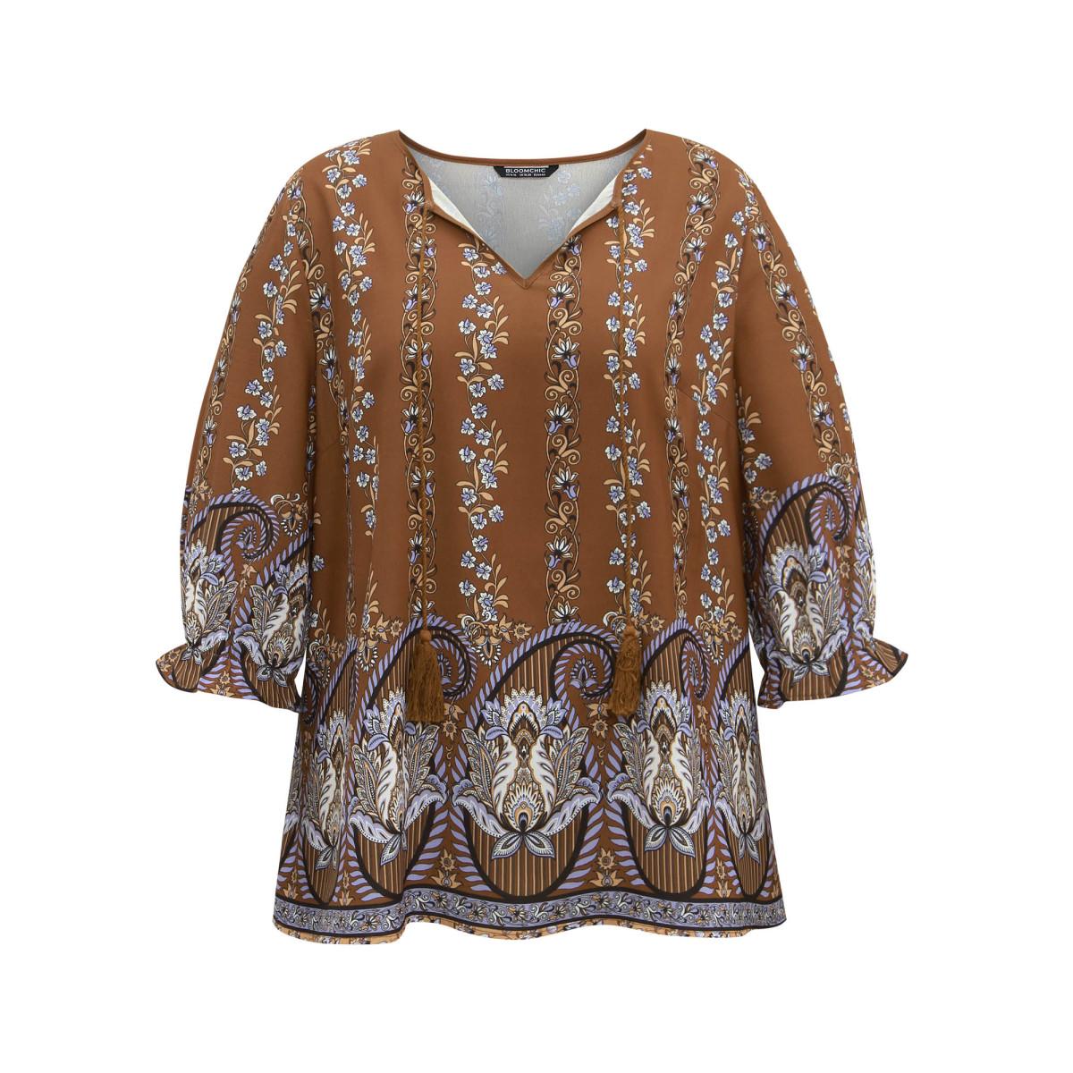 Plus Size Rust Bandana Print Tassels Ties Flutter Sleeve Blouse Women Vacation Elbow-length sleeve Tie Neck Vacation Blouses BloomChic 18-20/2X