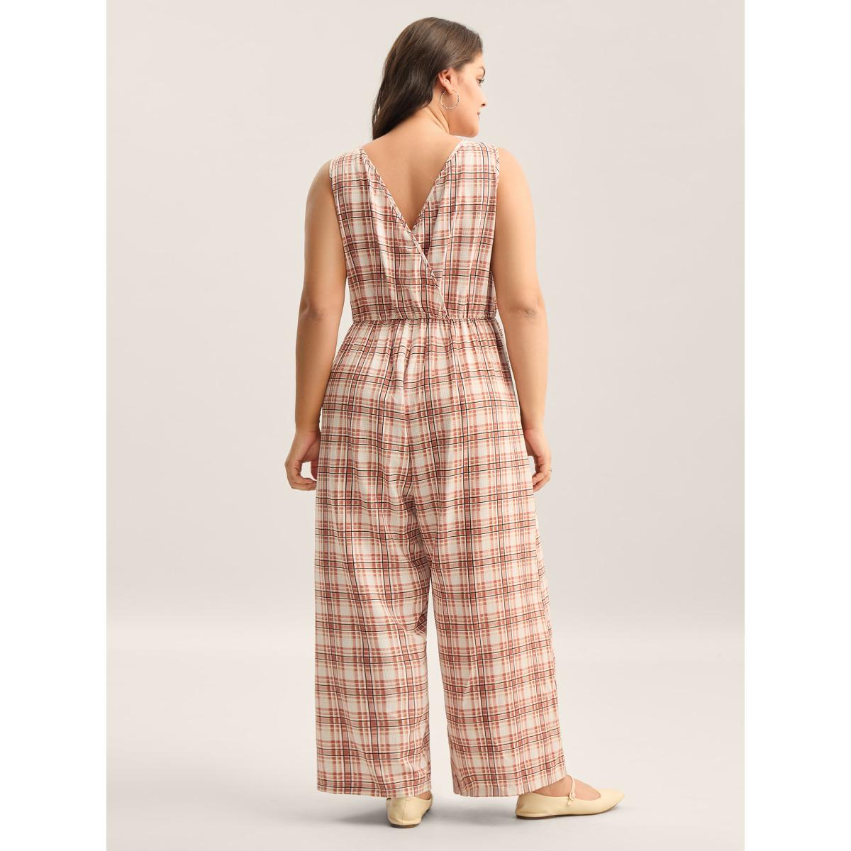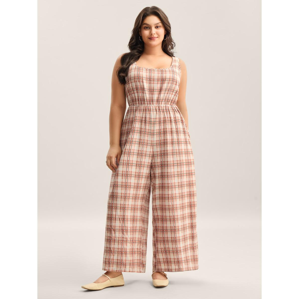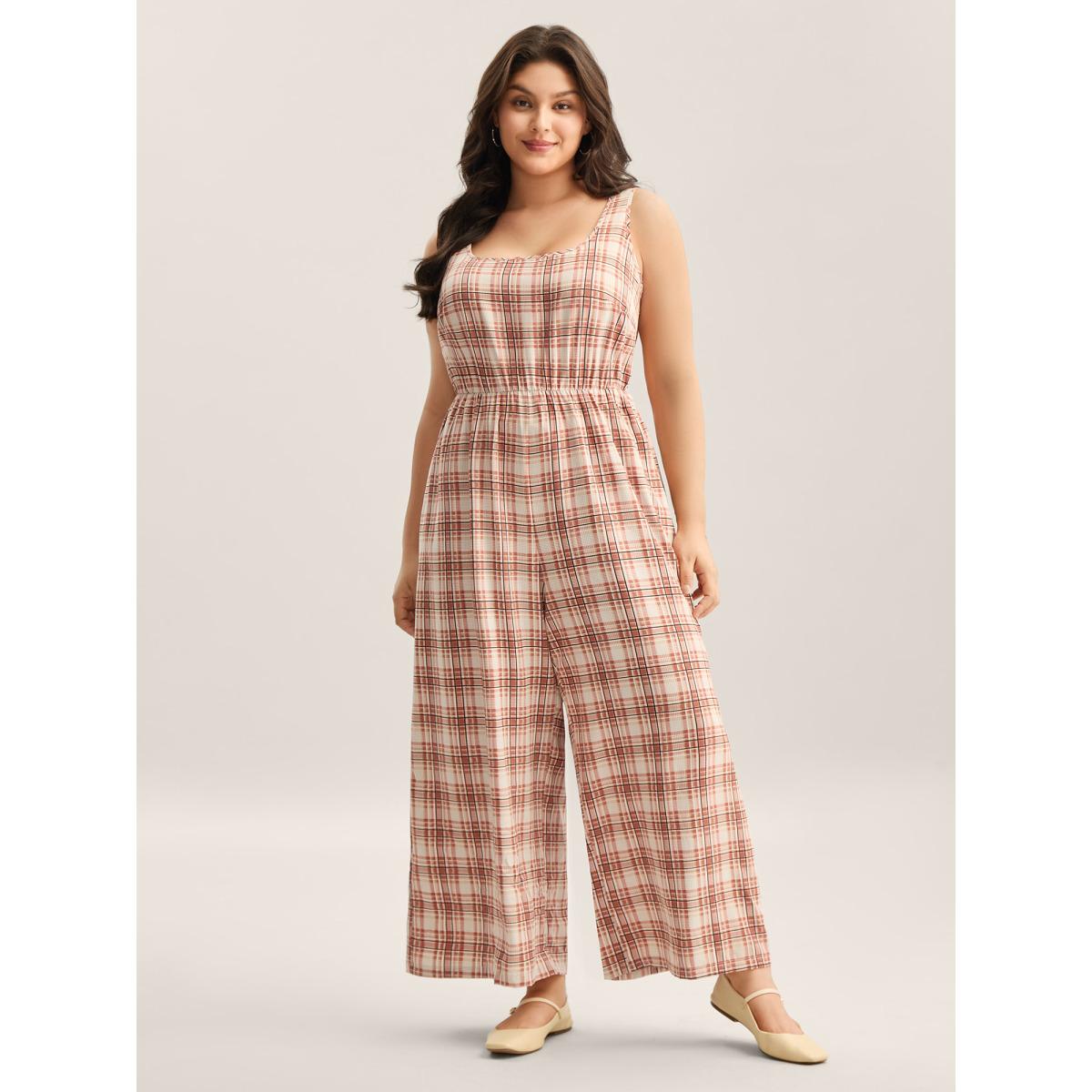 Plus Size Rust Plaid Pockets Wide-Leg Jumpsuit Women Sleeveless Square Neck Everyday-Casual Loose Jumpsuits BloomChic 12/L Product Image
