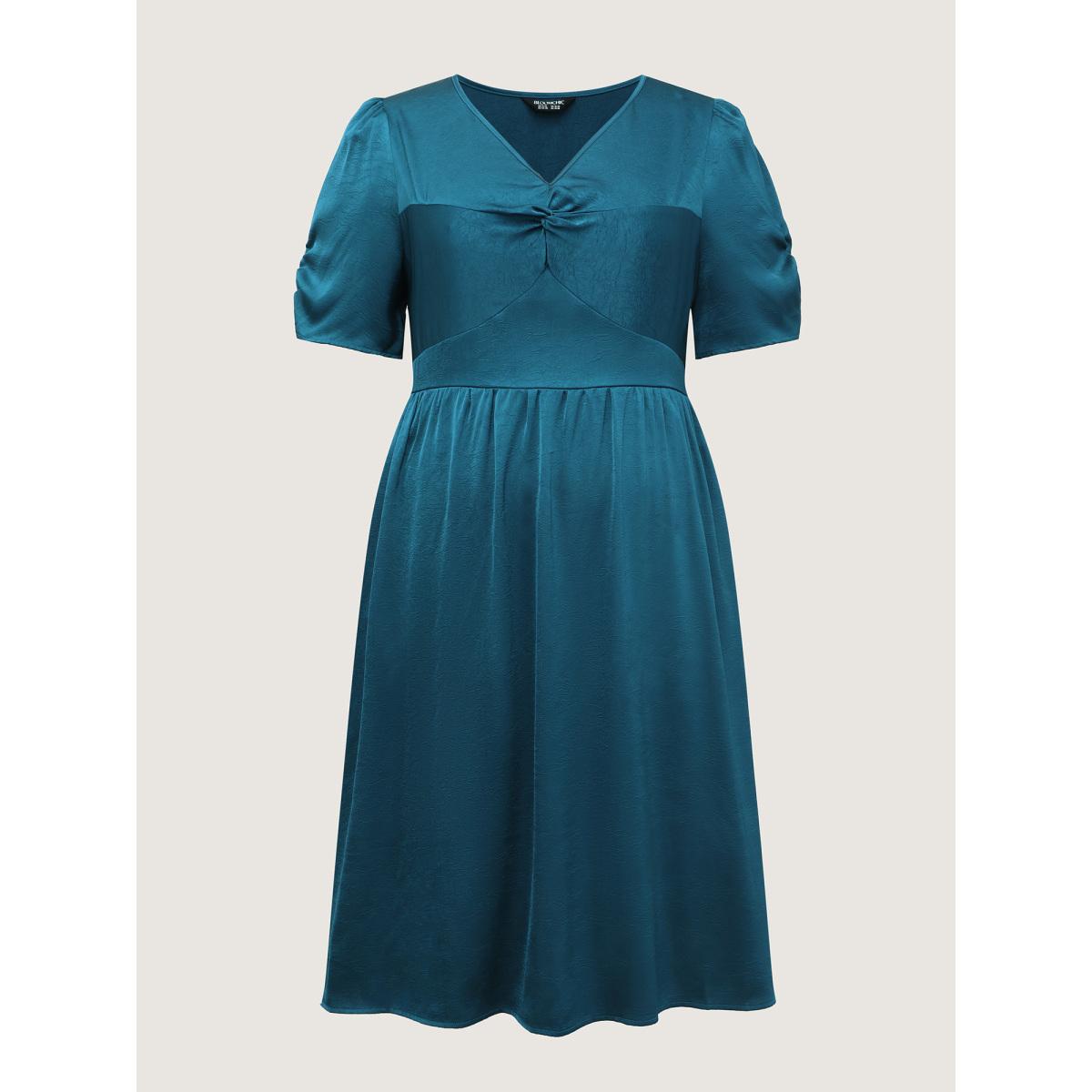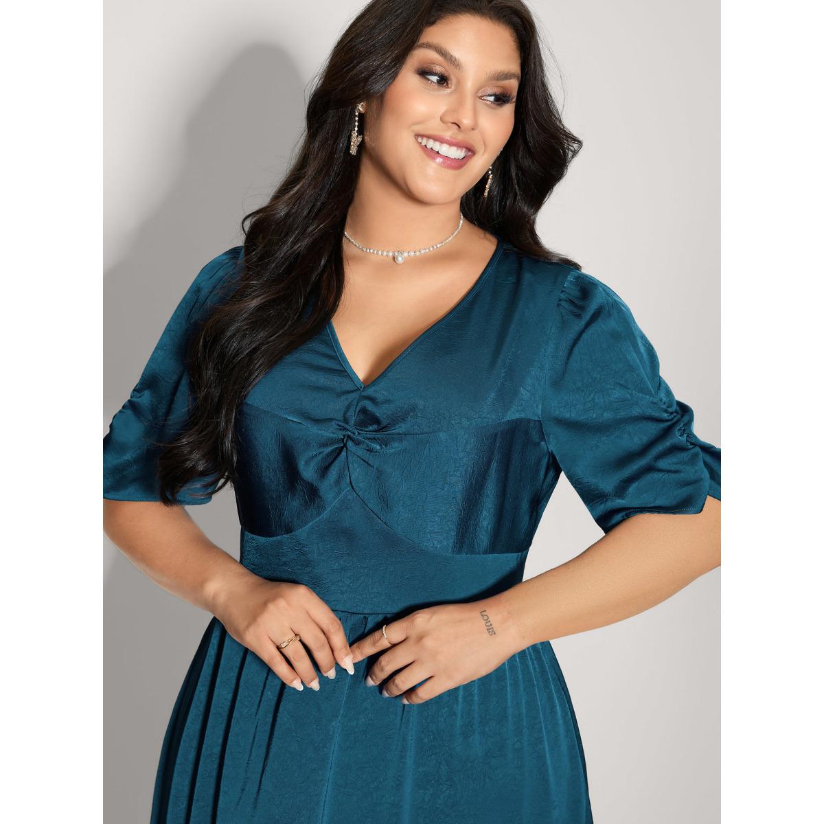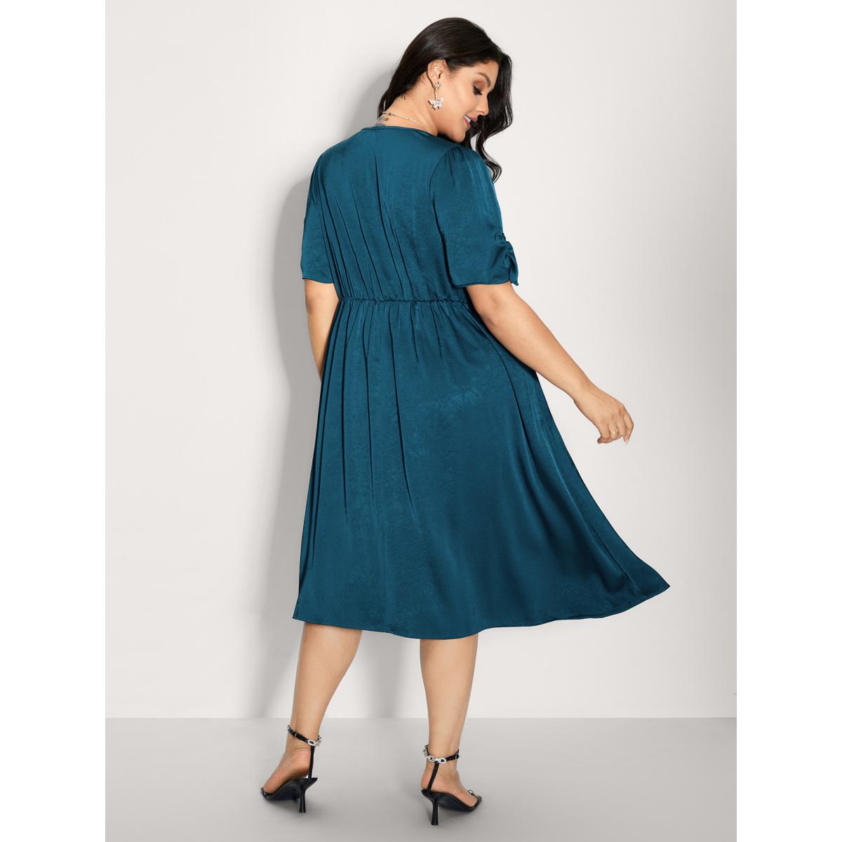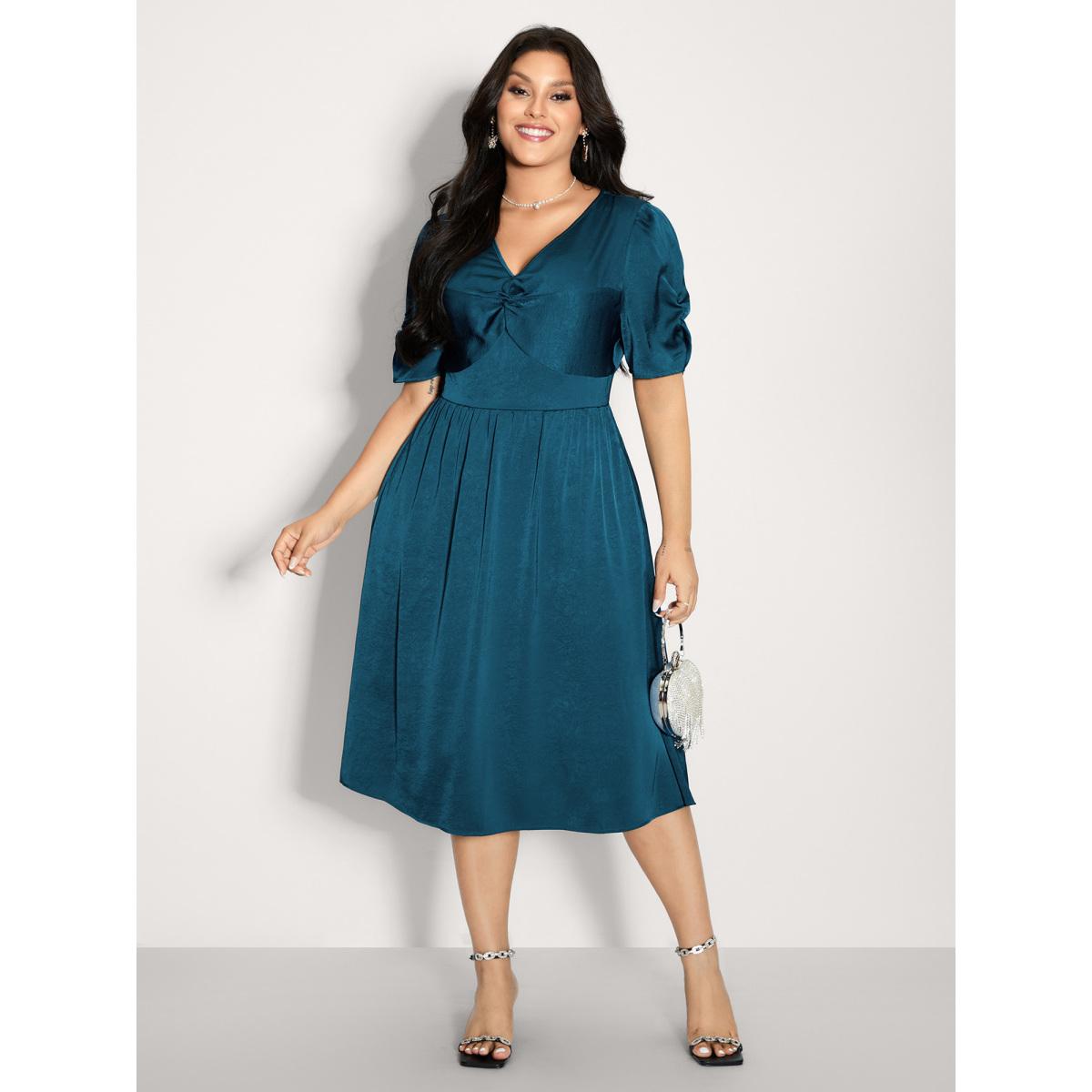 Plus Size Satin-Like Ruched Sleeve Midi Dress Aegean Women Formal Twist V-neck Half Sleeve Curvy BloomChic 12/L