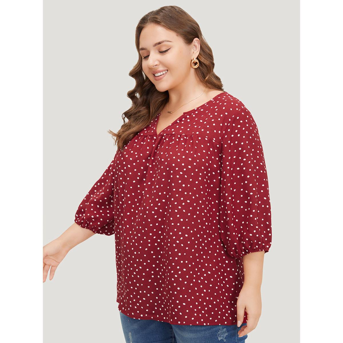 Plus Size Scarlet Polka Dot Notched Plicated Detail Lantern Sleeve Blouse Women Elegant Elbow-length sleeve Notched collar Dailywear Blouses BloomChic 22-24/3X