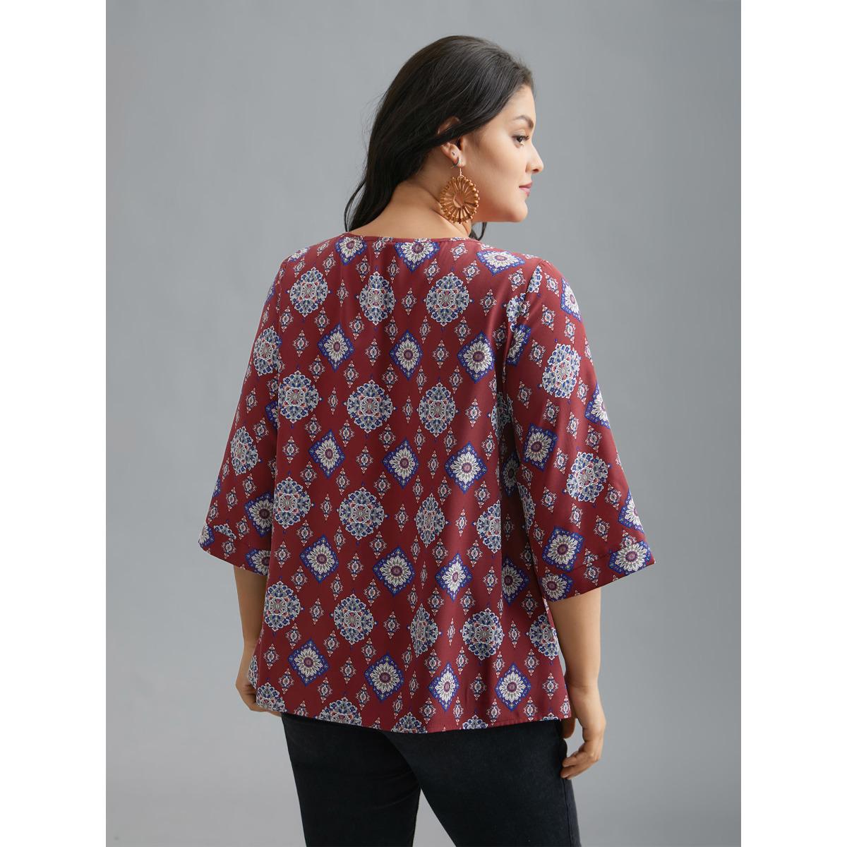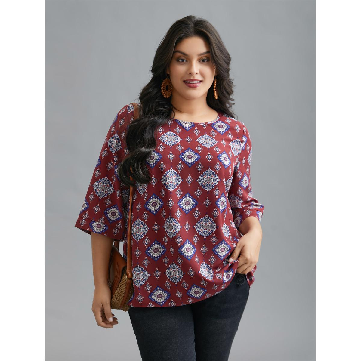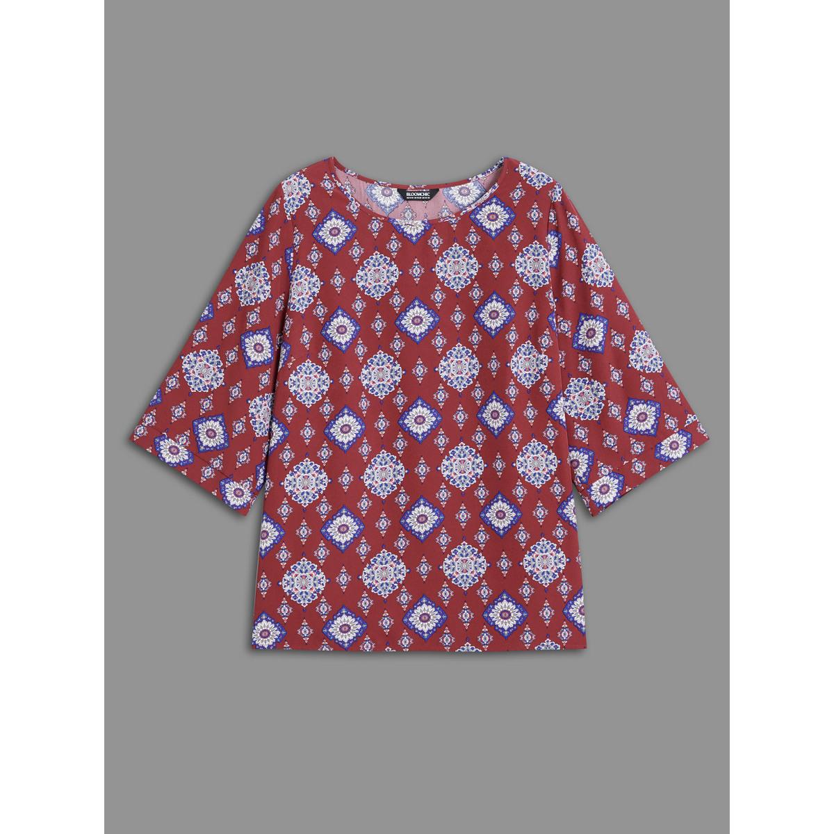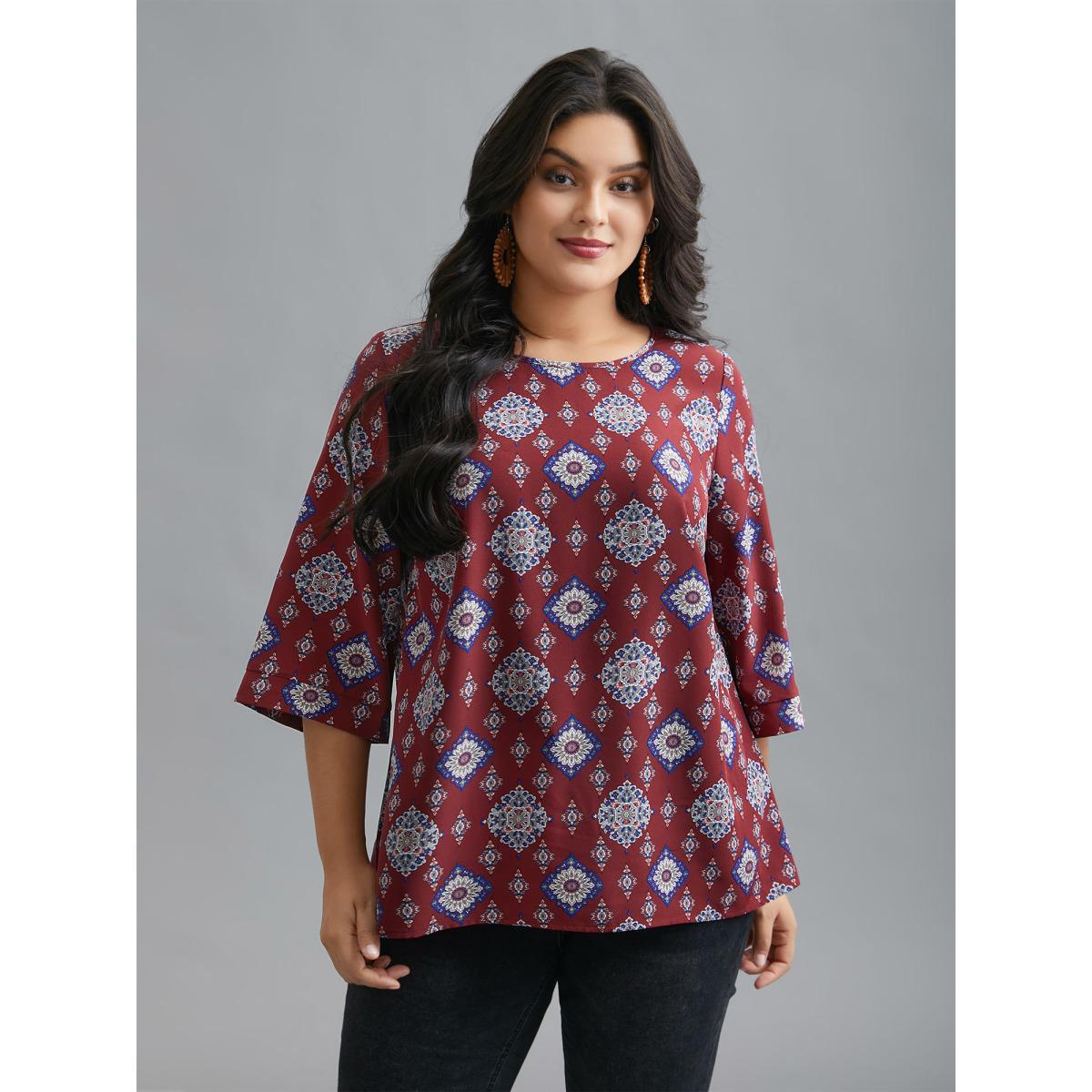 Plus Size Scarlet Round Neck Bandana Print Blouse Women Resort Elbow-length sleeve Round Neck Vacation Blouses BloomChic 22-24/3X