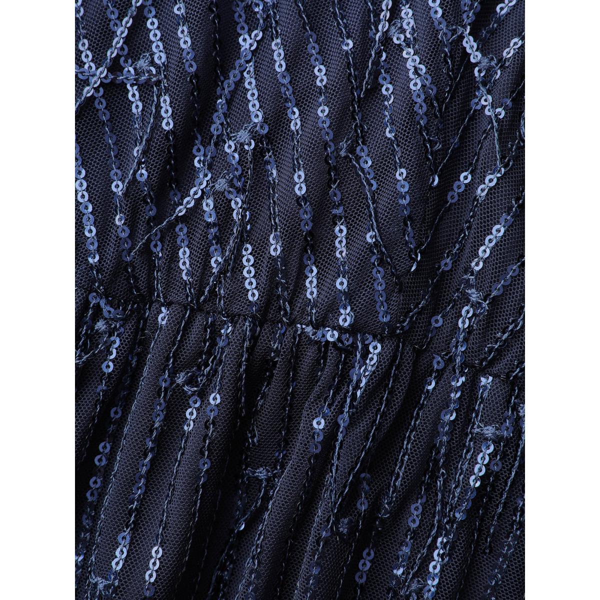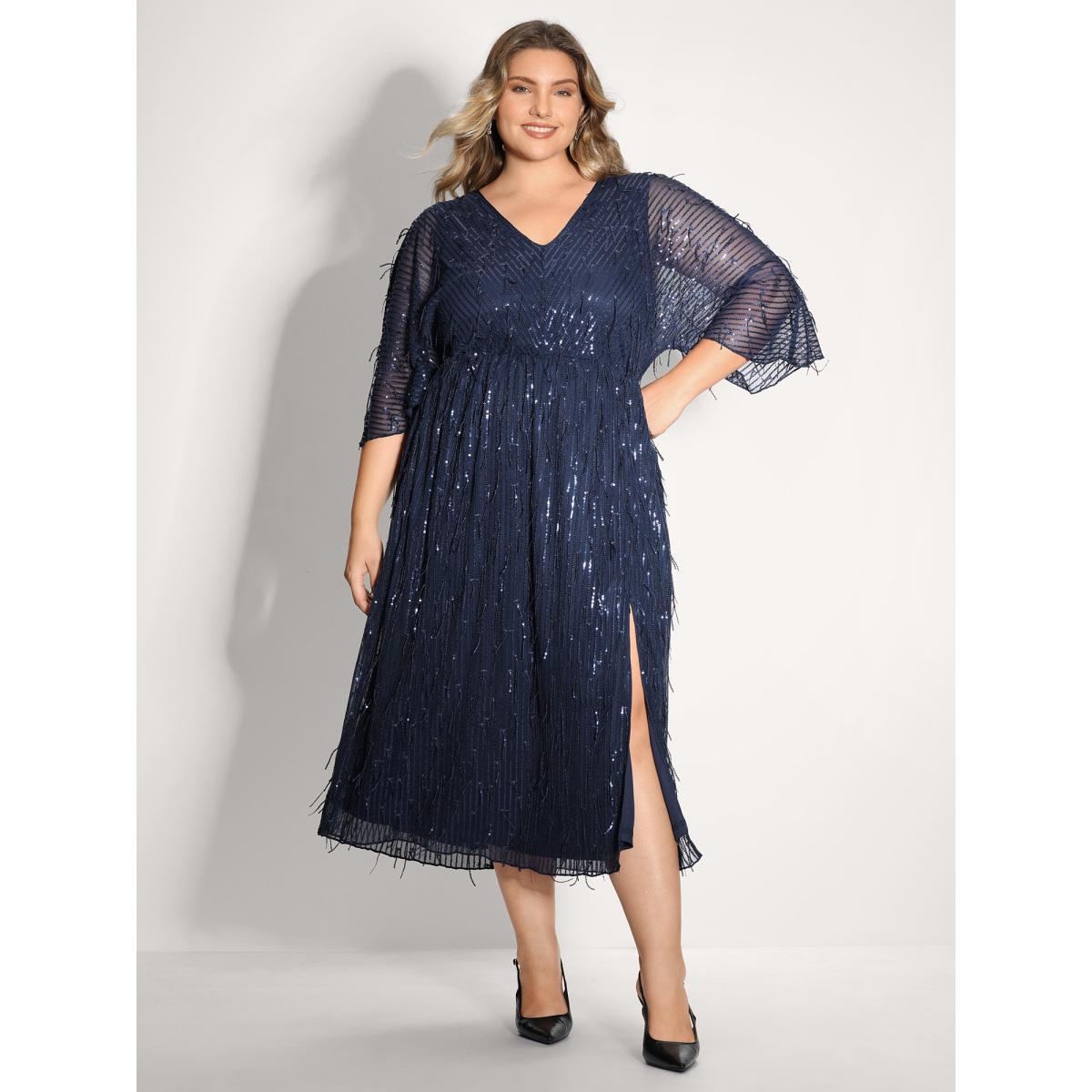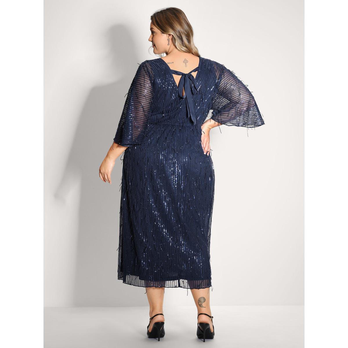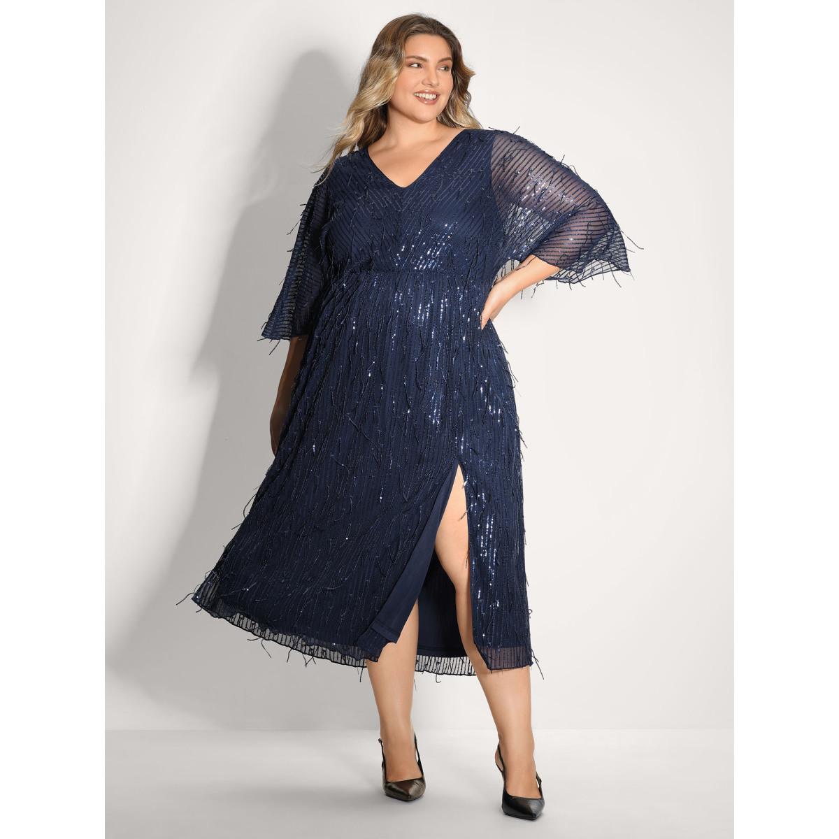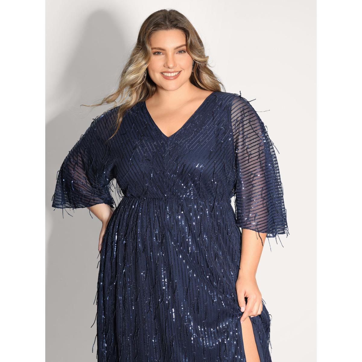 Plus Size Sequin Lace High Slit Backless Maxi Dress DarkBlue Women Party&Cocktail V-neck Elbow-length sleeve Curvy BloomChic 14-16/1X